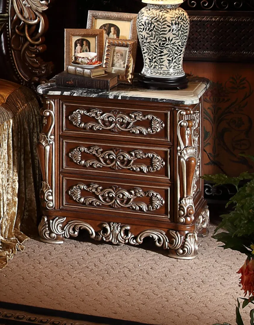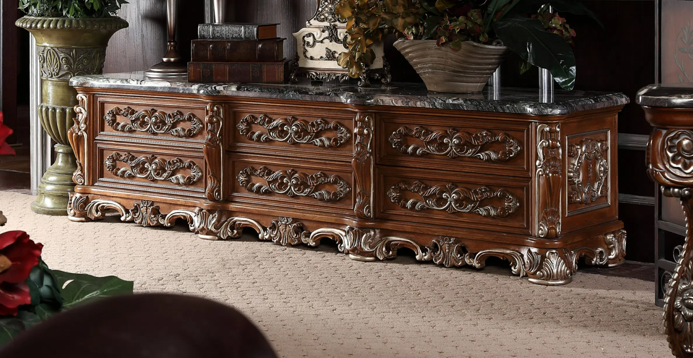 Особую привлекательность придает изысканный резной орнамент, вручную подчеркнутый деликатной патиной. Этот прием создает эффект старинной отделки, усиливая классический характер комода.