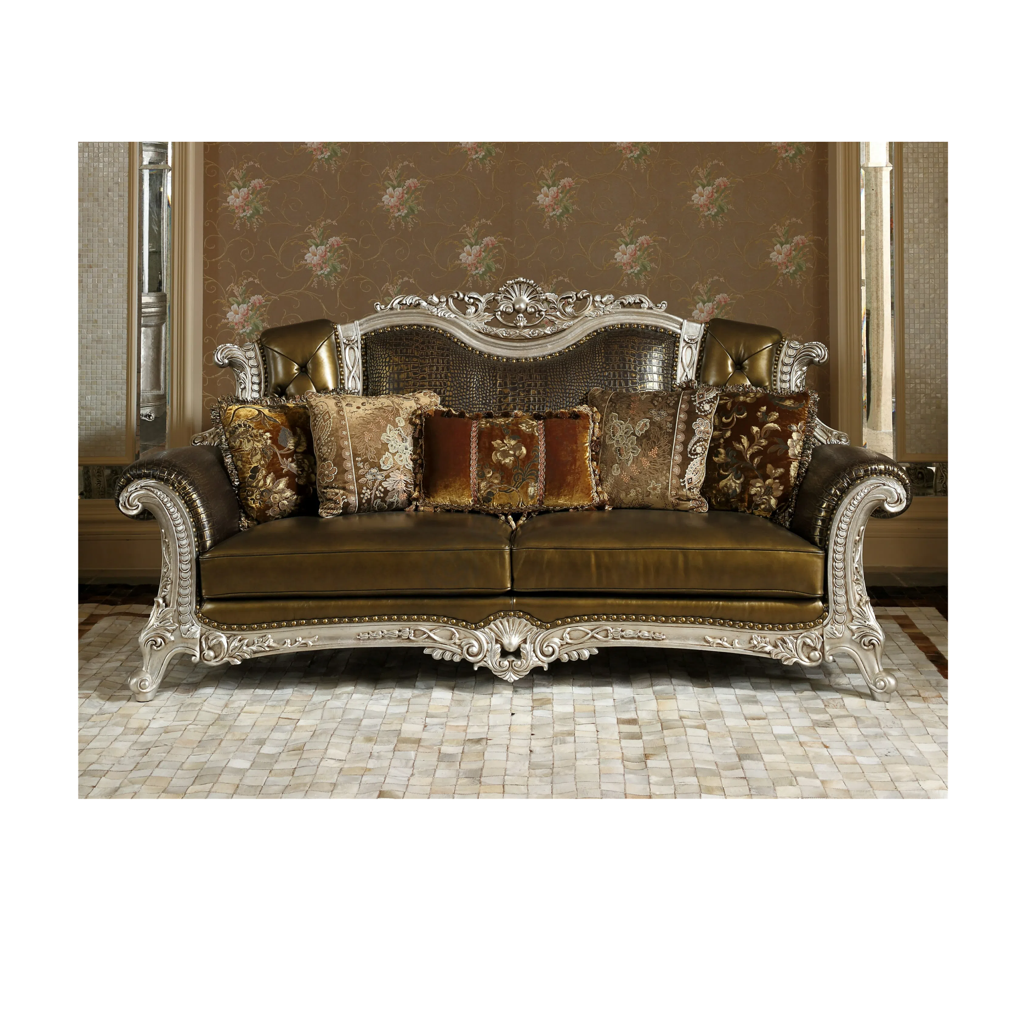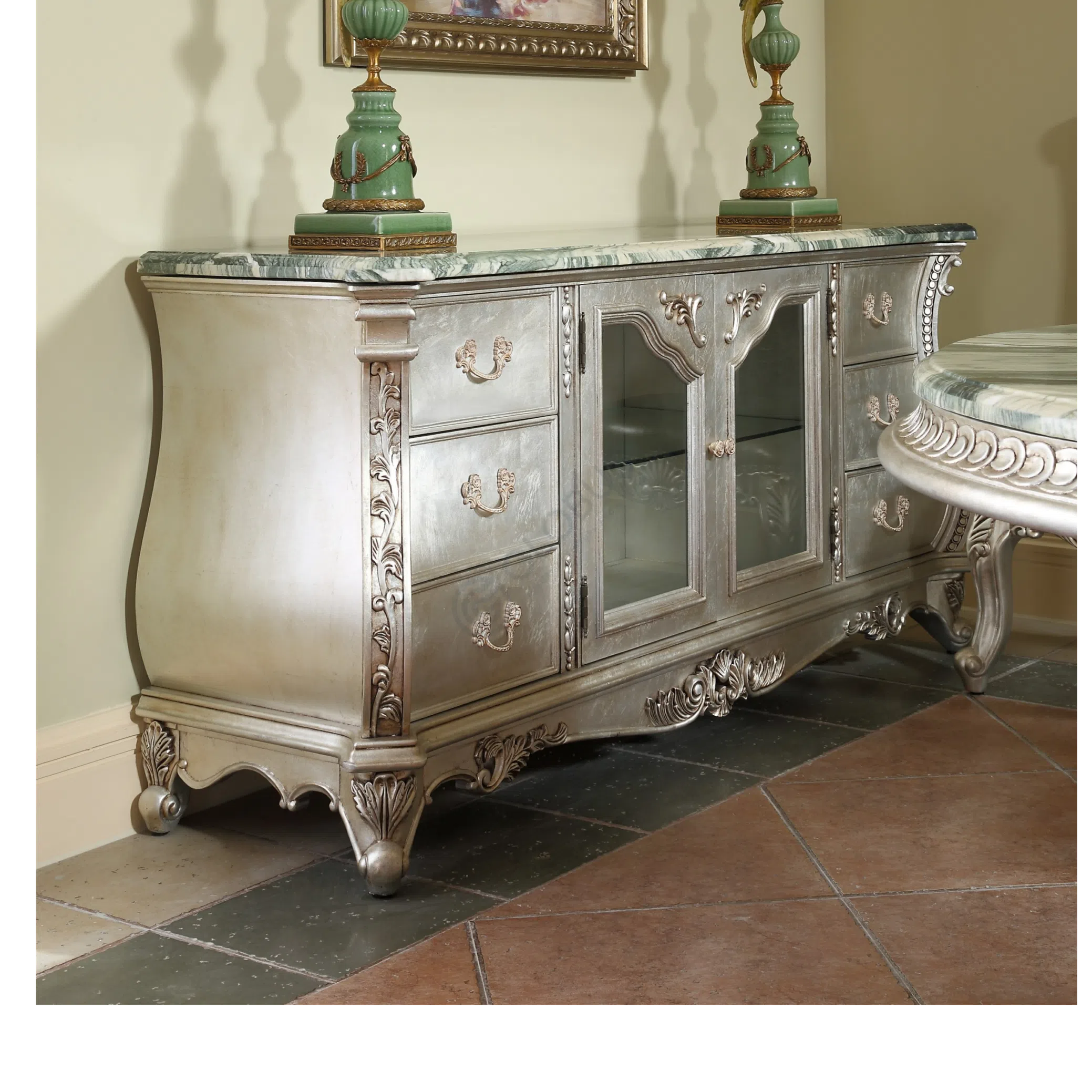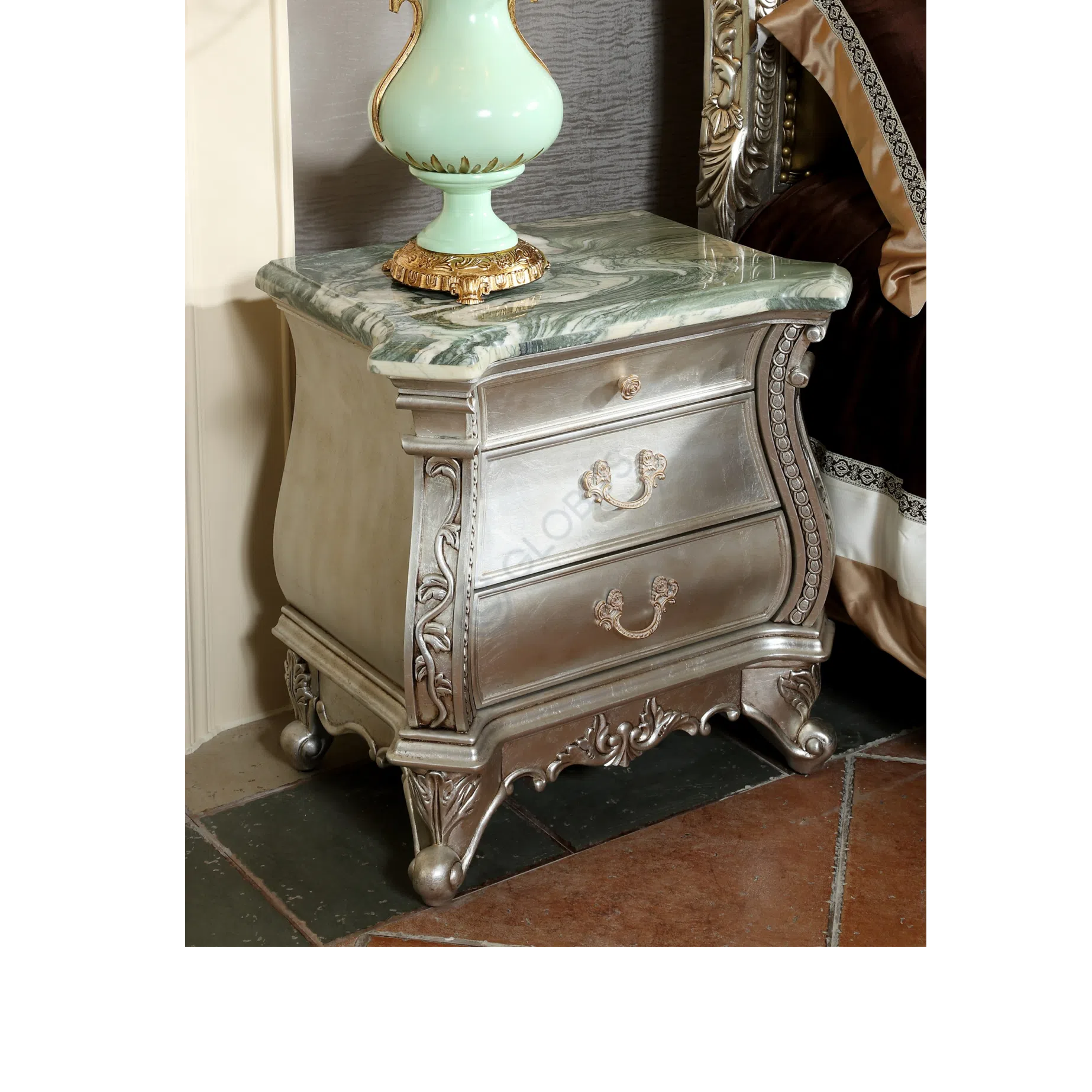 Каркас выполнен из массива дерева, отличающегося прочностью и долговечностью. Он украшен изящной ручной резьбой, подчеркивающей благородство форм. Деликатный эффект патинирования придает поверхности винтажный шарм и глубину.