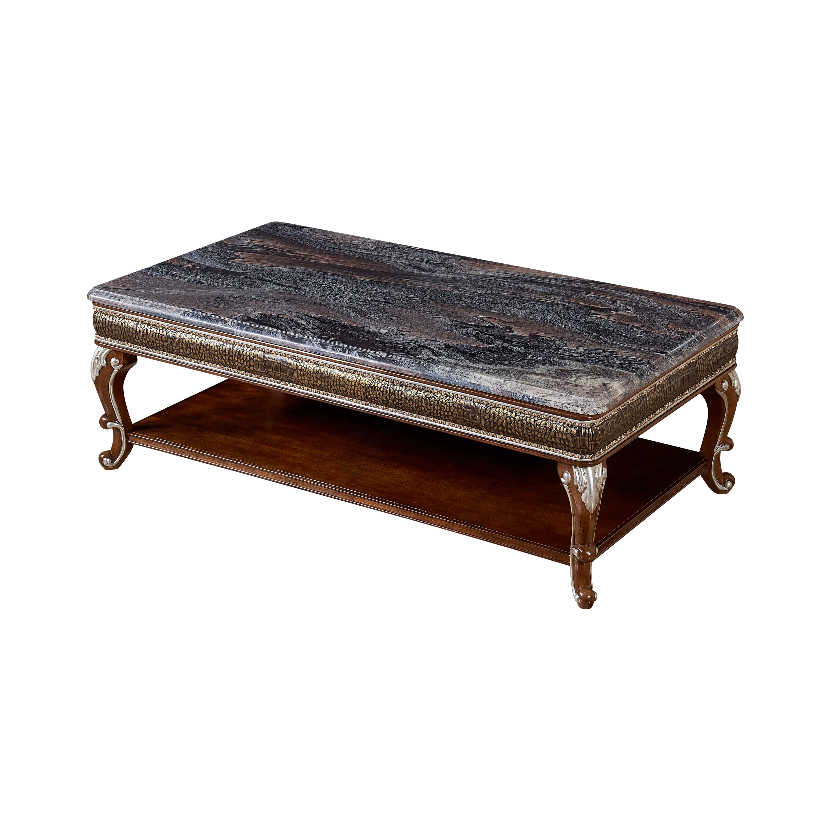 Основание столика выполнено из натурального дерева с применением шпона и фанеры, что обеспечивает прочность и долговечность конструкции. Изогнутые ножки, типичные для классического стиля, украшены деликатной резьбой и подчеркнуты патиной, которая придает отделке винтажный оттенок и выявляет красоту форм. Темный тон дерева контрастирует с более светлой отделкой резных элементов, подчеркивая их изящество.