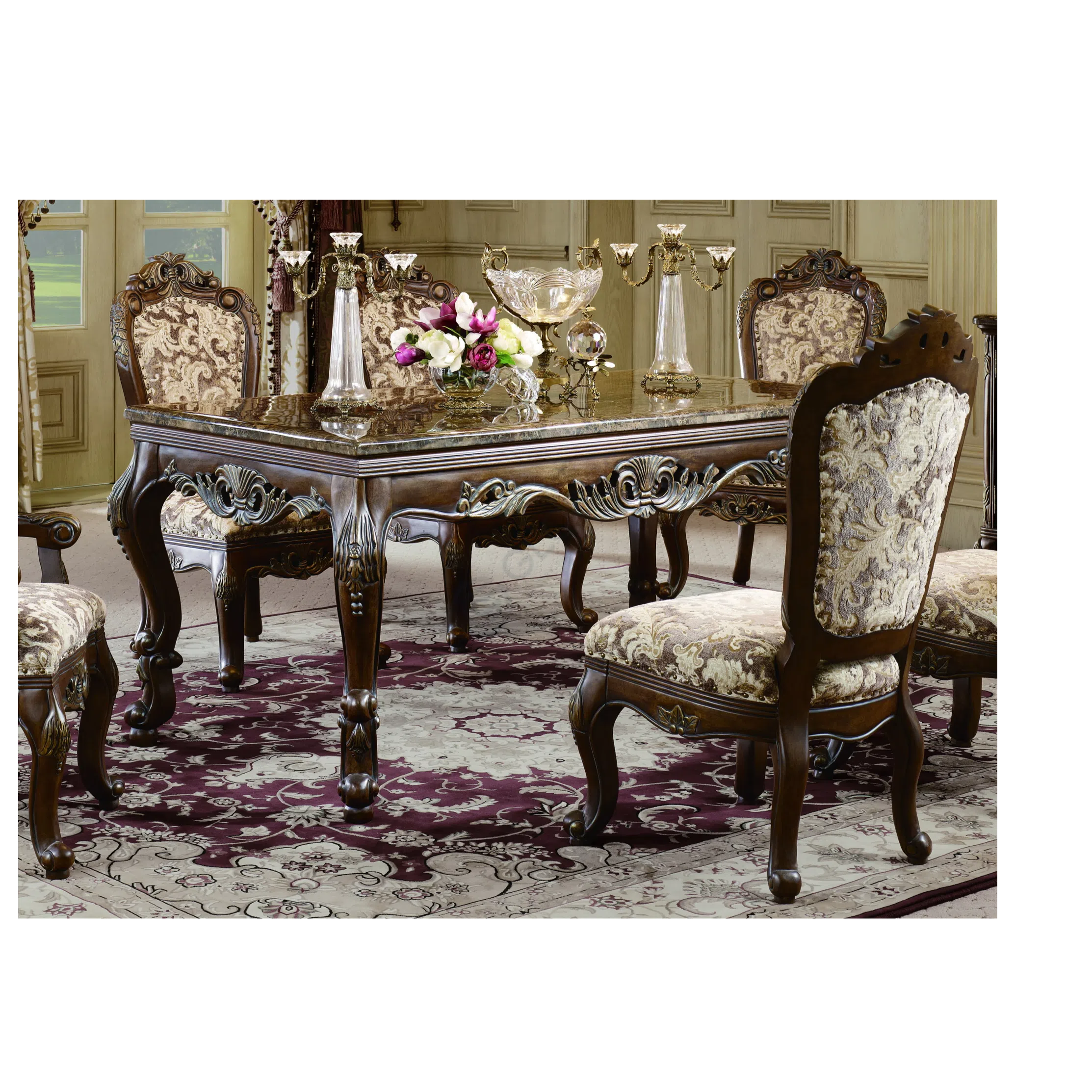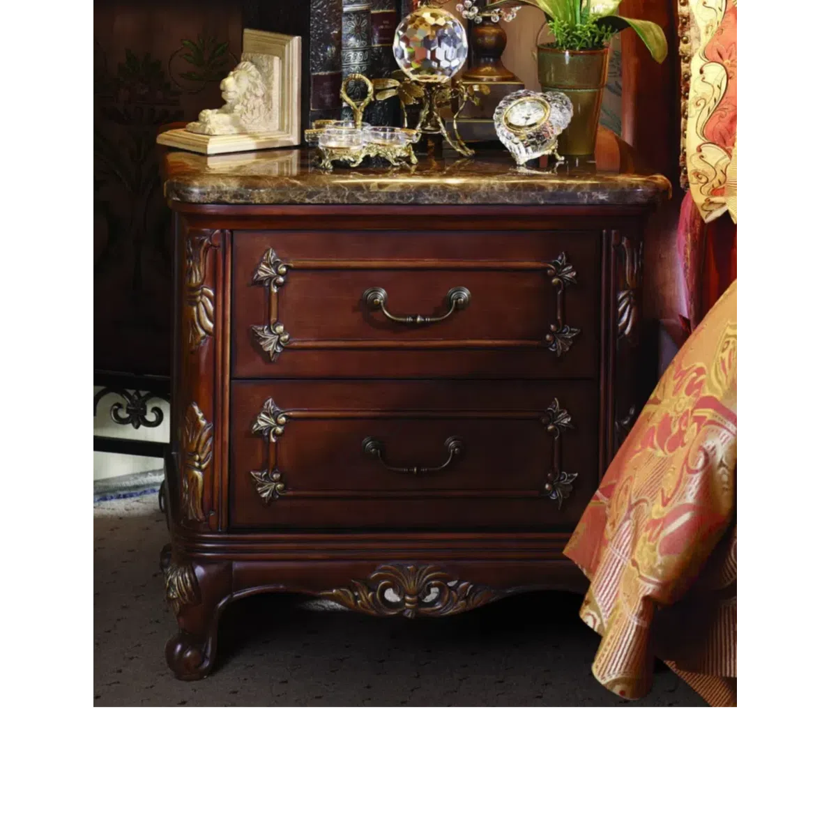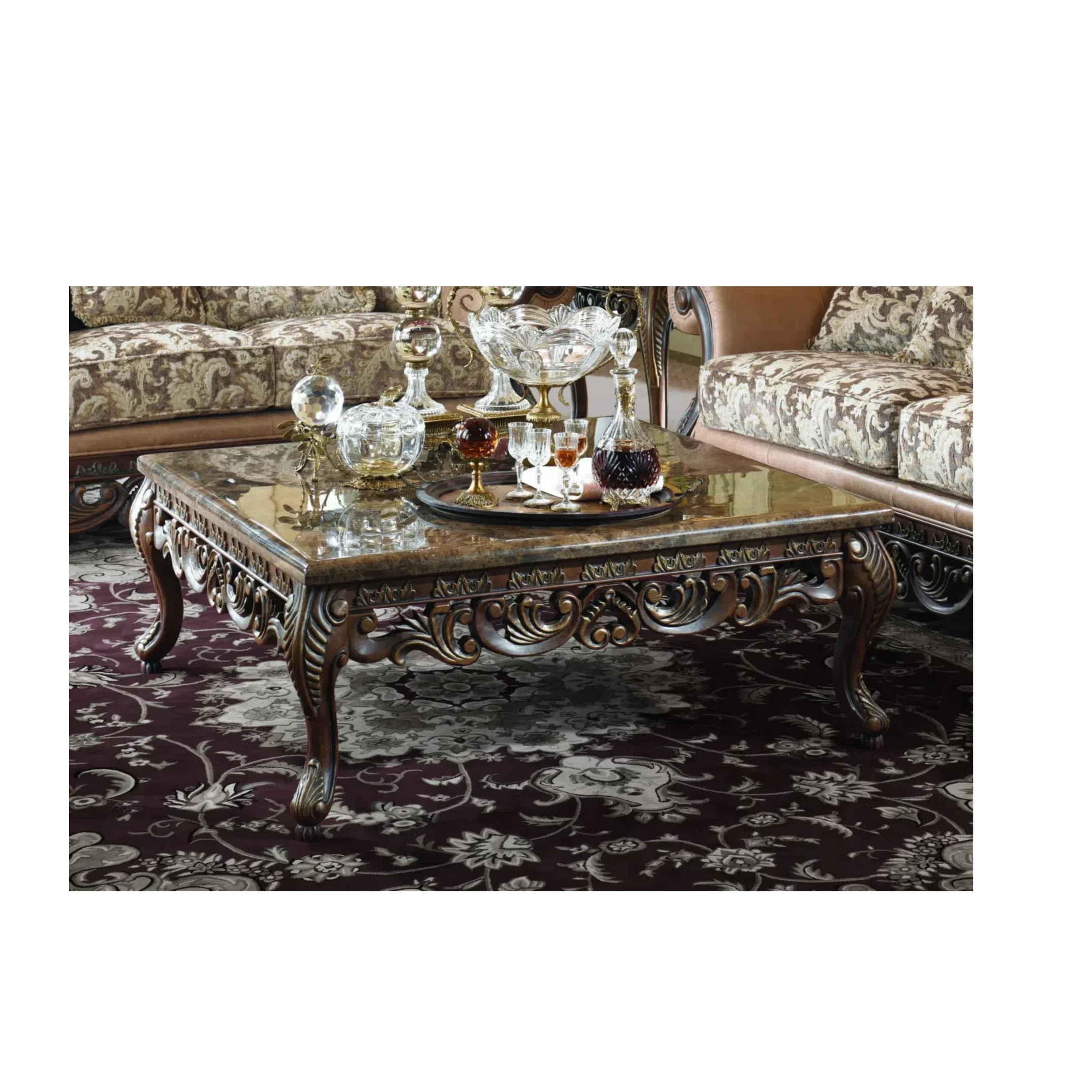 Основание предмета выполнено из ценных пород натурального дерева, искусно обработанного талантливыми мастерами. Глубокие рельефные узоры и орнаменты выделены тонким нанесением патины, что придает мебели эффект старины и особую выразительность каждому элементу декора.