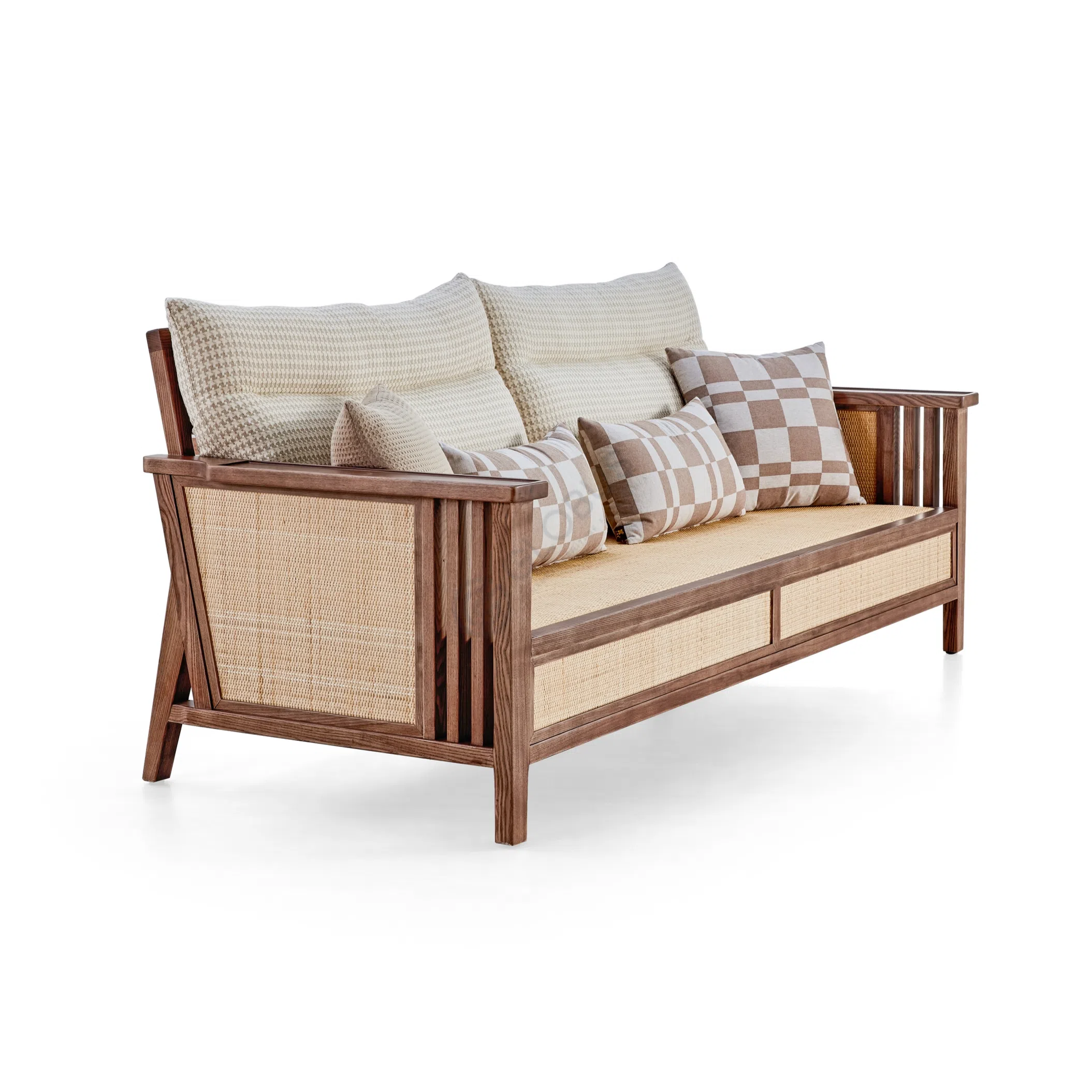 Объемные подушки с обивкой из качественного текстиля обеспечивают исключительный комфорт. Основная ткань с мелким узором гармонирует с декоративным элементом, украшенным геометрическим рисунком, создавая завершенный и выразительный образ.