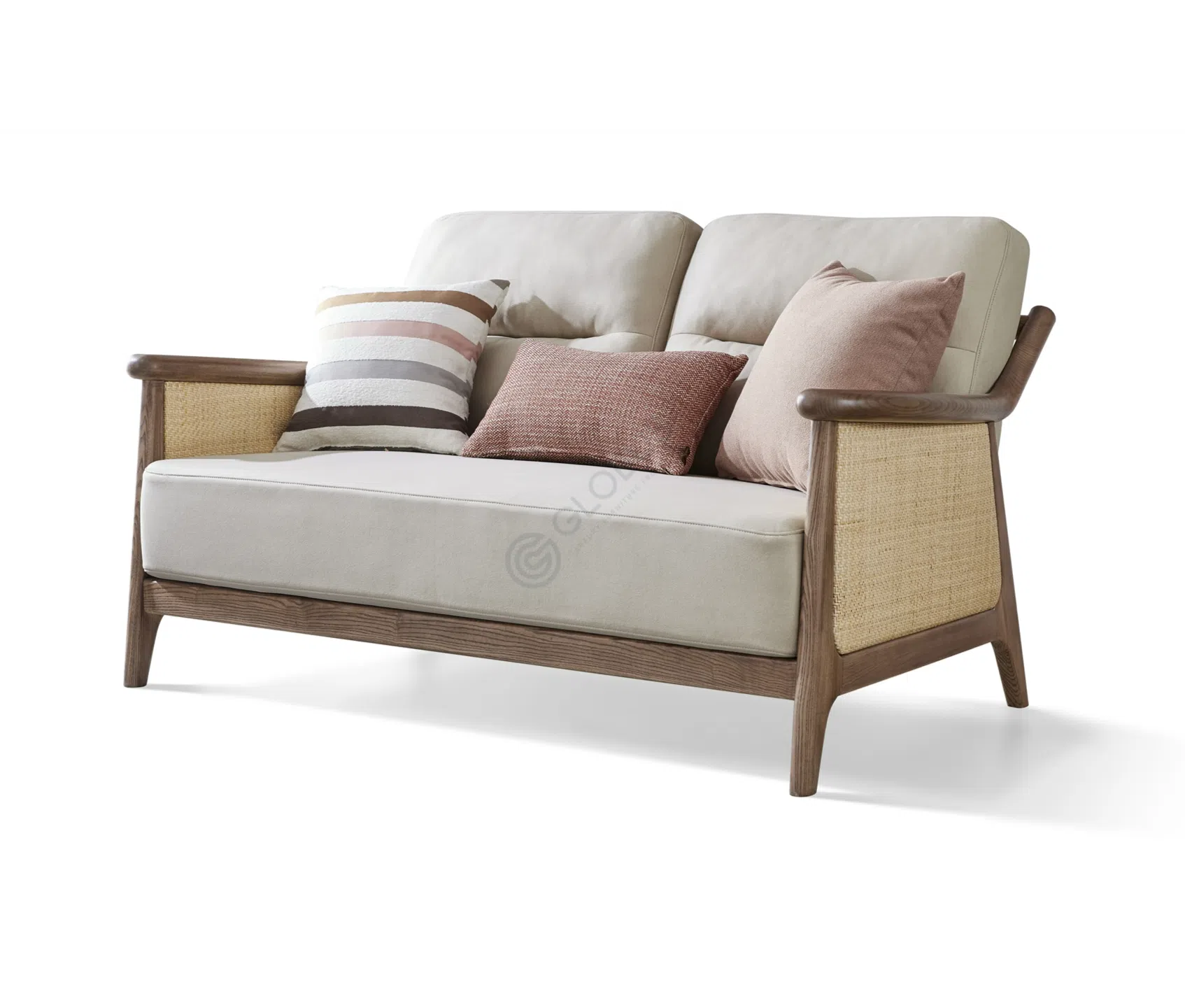 Каркас, выполненный из отборного натурального дерева, поражает чистотой линий и безупречной отделкой, формируя прочную и легкую основу. Боковые грани украшены искусными вставками из плетеного ротанга, которые придают изделию характерную текстуру и тонкий намек на азиатский стиль. Мягкие, объемные подушки, обтянутые высококачественным текстилем нежного оттенка, обещают непревзойденный комфорт и приглашают к умиротворенному отдыху.