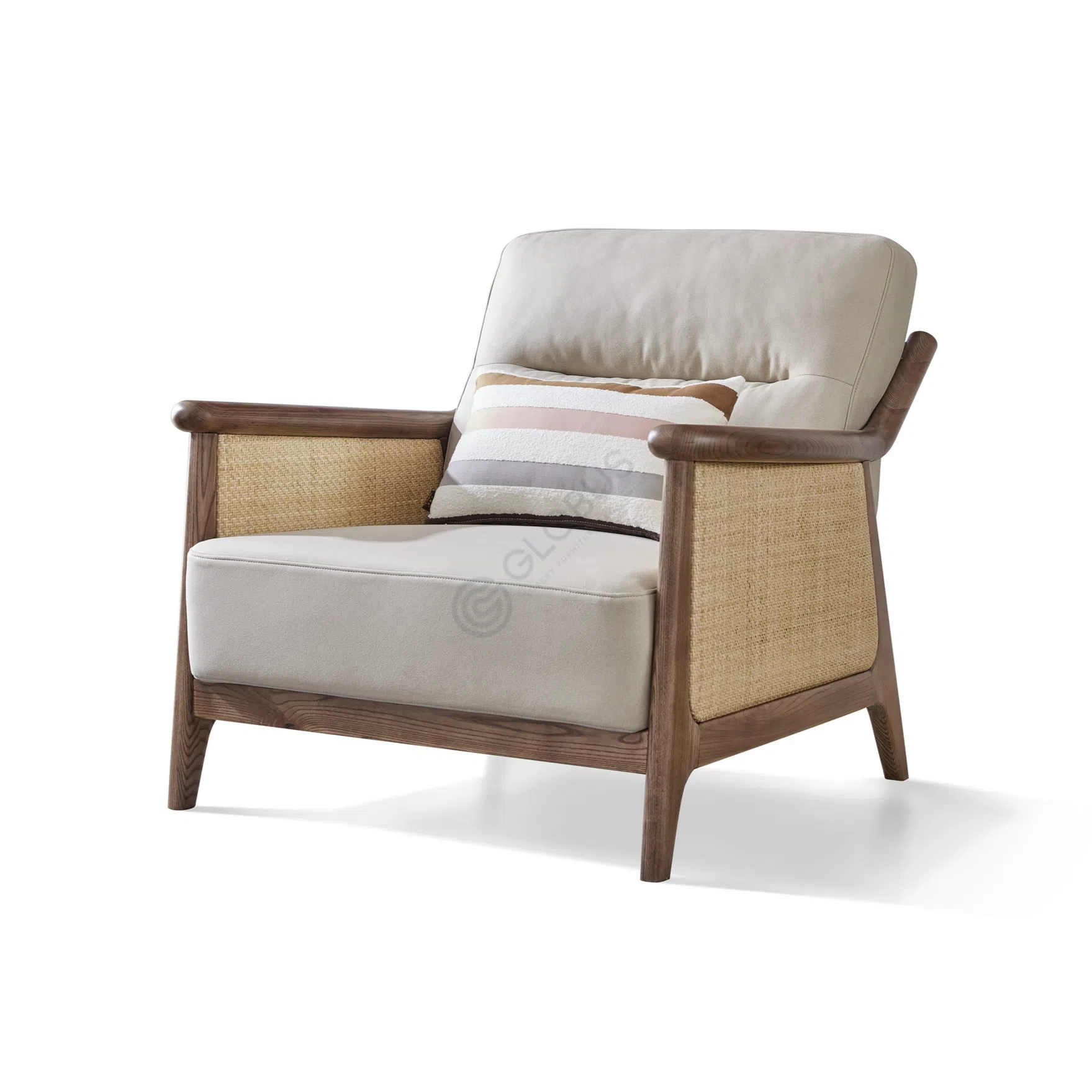 Этот элегантный предмет мебели представляет собой гармоничное сочетание современного дизайна и природной красоты. Его каркас выполнен из отборного натурального дерева, демонстрируя теплоту и прочность материала. Изящные подлокотники украшены вставками из природного ротанга, добавляющими легкости и тонкий азиатский акцент к общему облику.