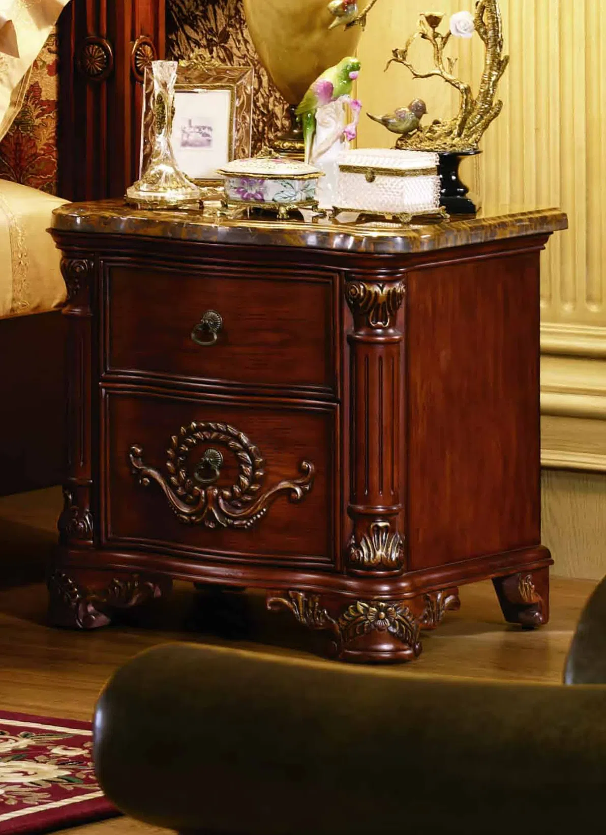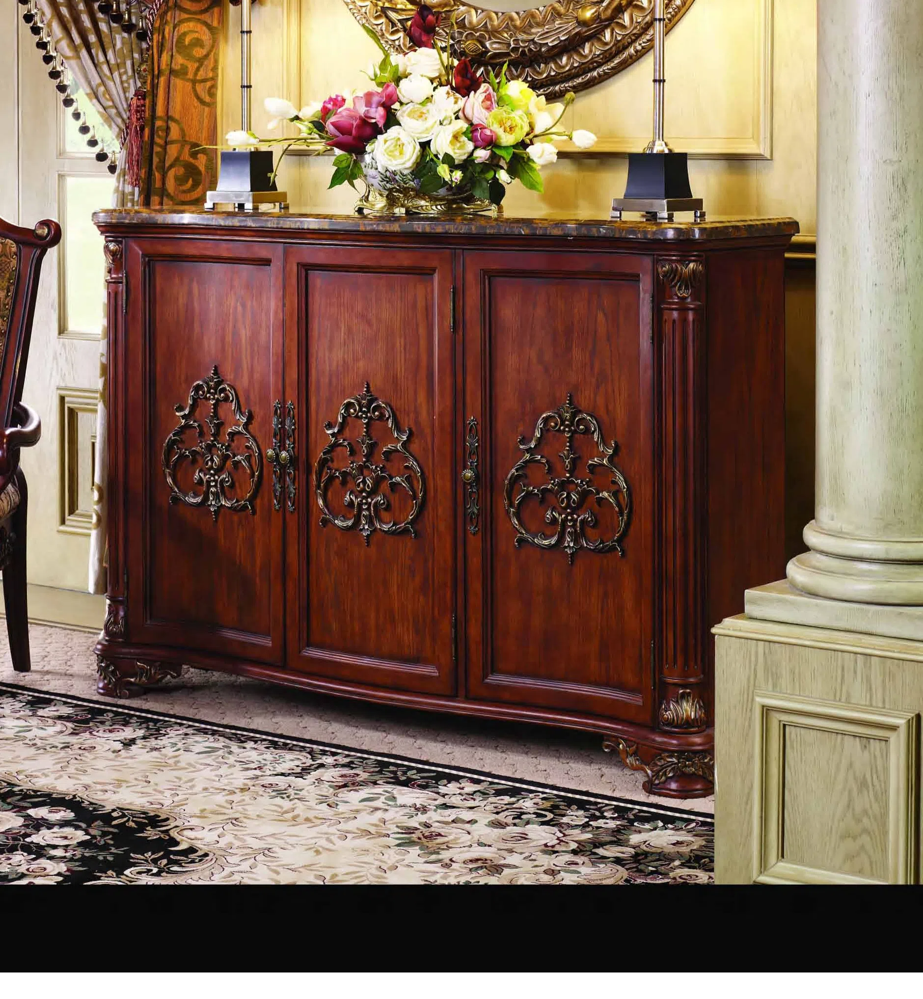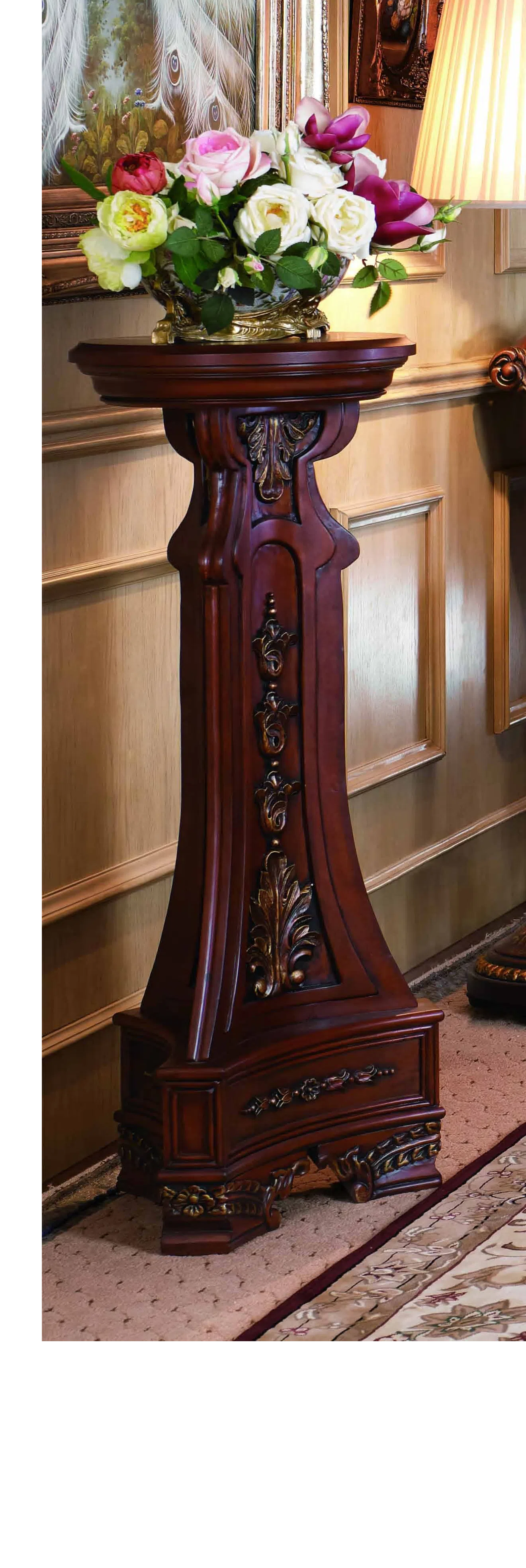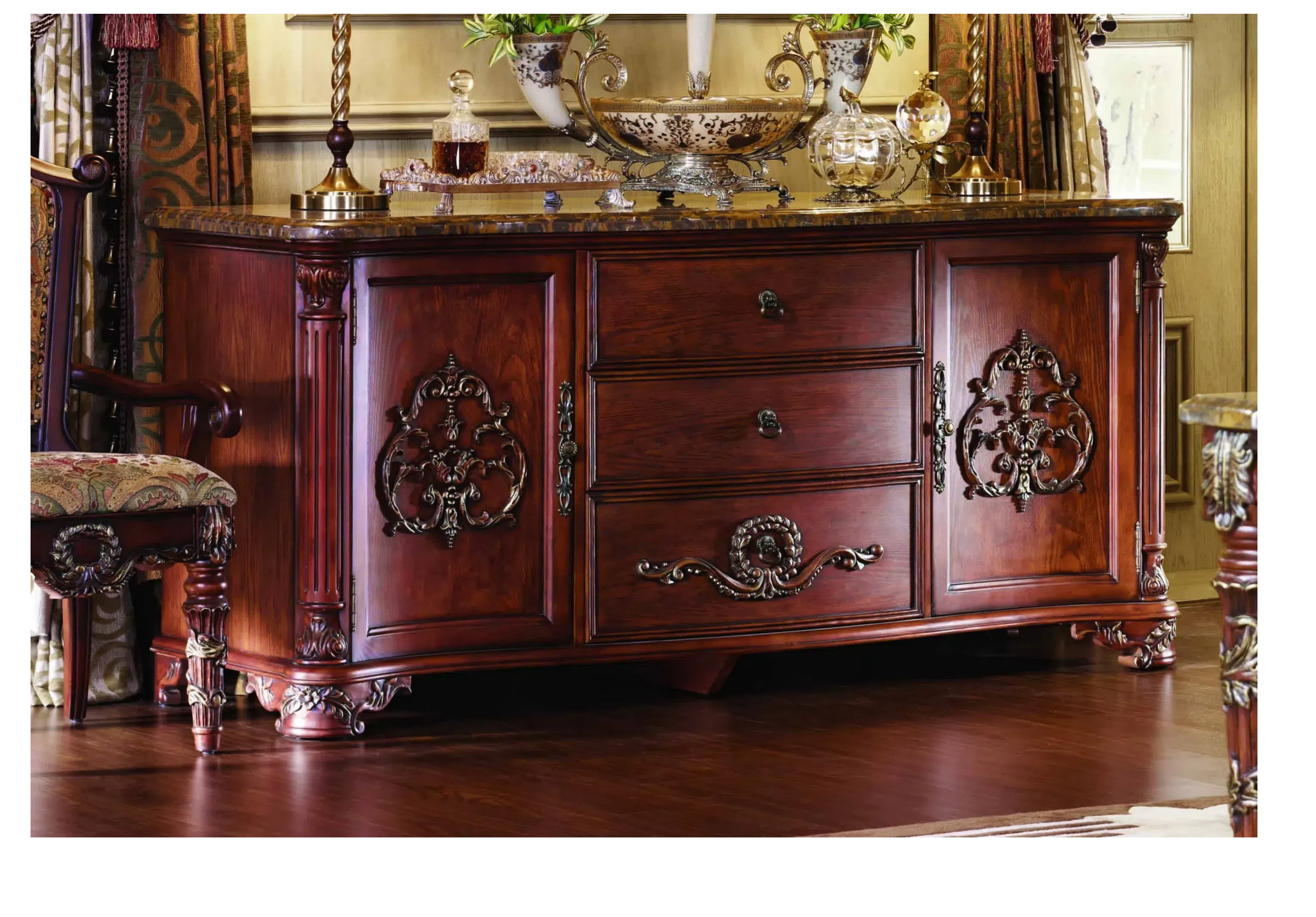 Основа конструкции выполнена из натуральной древесины и фанеры, что обеспечивает прочность и долговечность. Роскошный вид придает покрытие из шпона с эффектом патины, подчеркивающим глубину цвета и искусное исполнение. Вершину композиции венчает столешница из натурального мрамора, добавляя изделию тактильной и визуальной ценности. Декоративные элементы, выполненные с помощью тонкой резьбы, говорят о высоком мастерстве создателей.
