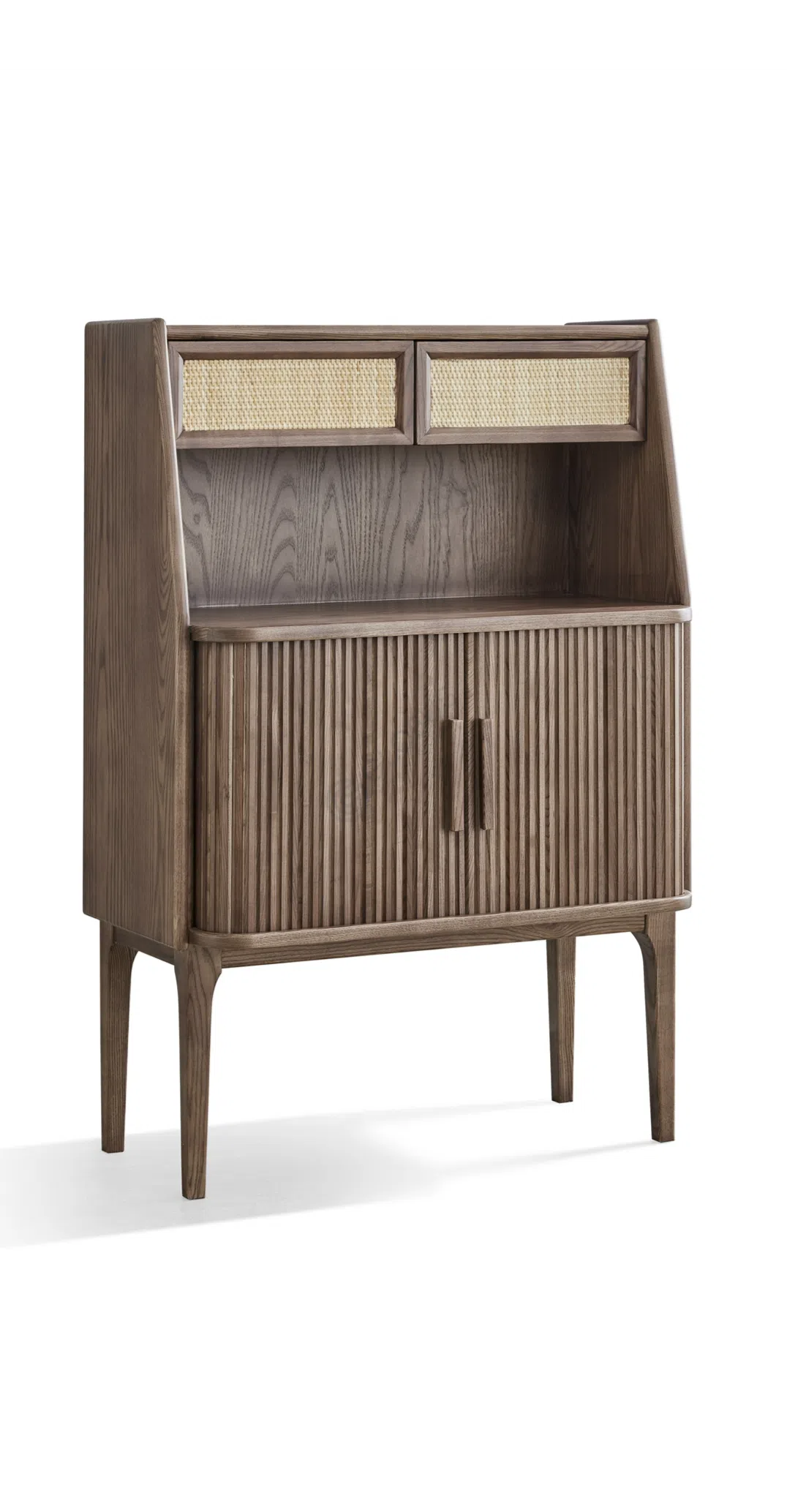 Дизайн фасада с вертикальными линиями добавляет воздушности и изящества, создавая приятную текстуру, которая идеально будет смотреться в любом современном или классическом интерьере. Ножки, выполненные в стилистике мебели середины прошлого века, подчеркивают эстетическую ценность телевизионного столика, делая его не просто местом для размещения техники, но и стильным элементом вашего дома.