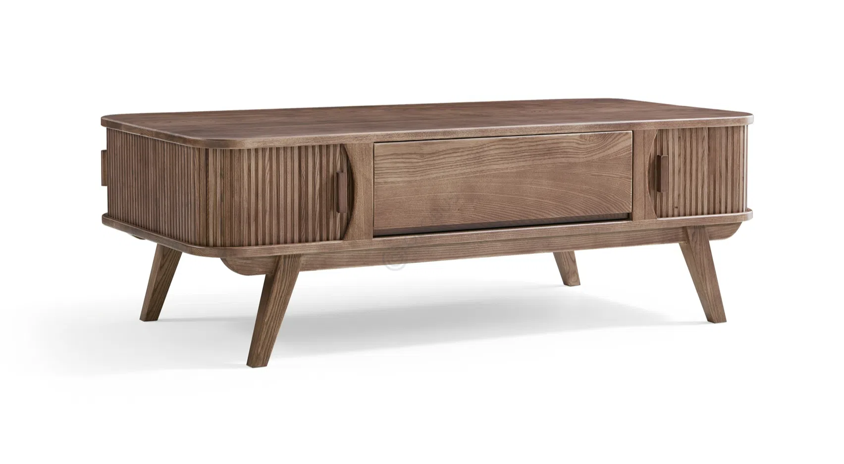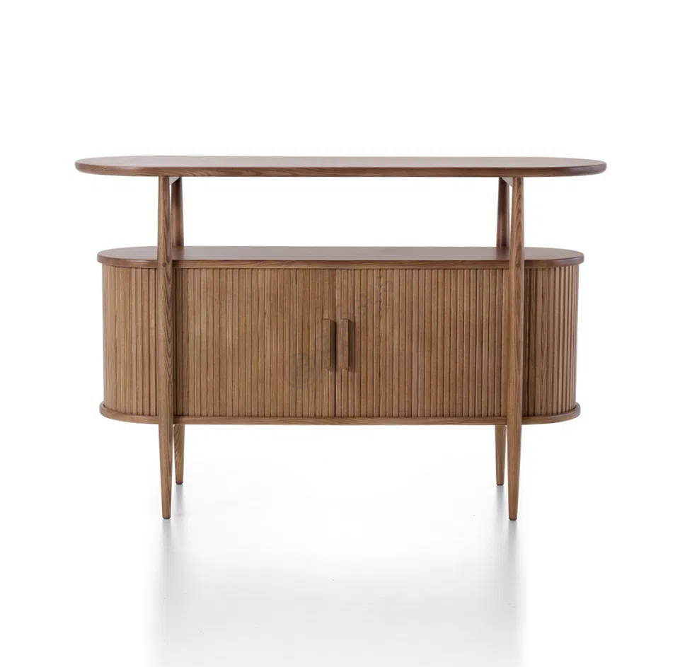 Дизайн фасада с вертикальными линиями добавляет воздушности и изящества, создавая приятную текстуру, которая идеально будет смотреться в любом современном или классическом интерьере. Ножки, выполненные в стилистике мебели середины прошлого века, подчеркивают эстетическую ценность телевизионного столика, делая его не просто местом для размещения техники, но и стильным элементом вашего дома.