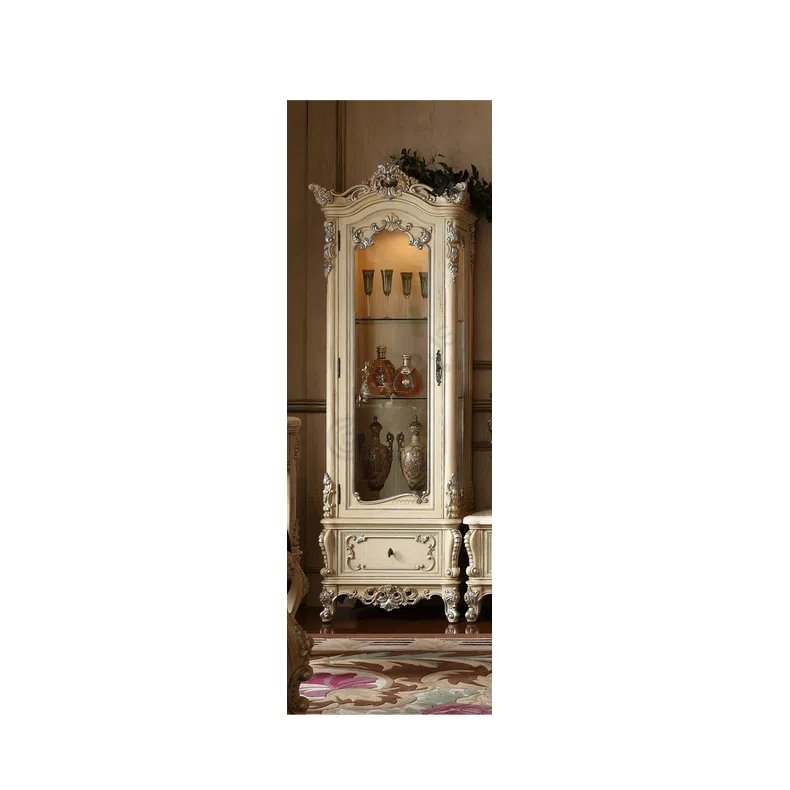 Выполненный из натурального дерева, шпона и фанеры, этот витринный шкаф демонстрирует высокое качество материалов и мастерство исполнения. Детальная резьба украшает фасад и ножки, придавая ему неповторимый характер. Стекло высокого качества в дверце позволяет любоваться размещенными внутри предметами, будь то коллекционный фарфор, изящное стекло или дорогие сувениры.