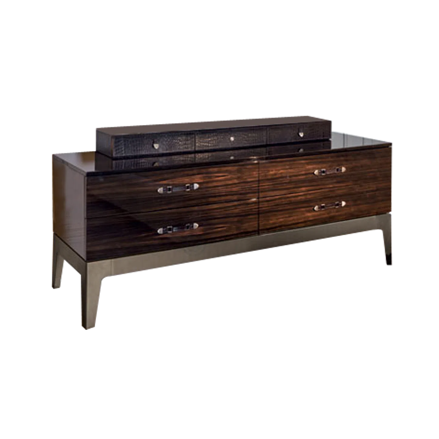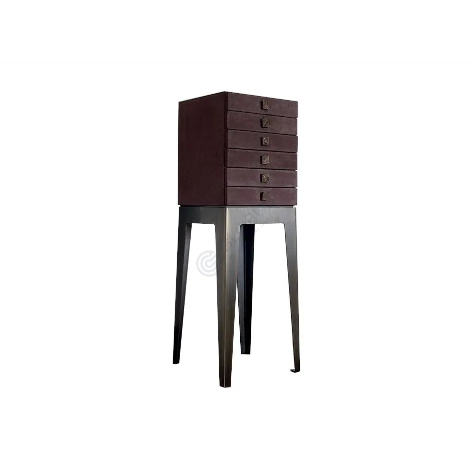 В производстве изделия использованы премиальные материалы. Основание выполнено из прочной нержавеющей стали, гарантирующей устойчивость. Корпус сочетает в себе натуральное дерево, фанеру и благородный шпон, придающий поверхности глубокий цвет и уникальную текстуру. Дверцы могут быть отделаны кожей, что добавляет тактильного комфорта и визуальной роскоши. Уникальная фурнитура служит ярким акцентом, подчеркивая внимание к деталям.