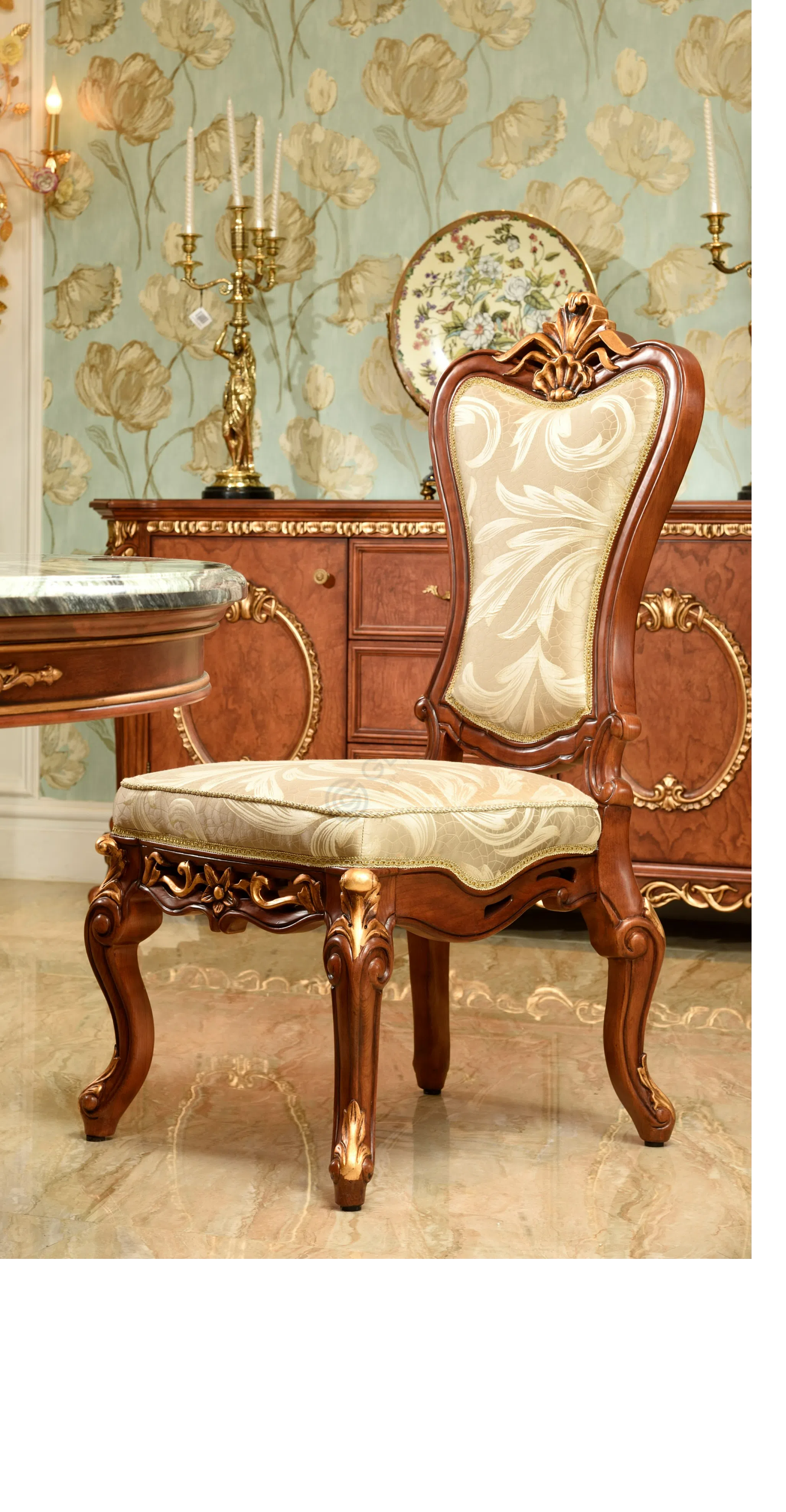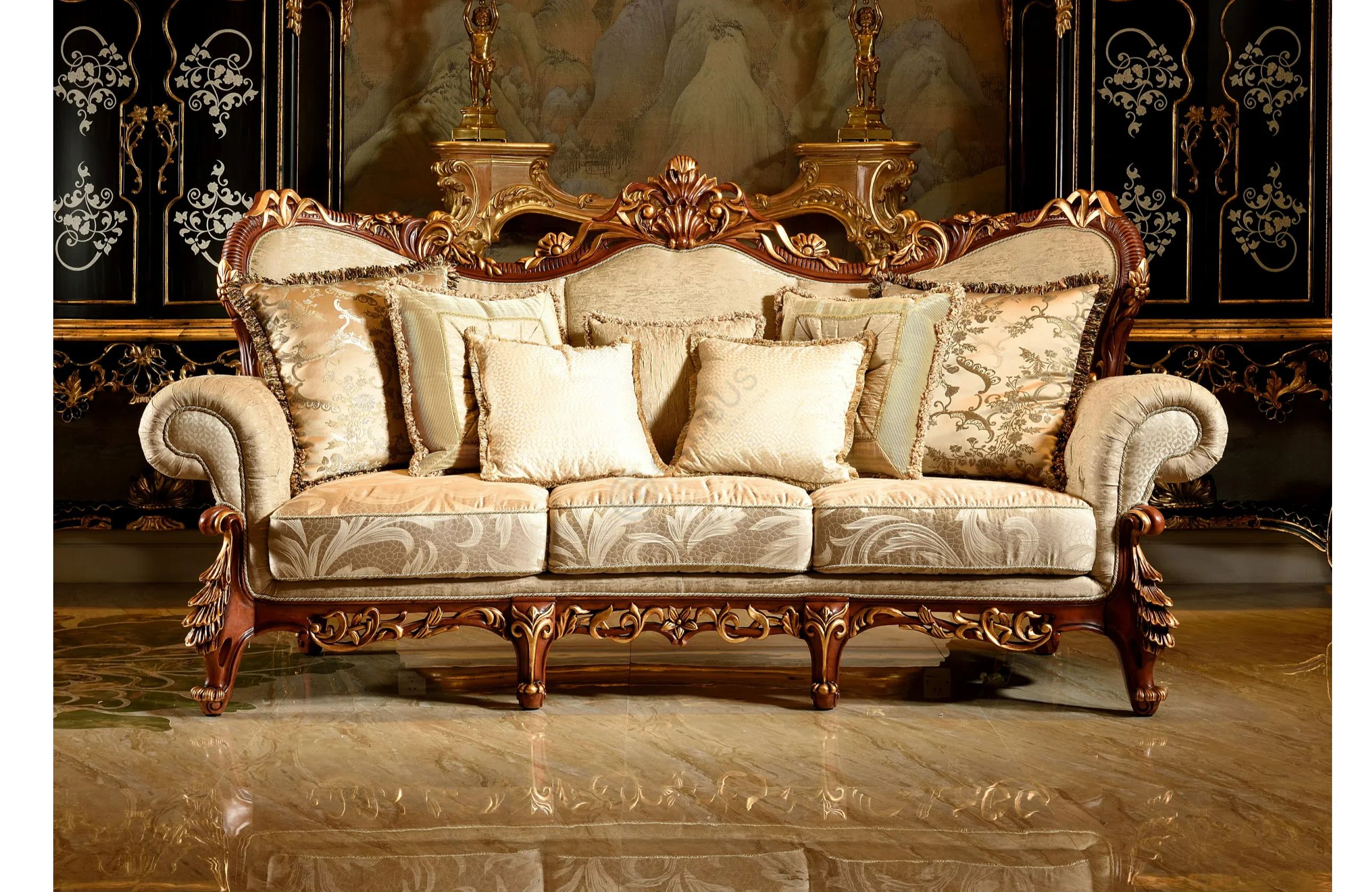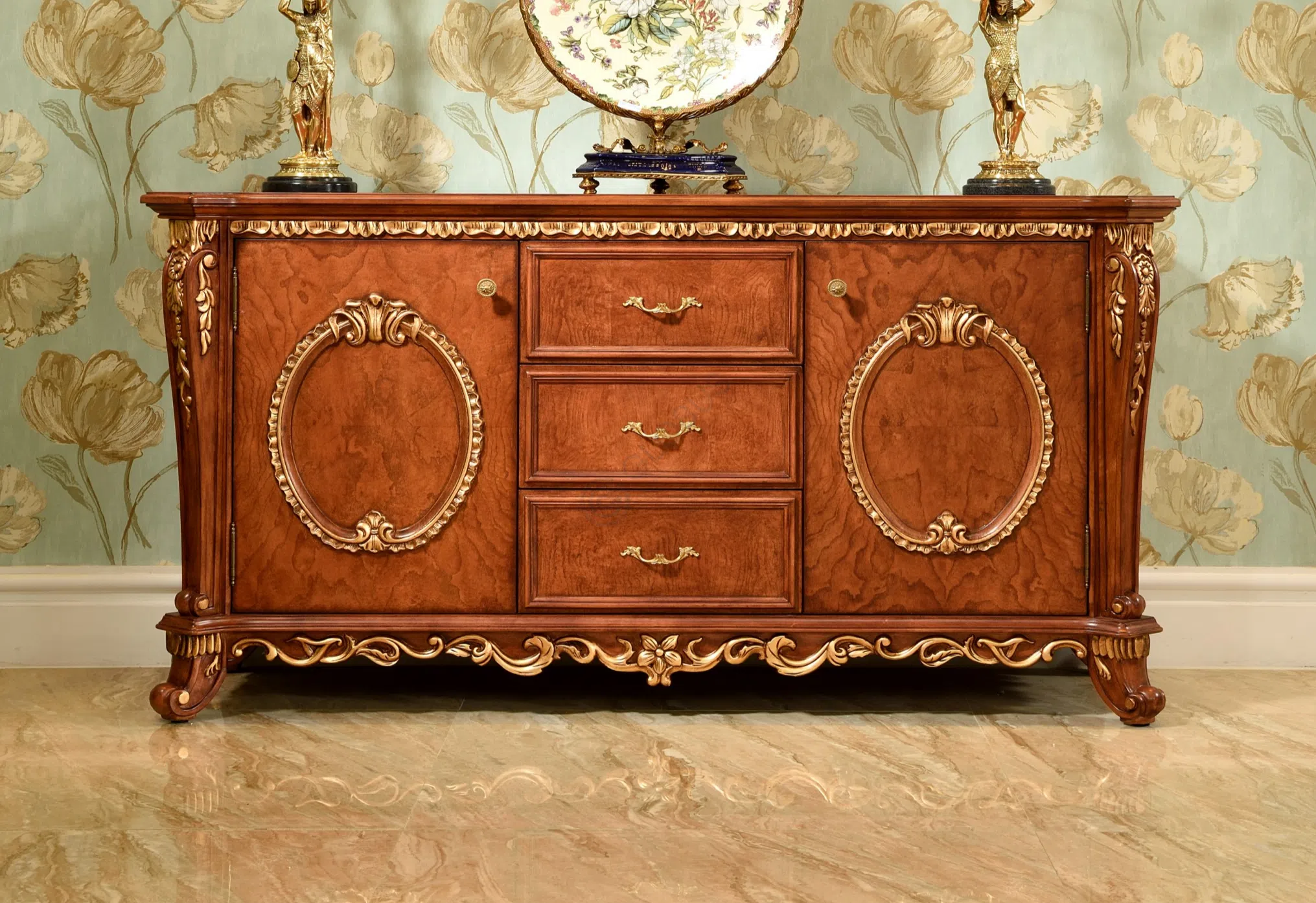 Декор тумбы заслуживает особого внимания. Резные элементы и витиеватые золотистые узоры обрамляют фасады ящиков и ножки, добавляя пышности и торжественности. Каждая деталь орнамента тщательно проработана, что подчеркивает высокий уровень мастерства. Три выдвижных ящика обеспечивают удобное хранение необходимых мелочей, сохраняя порядок у изголовья кровати. Плавные линии и изогнутые ножки придают облику легкость и элегантность.