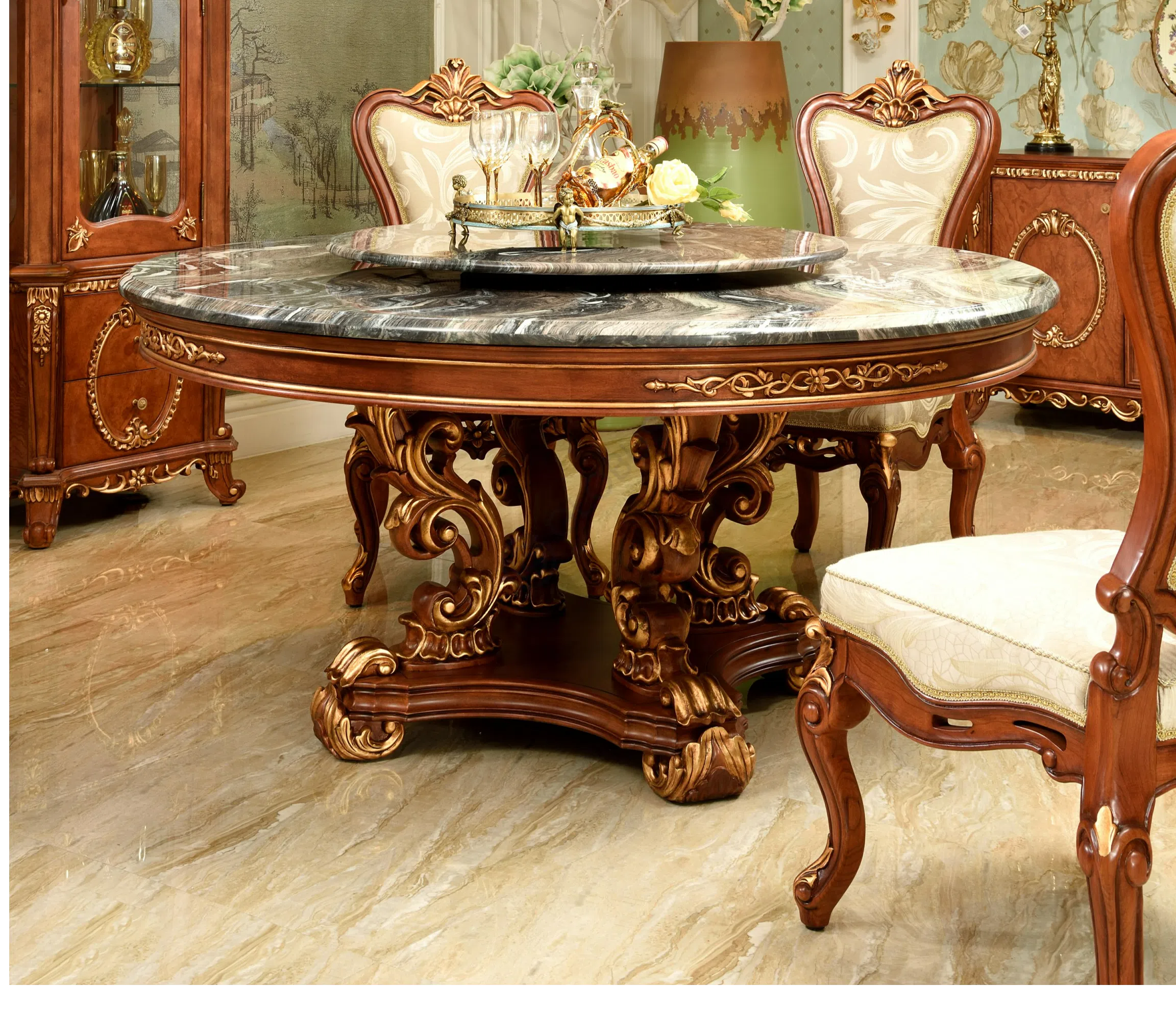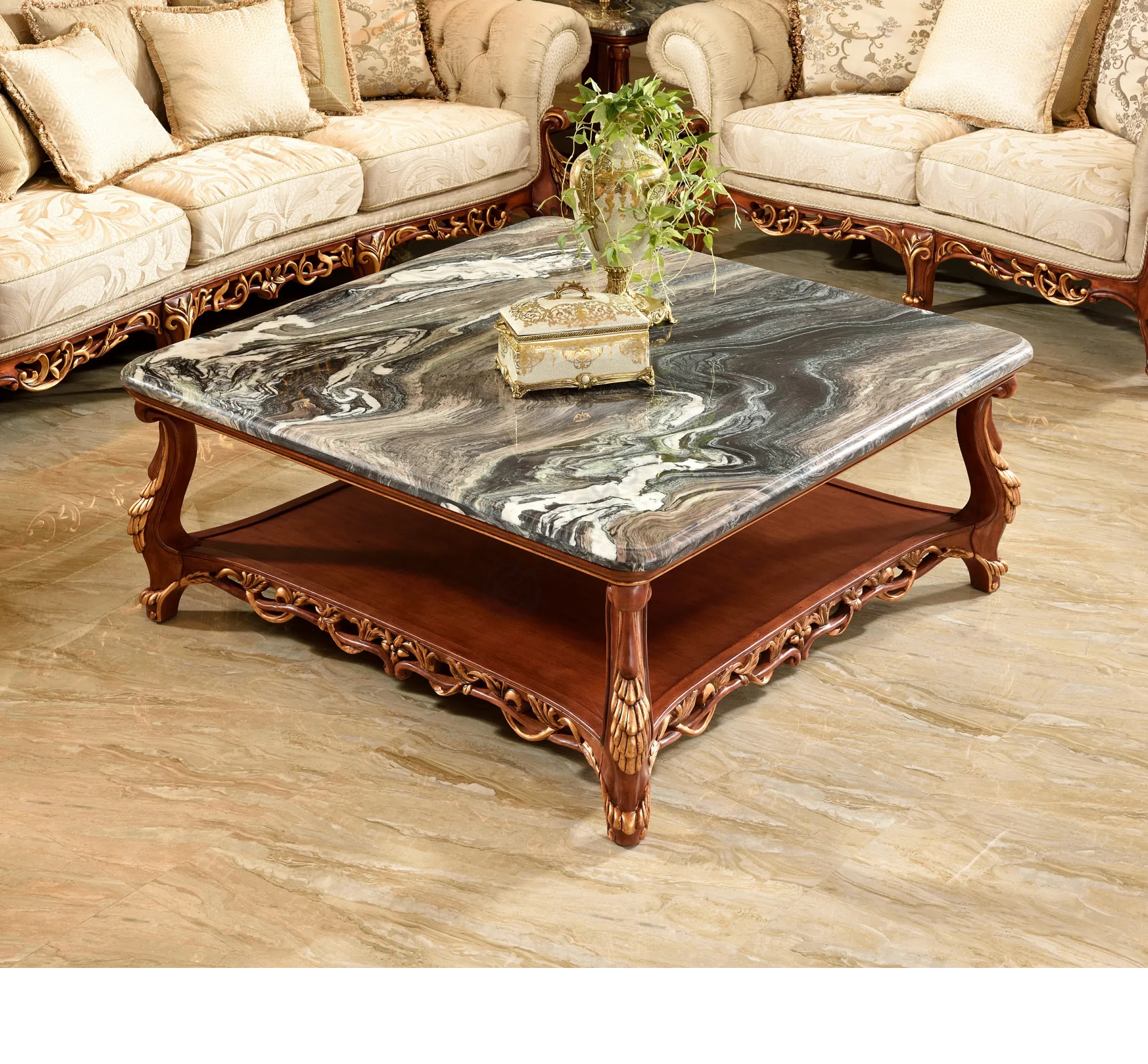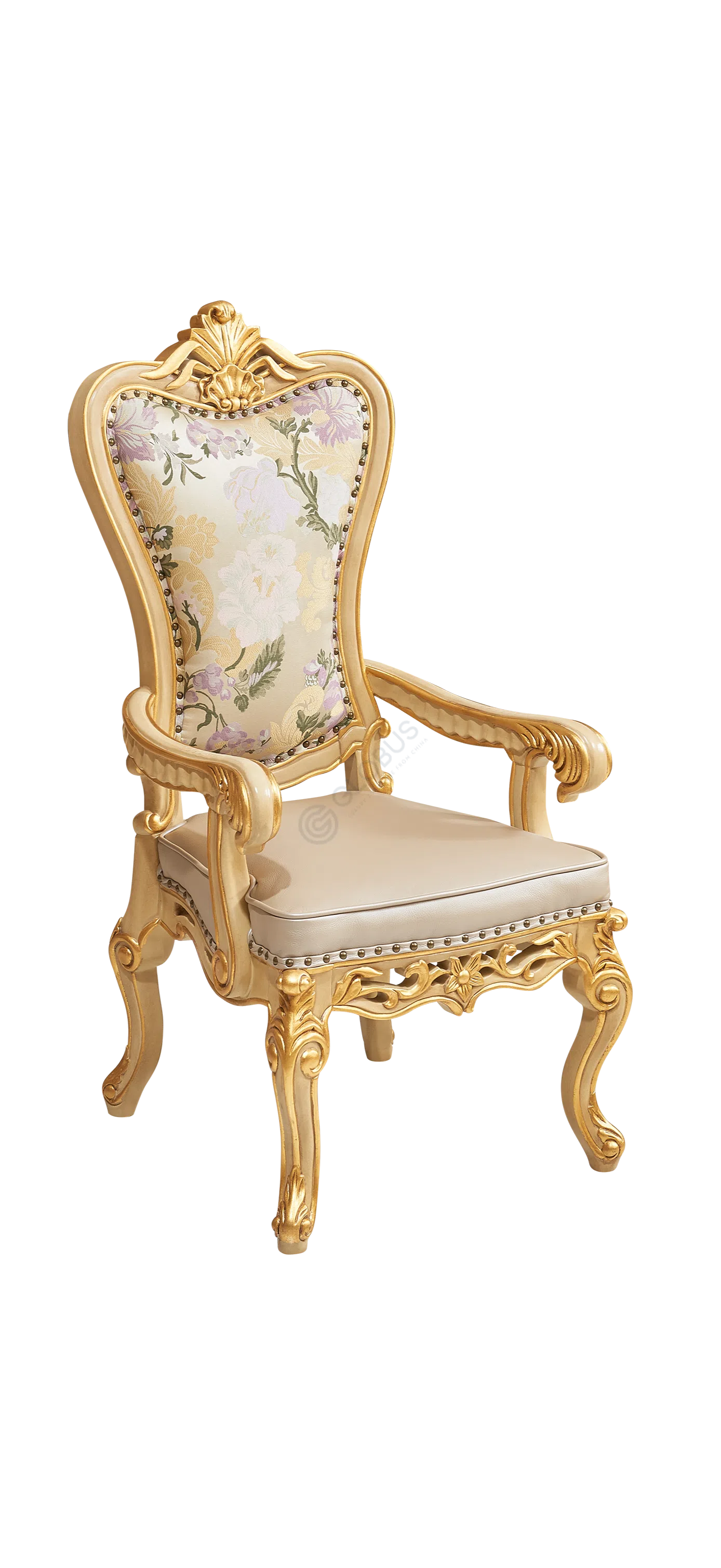 Декор тумбы заслуживает особого внимания. Резные элементы и витиеватые золотистые узоры обрамляют фасады ящиков и ножки, добавляя пышности и торжественности. Каждая деталь орнамента тщательно проработана, что подчеркивает высокий уровень мастерства. Три выдвижных ящика обеспечивают удобное хранение необходимых мелочей, сохраняя порядок у изголовья кровати. Плавные линии и изогнутые ножки придают облику легкость и элегантность.