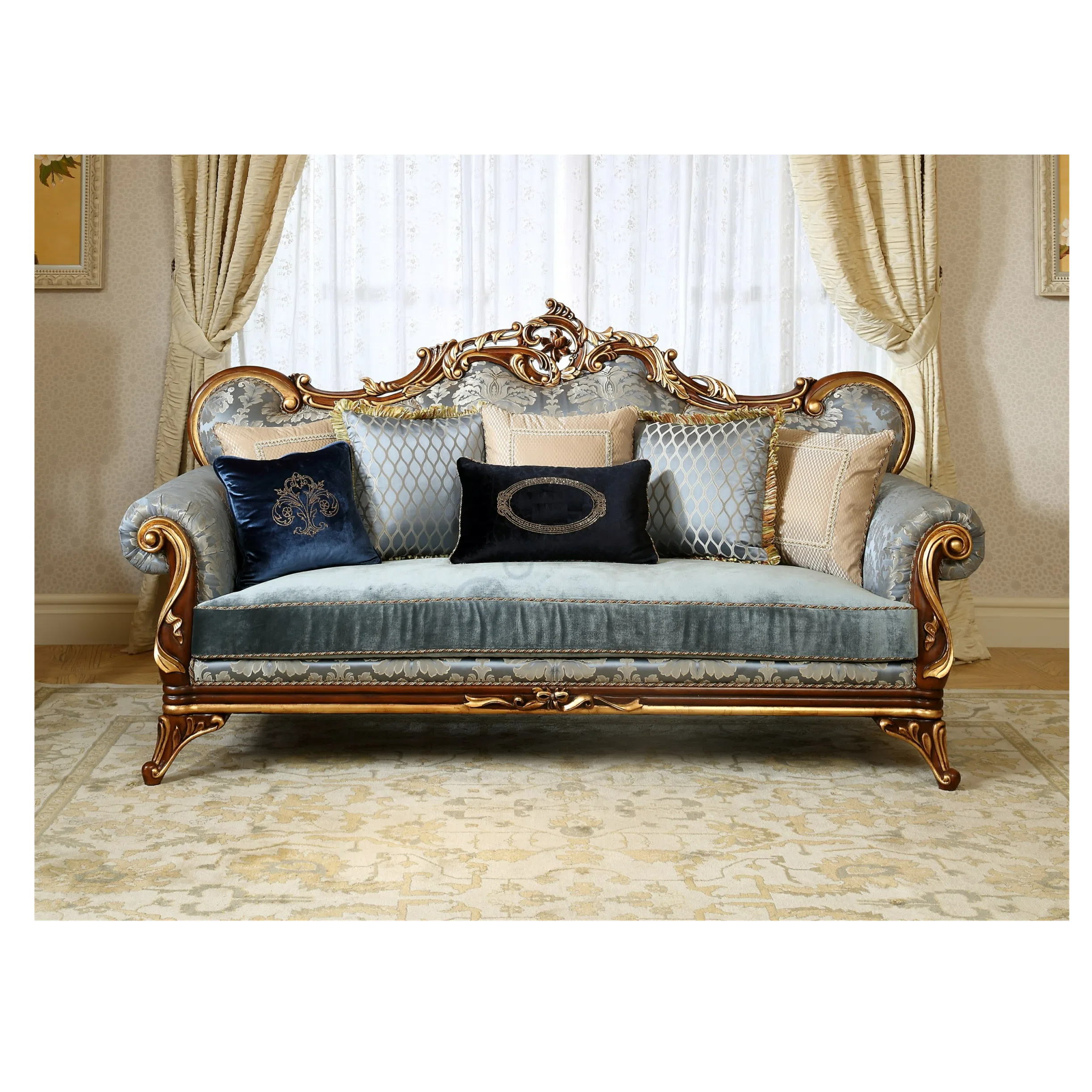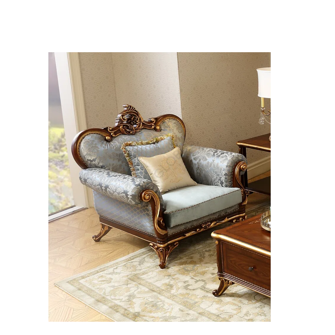 Фасад и боковые части тумбы украшены мастерской резьбой. Замысловатые цветочные мотивы и витиеватые узоры, покрытые золотом, выглядят объемно и изысканно, отражая традиции классического искусства. Благородный оттенок дерева дополняет общую картину, создавая впечатление реликвии, передающейся из поколения в поколение.