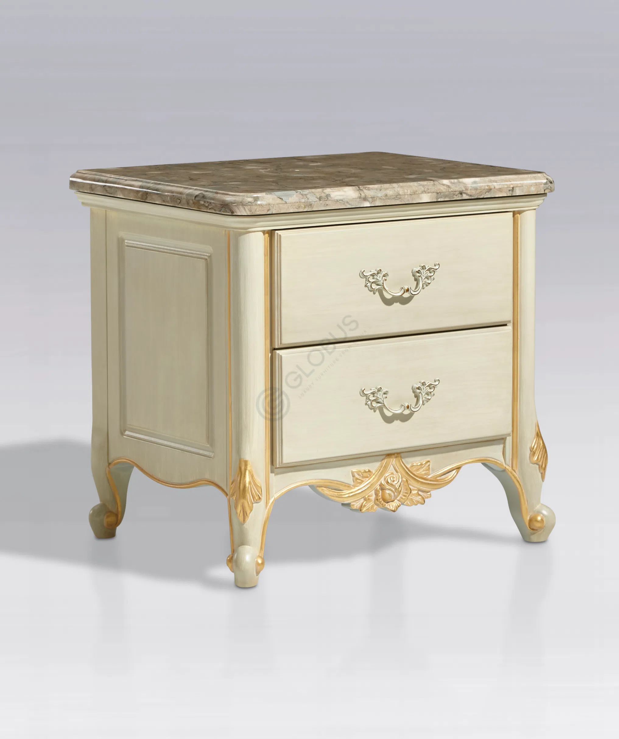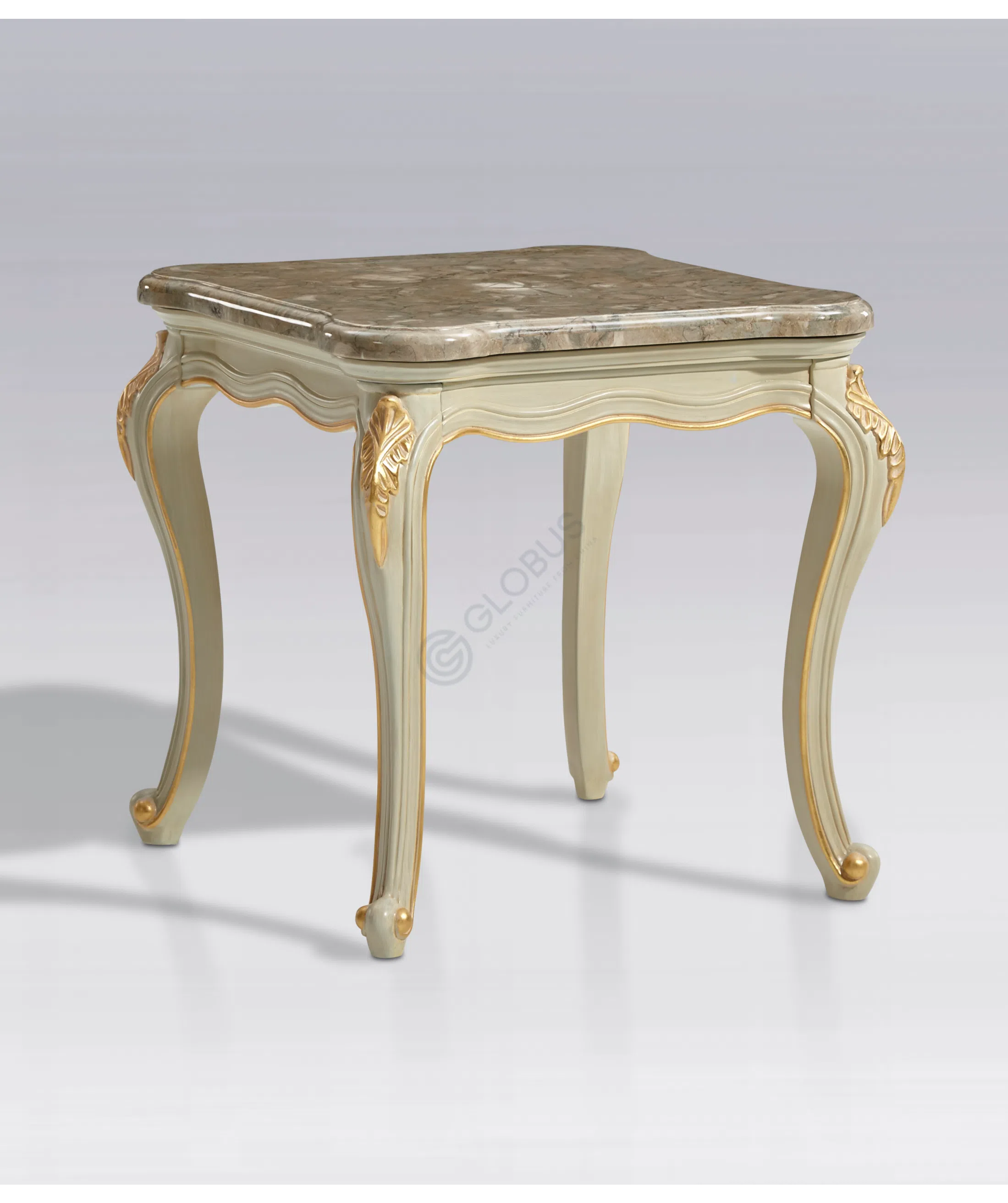 Верхняя часть выполнена из натурального мрамора, чей благородный рисунок и уникальная фактура придают предмету неповторимую ценность. Основание изготовлено из натурального дерева и фанеры, обеспечивая прочность и долговечность. Специальная отделка патиной добавляет поверхности глубину и легкий налет старины.
