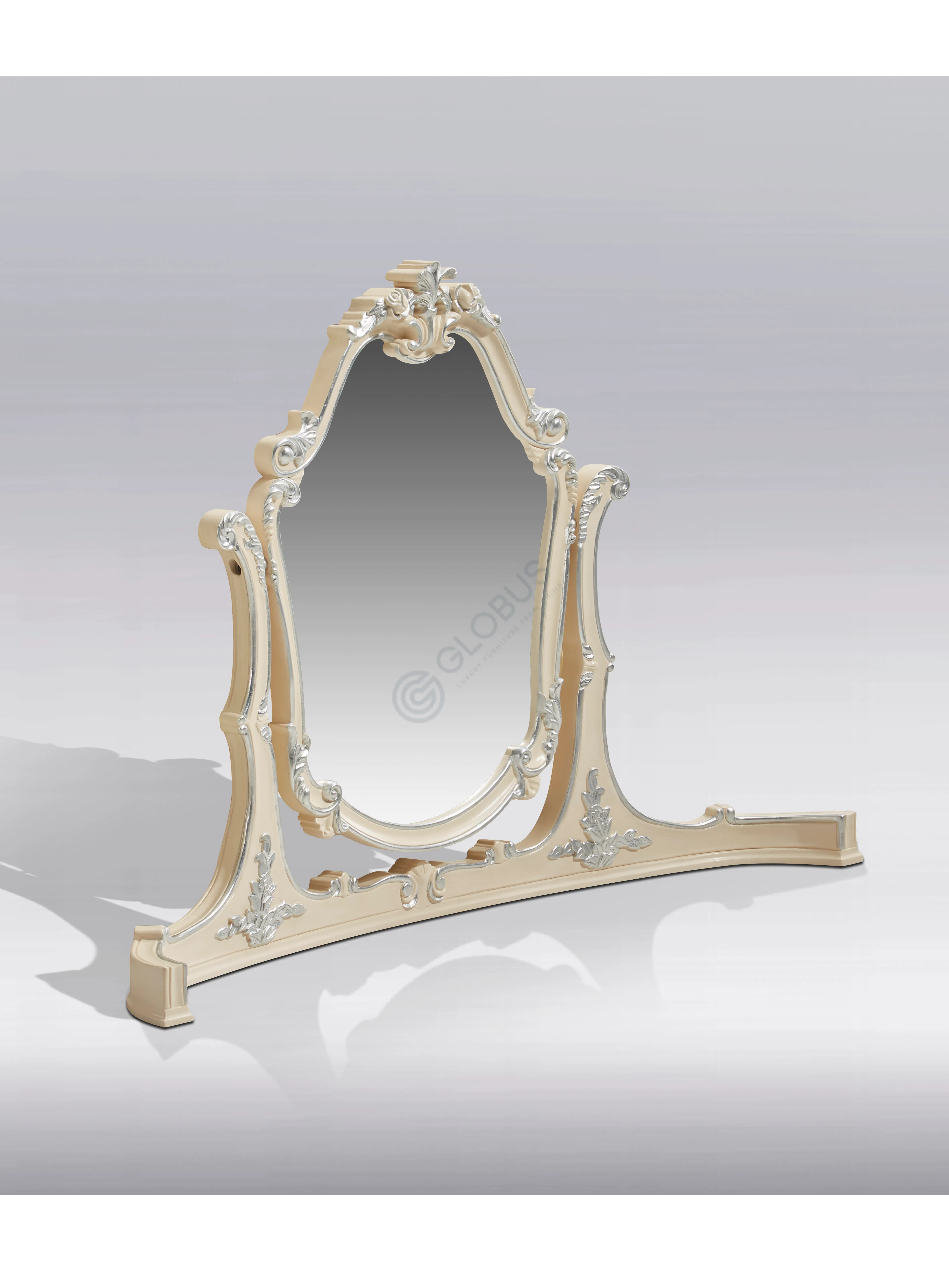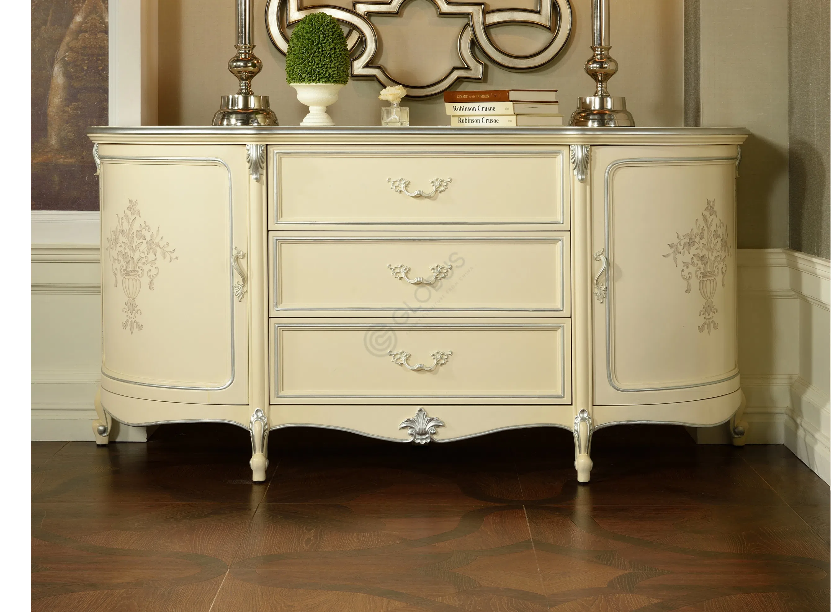 Опора стола изготовлена из натурального дерева и фанеры, покрытых изящной патиной. Деликатное состаривание и тонкие декоративные элементы подчеркивают ручную работу и внимание к деталям. Монументальная база стола обеспечивает надежность и устойчивость, завершая классический образ.