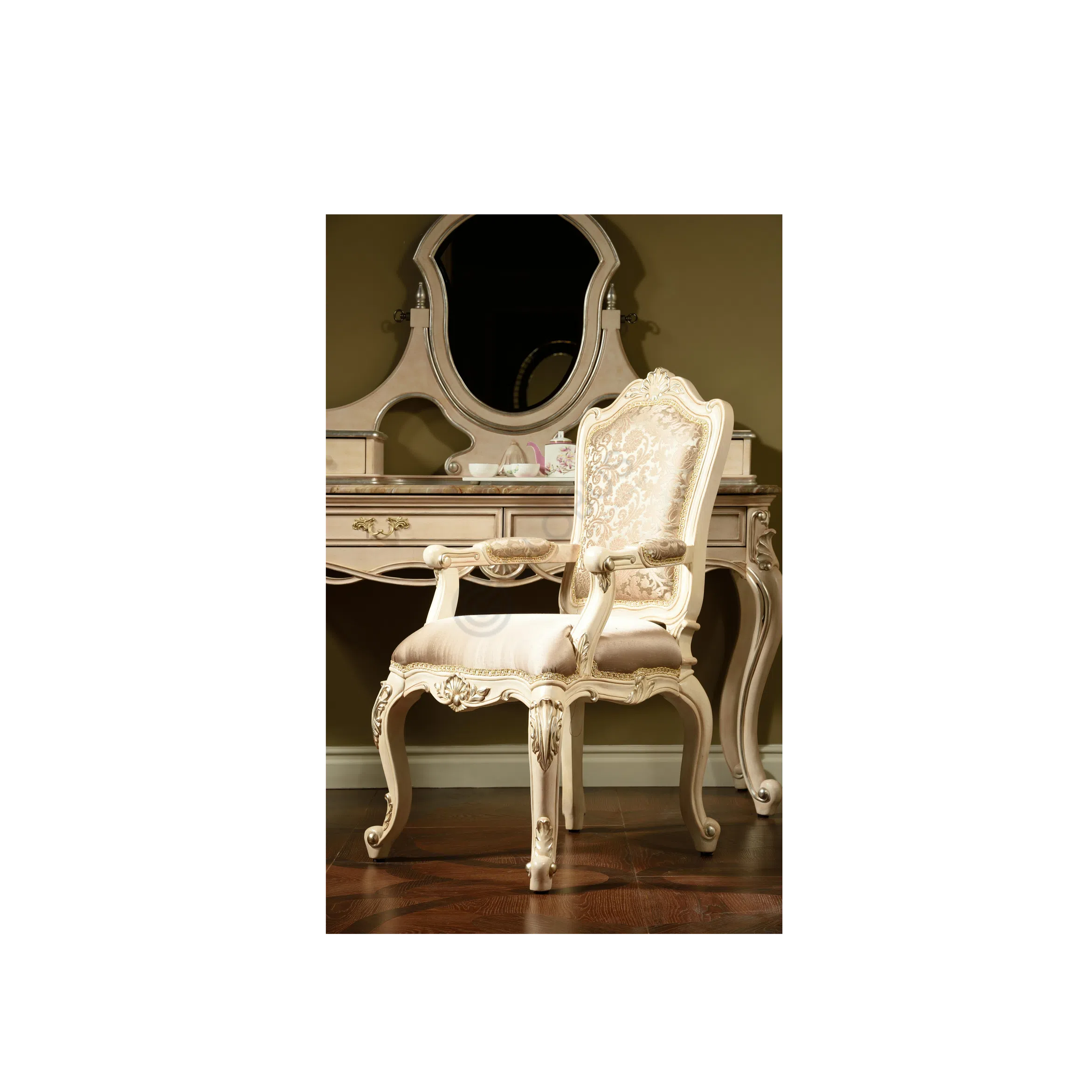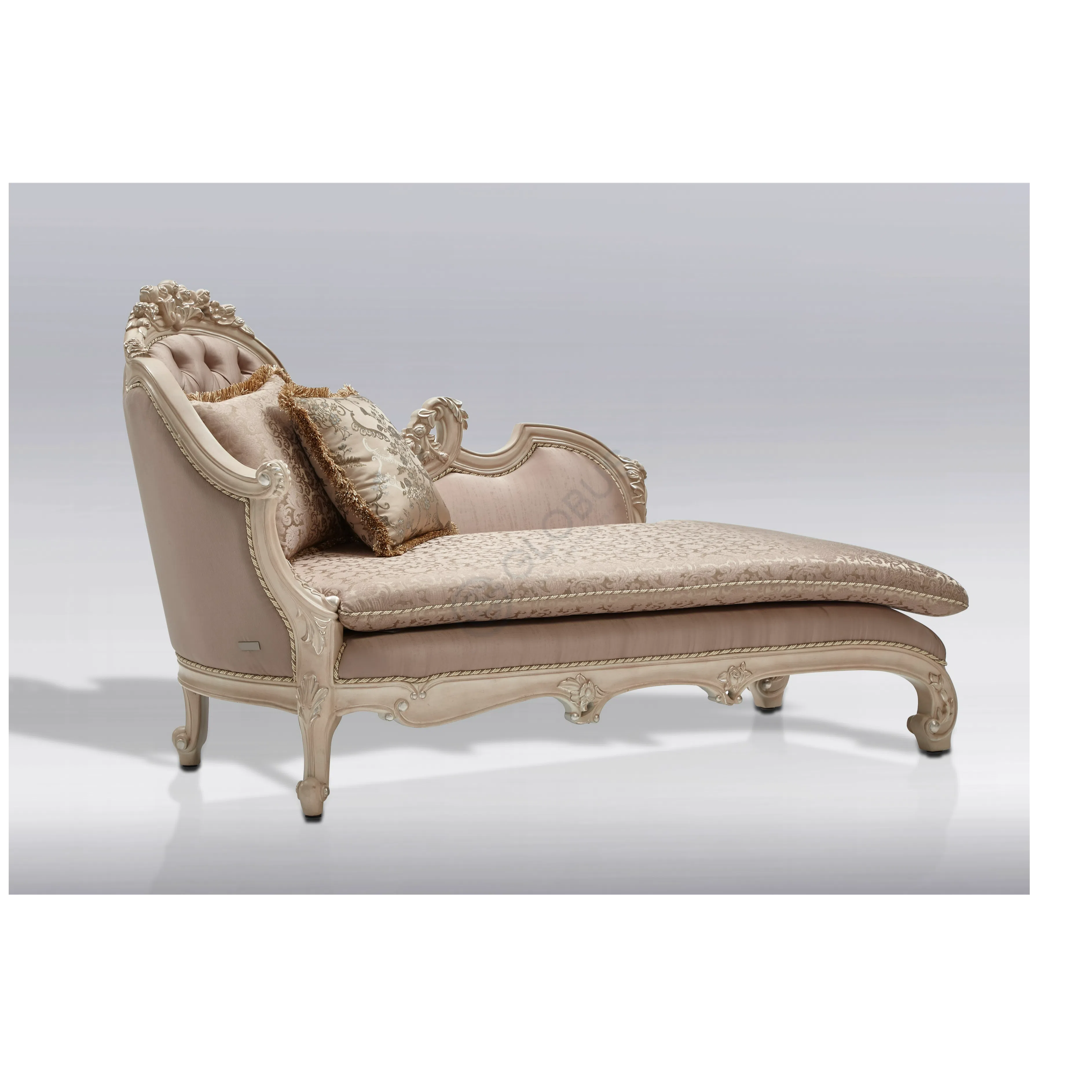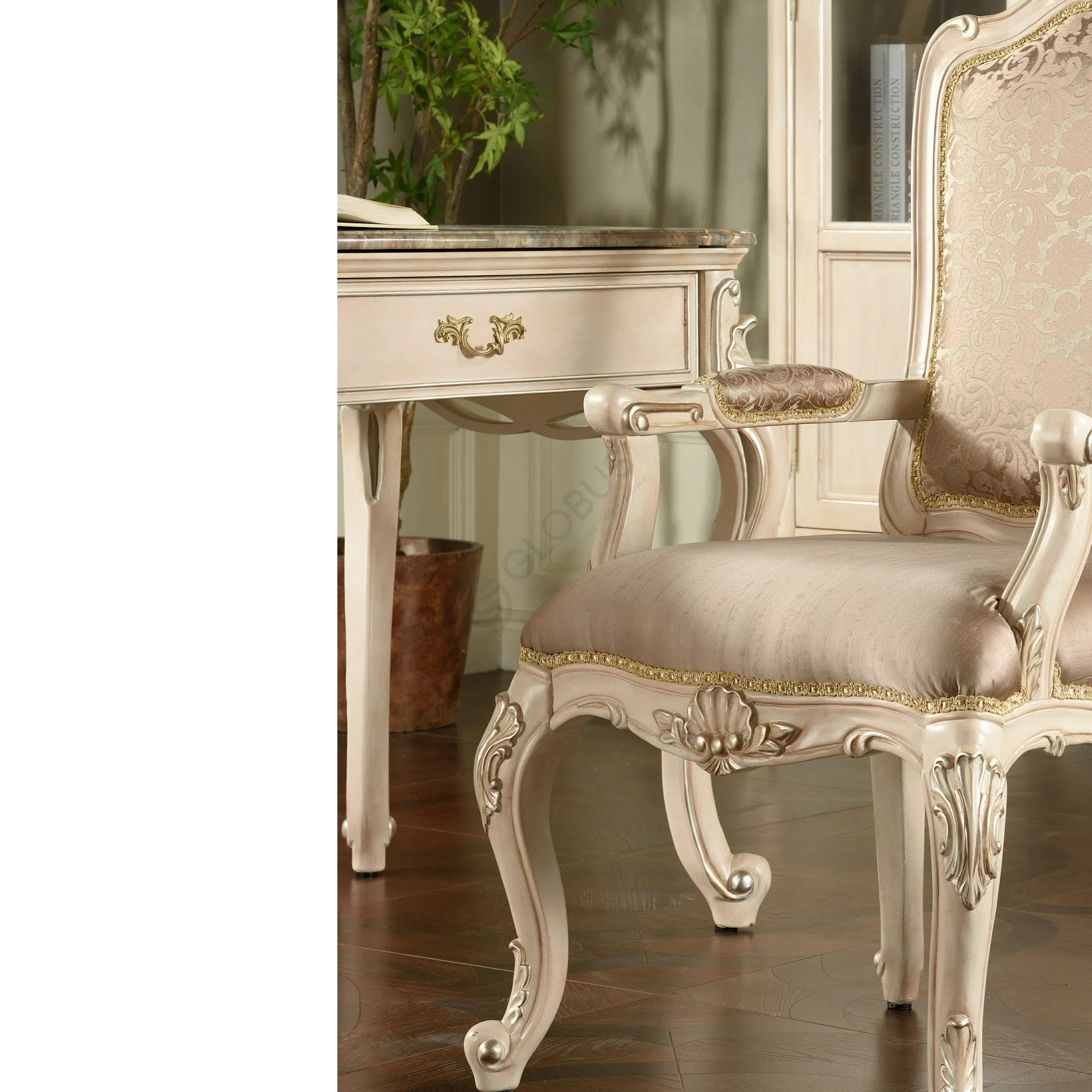 Каркас изделия создан из натурального дерева и фанеры, обеспечивая надежность и долговечность. Декоративные элементы выполнены с особой тщательностью: искусная резьба украшает подлокотники и ножки, а легкое патинирование придает дереву благородный, слегка состаренный вид, подчеркивая глубину узора.
