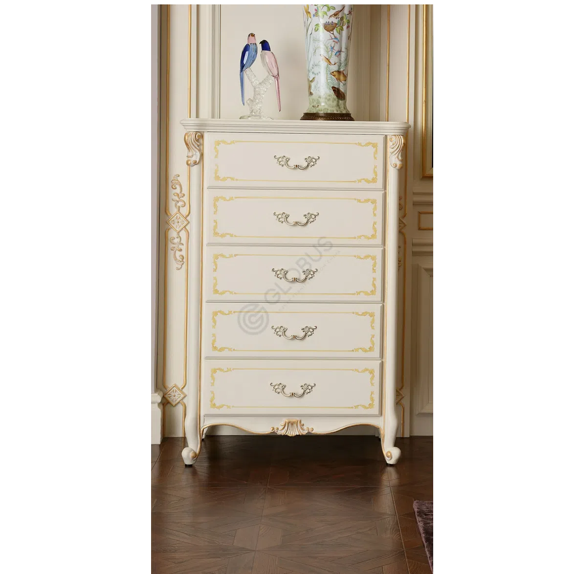 Каркас изделия выполнен из натурального дерева, мастерски обработанного с вниманием к каждой детали. Изящная резьба украшает спинку и подлокотники, придавая силуэту особую легкость и утонченность. Отделка включает деликатное покрытие с эффектом патины, подчеркивающее глубину линий, и золотистые акценты, добавляющие изделию нотку роскоши.