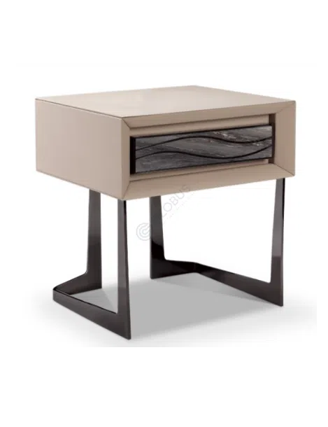 Основной корпус изделия изготовлен из прочной фанеры и обтянут высококачественной экокожей на микрофибре, которая дарит поверхности нежное тактильное ощущение и благородный матовый оттенок. Столешница, выполненная в глубоком темном цвете, создает выразительный визуальный контраст, подчеркивая совершенство форм. Особое внимание уделено основанию: изысканная нержавеющая сталь формирует асимметричные опоры, одна из которых отличается монументальностью, а другая – практически воздушной легкостью, что придает всему предмету уникальный, динамичный облик.