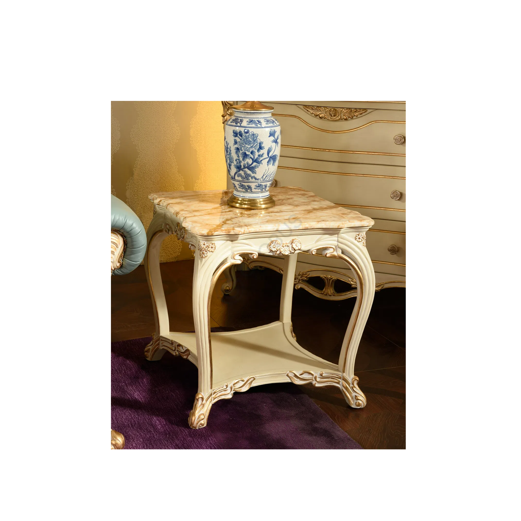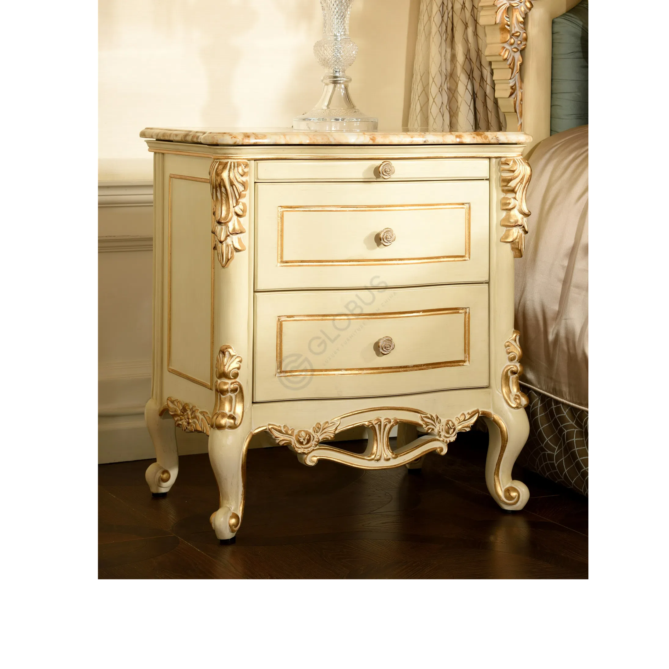 Структура изделия выполнена из натурального дерева, что гарантирует его долговечность и прочность. Элементы из фанеры дополняют конструкцию, обеспечивая легкость линий. Особое очарование придает отделка патиной, которая тонко подчеркивает изящные резные детали и придает поверхности благородный, состаренный вид. Венчает этот комод столешница из натурального мрамора, добавляющая прохладной роскоши и уникальной текстуры.