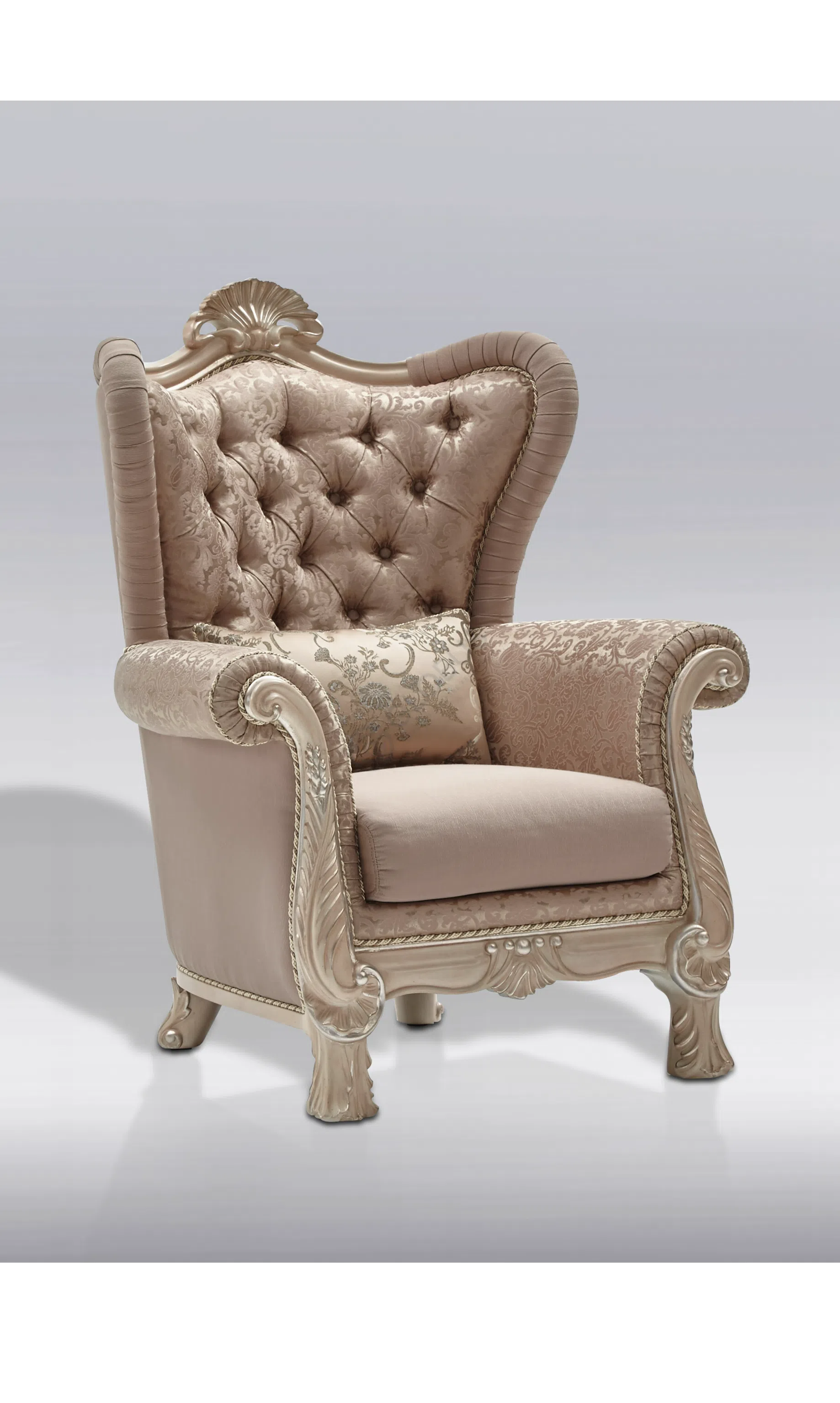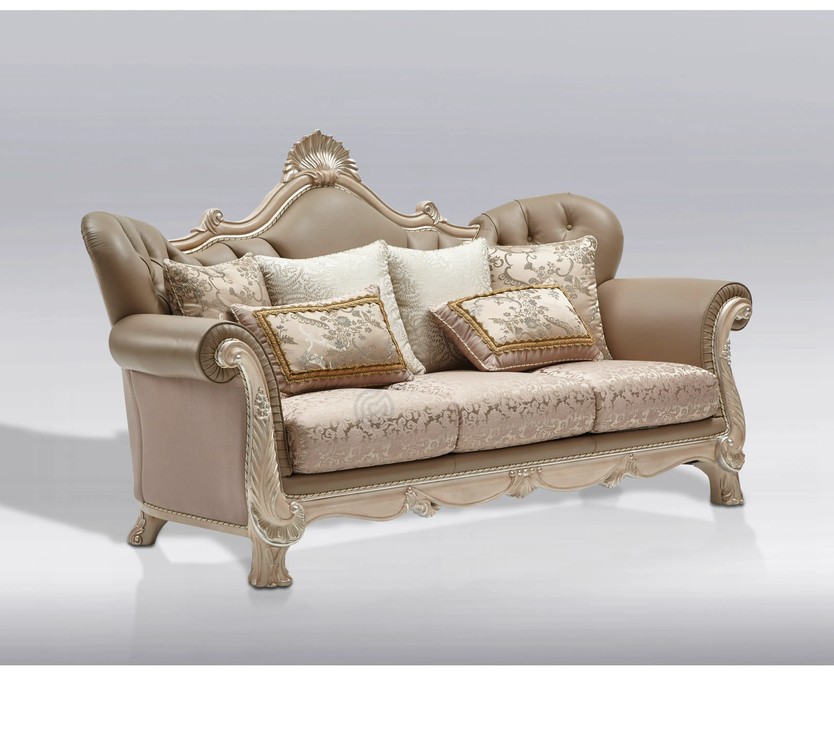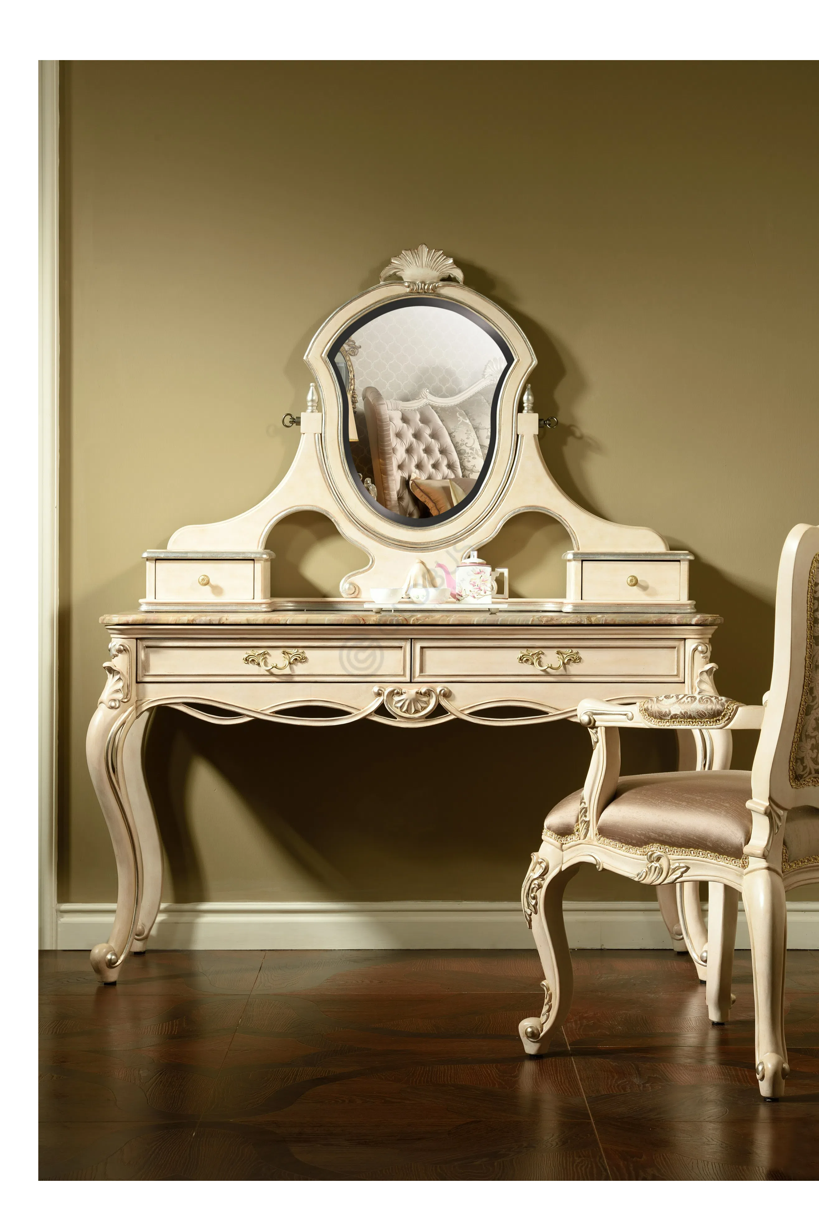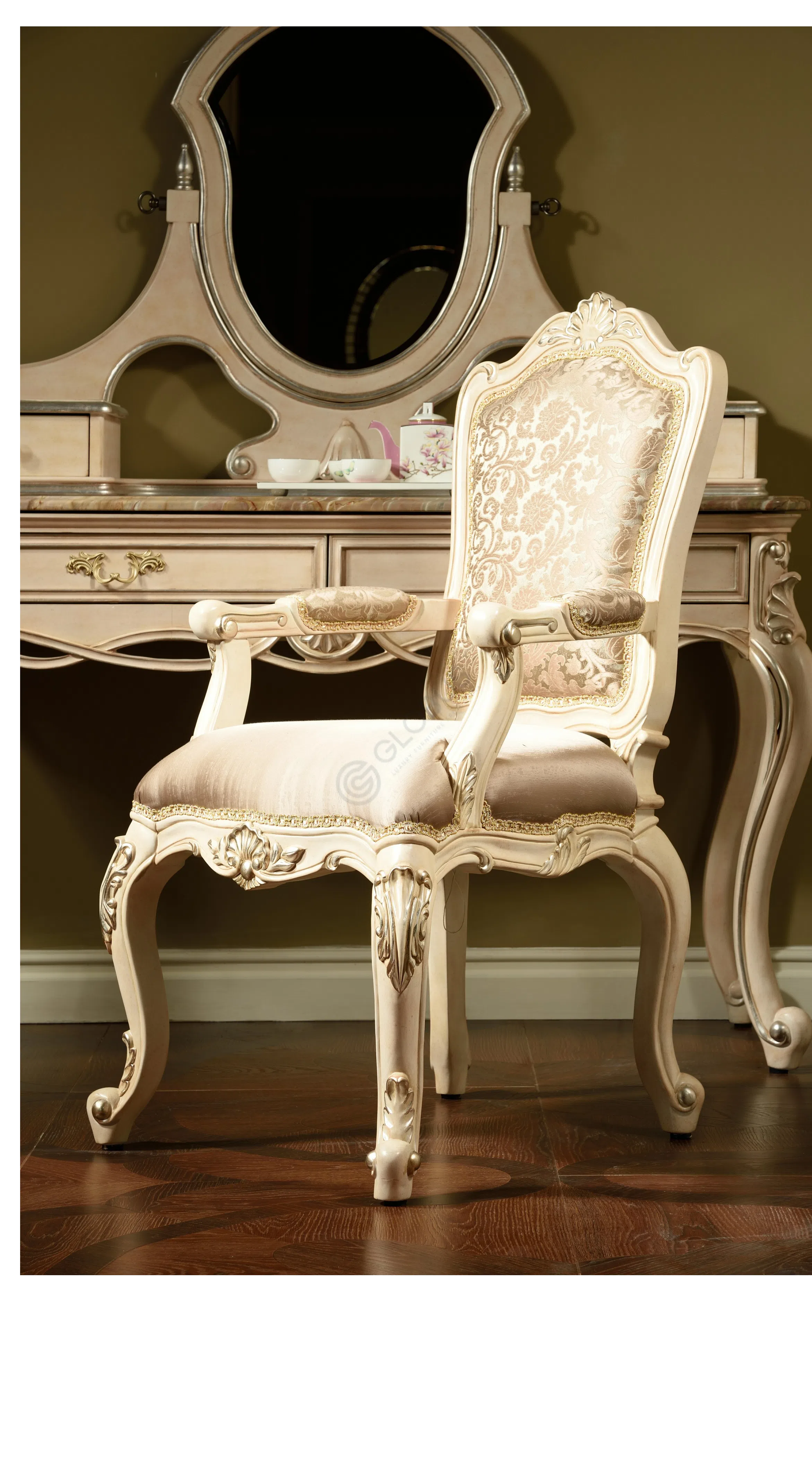 Каркас выполнен из натурального дерева, его формы плавны и утонченны. Деликатная патина придает поверхности легкий налет старины, подчеркивая глубину резных элементов и изящных ножек.