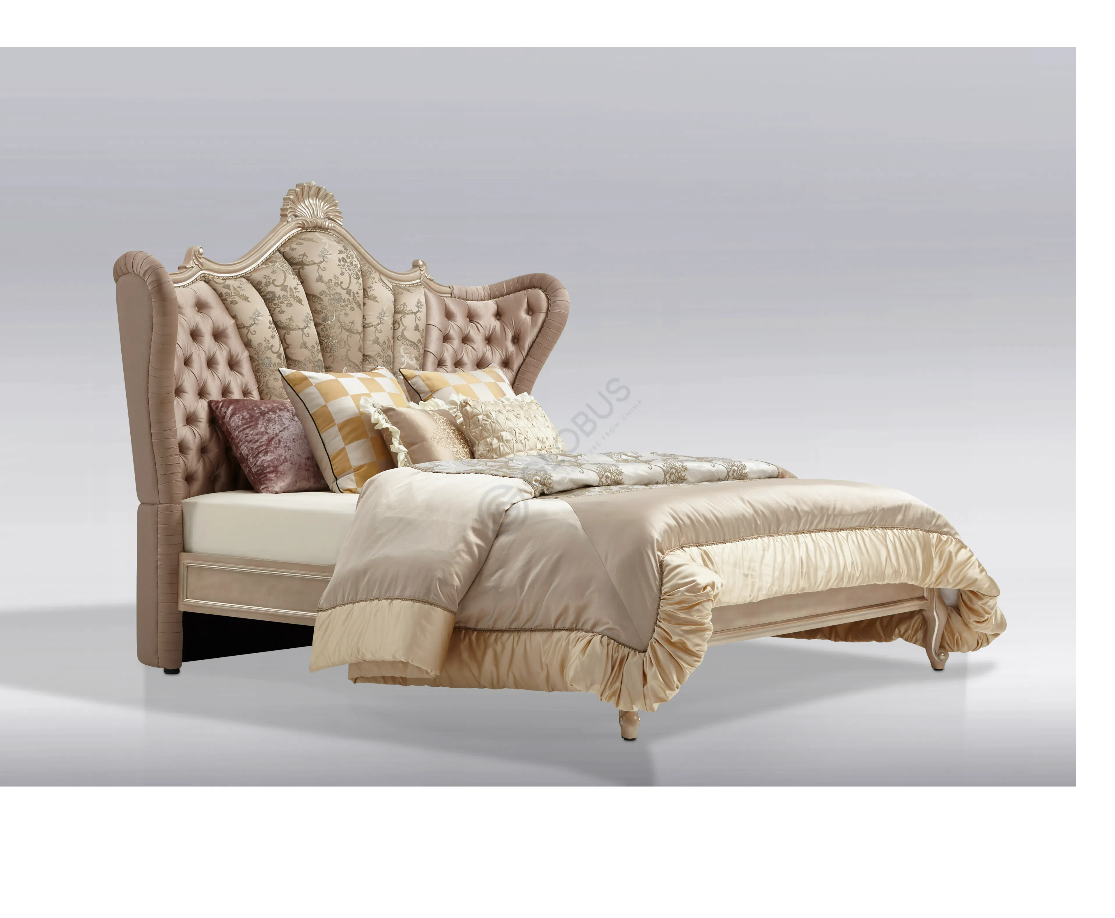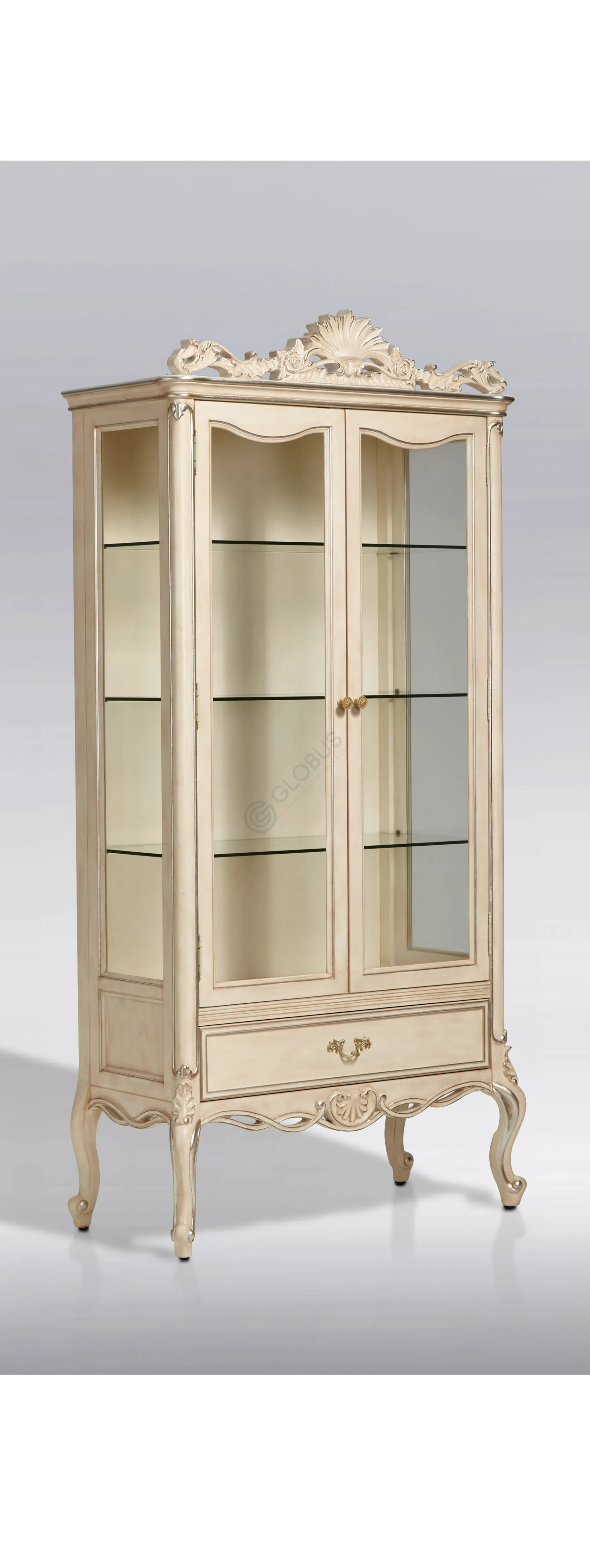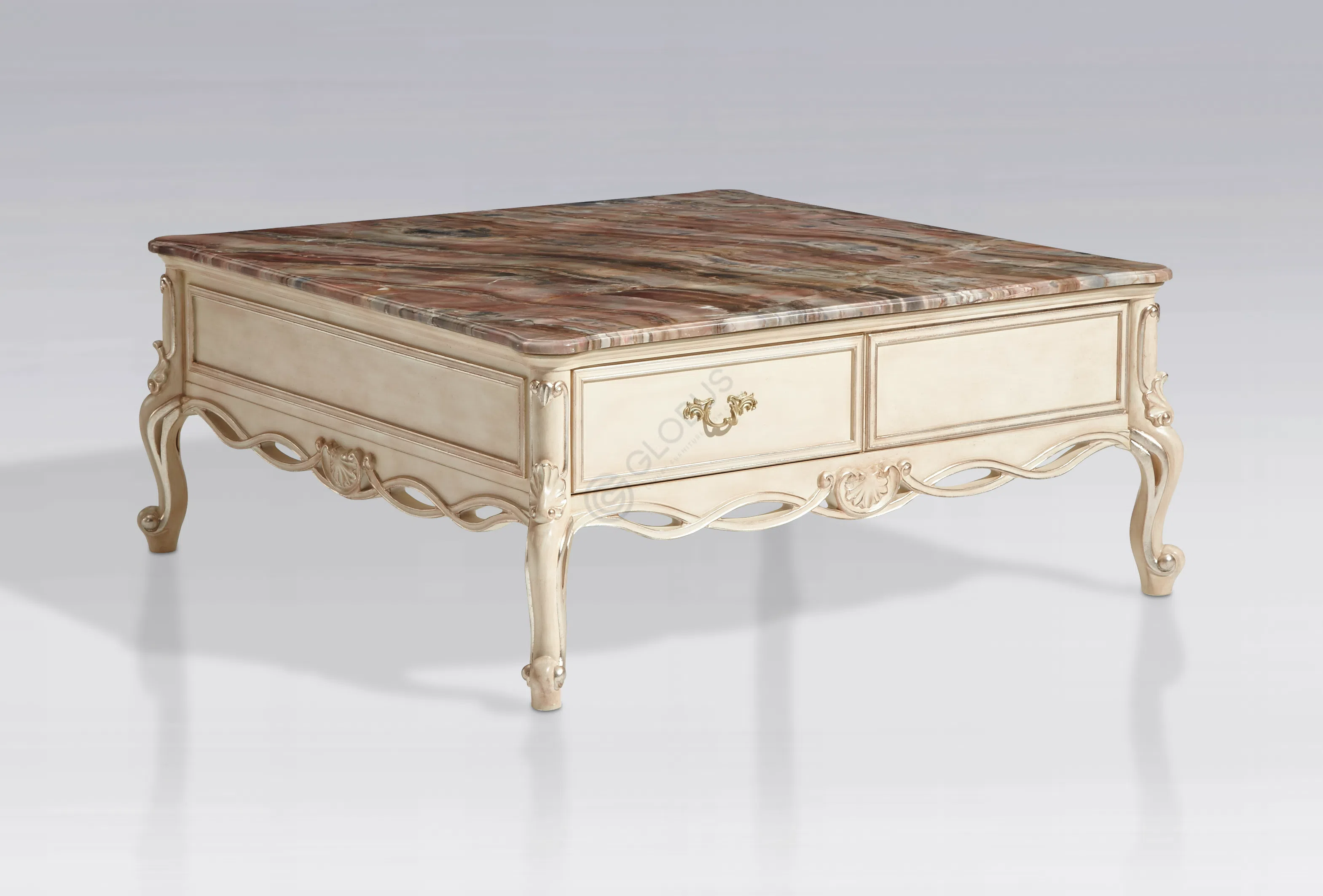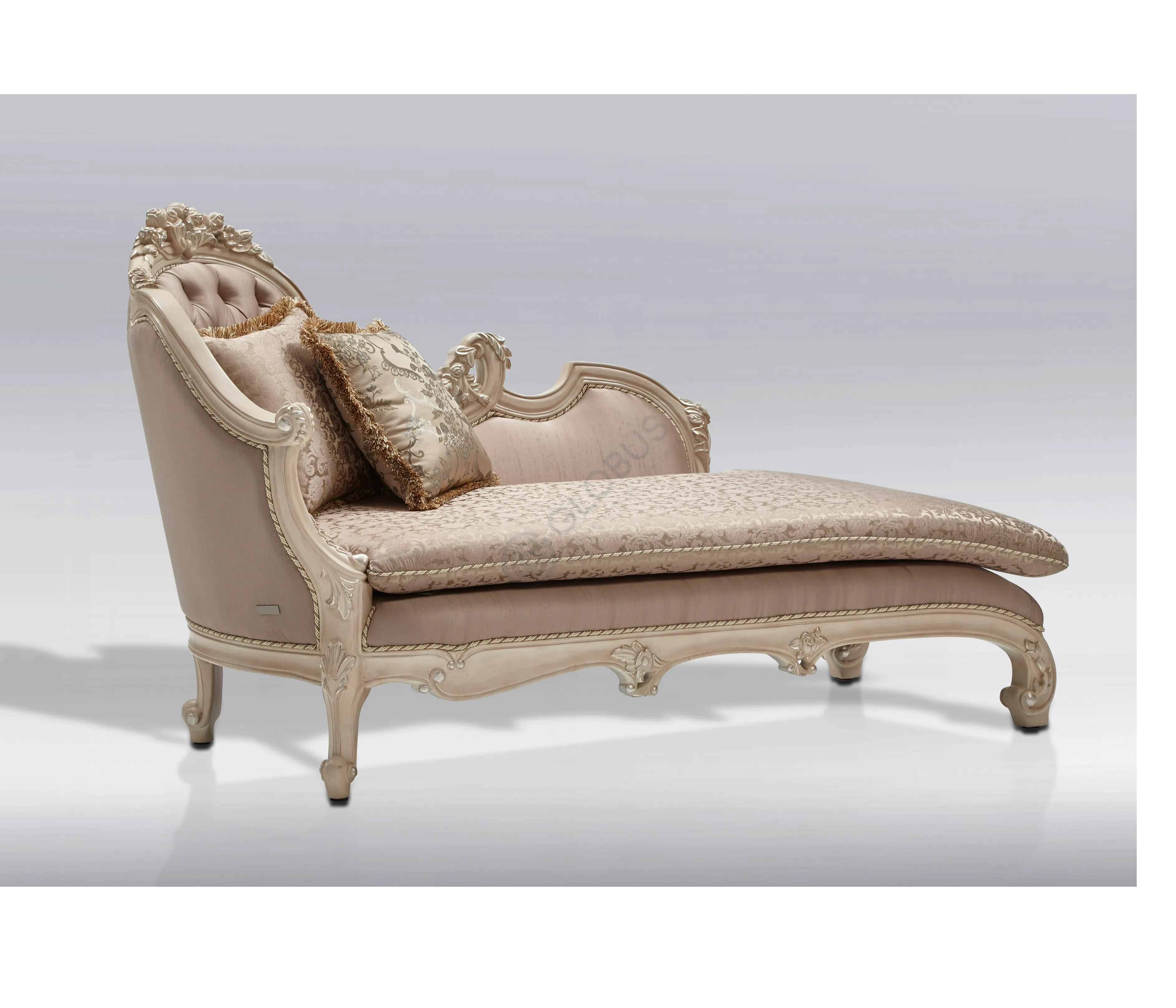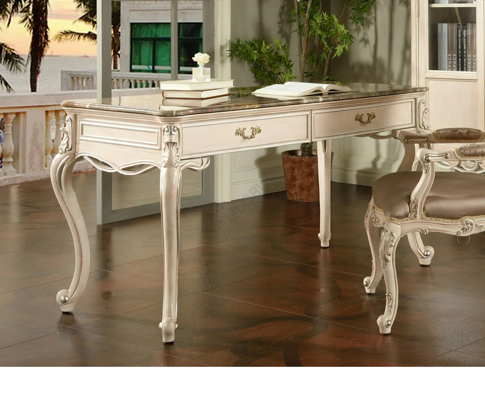 Каркас выполнен из натурального дерева, его формы плавны и утонченны. Деликатная патина придает поверхности легкий налет старины, подчеркивая глубину резных элементов и изящных ножек.