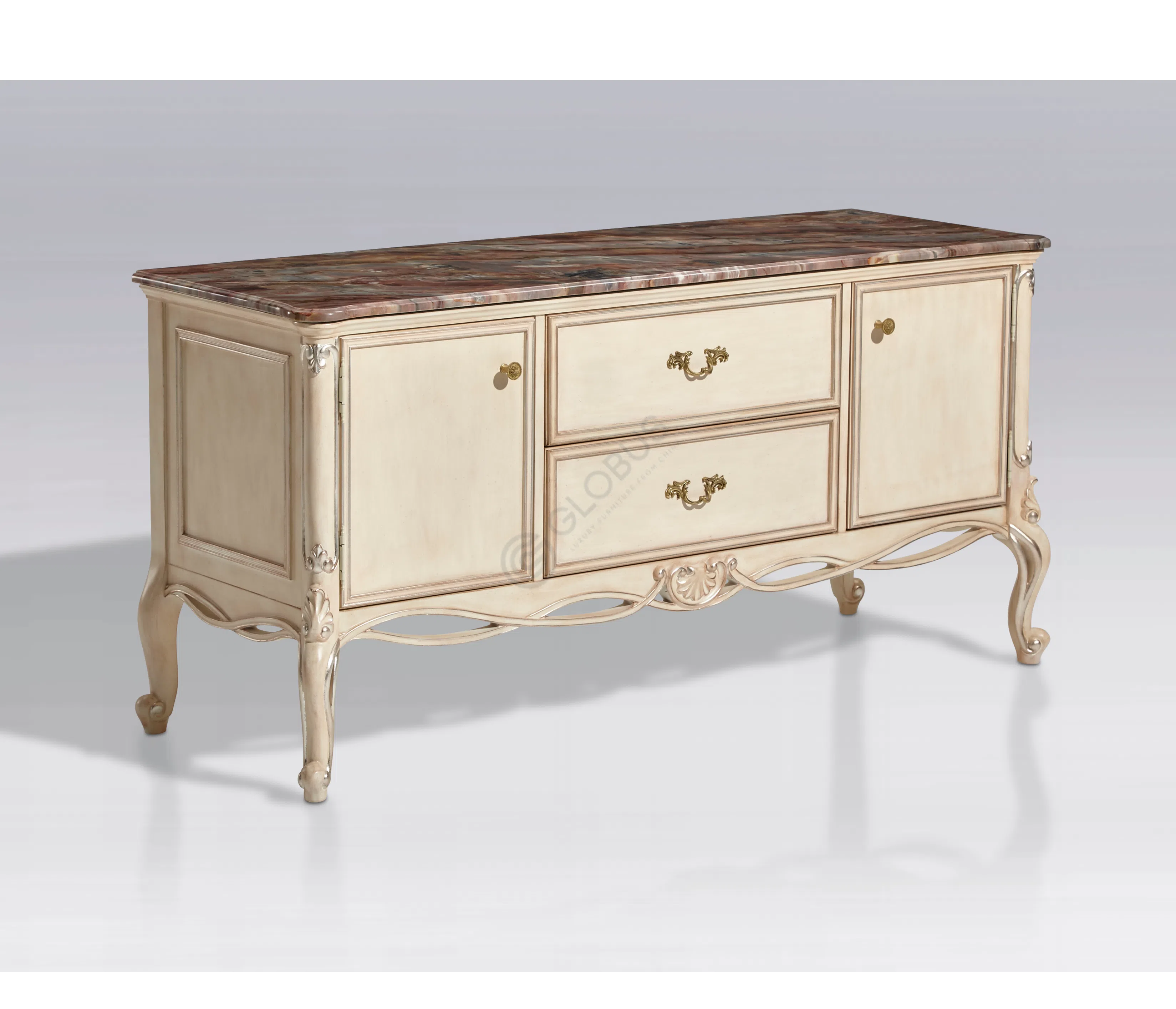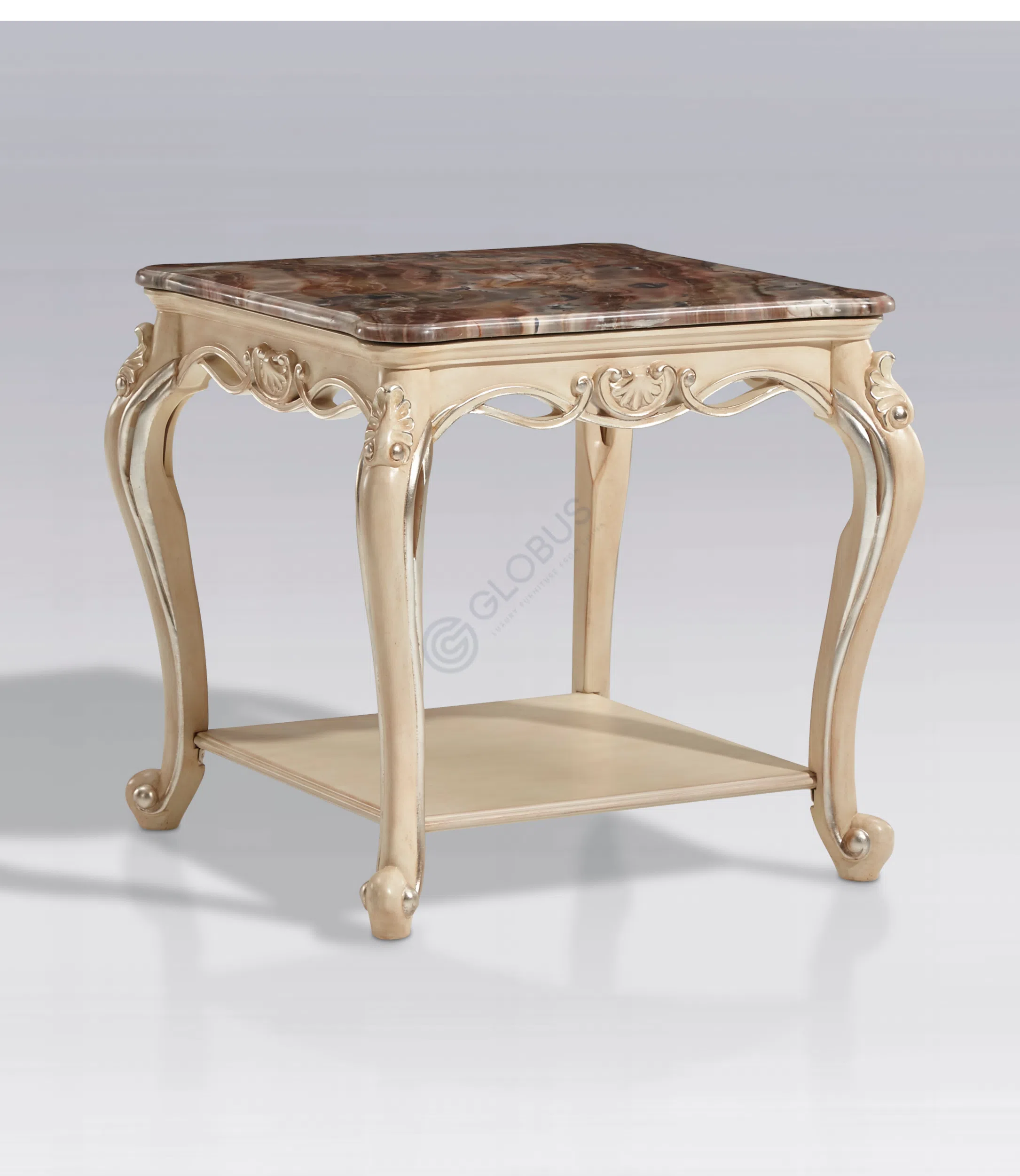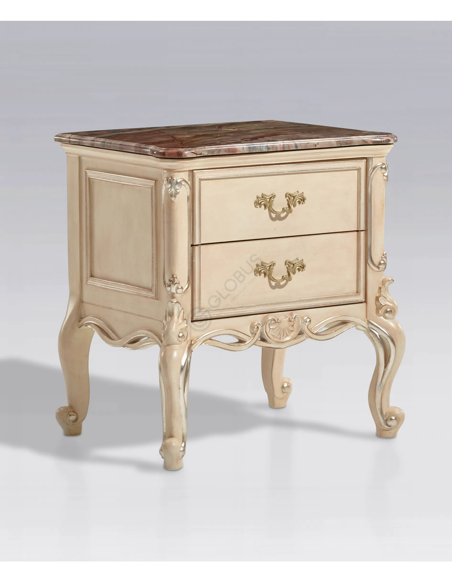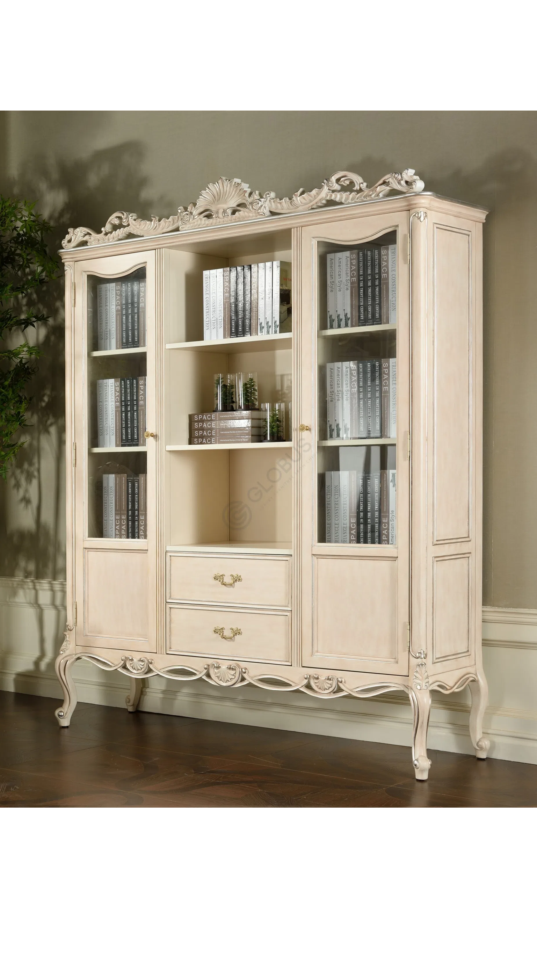 Каркас выполнен из натурального дерева, его формы плавны и утонченны. Деликатная патина придает поверхности легкий налет старины, подчеркивая глубину резных элементов и изящных ножек.