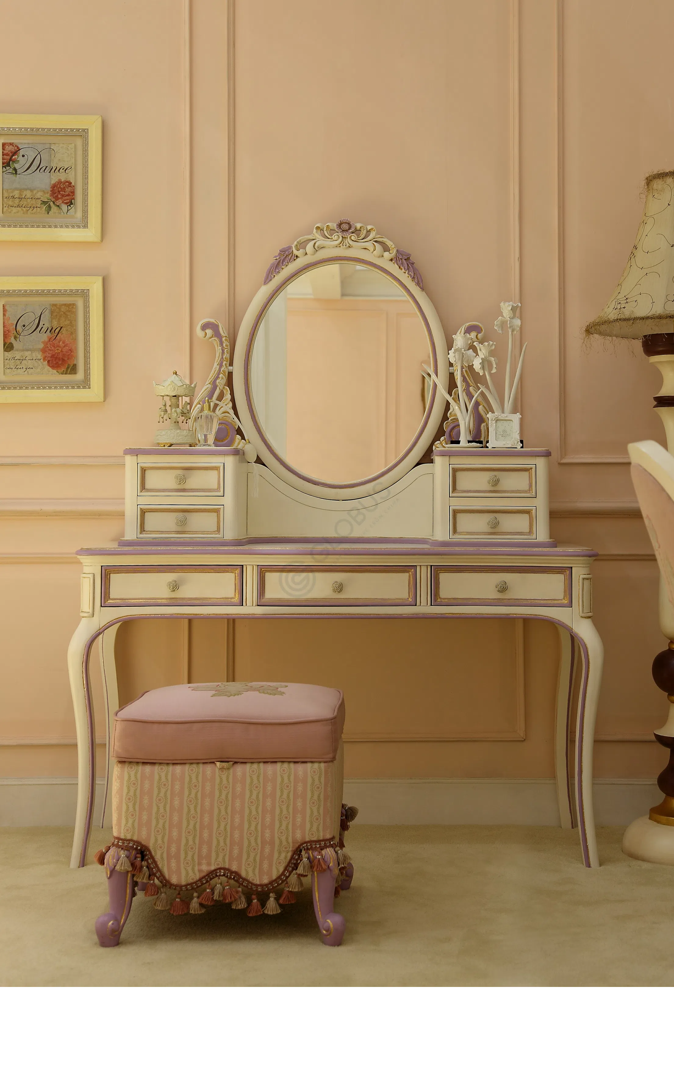 В облике этого рабочего места ярко выражен неоклассический стиль, который идеально подходит для оформления роскошного и уютного интерьера детской. Он не просто служит местом для занятий, но и выступает как ключевой декоративный элемент, воспитывающий чувство прекрасного и создающий по-настоящему особенное пространство.