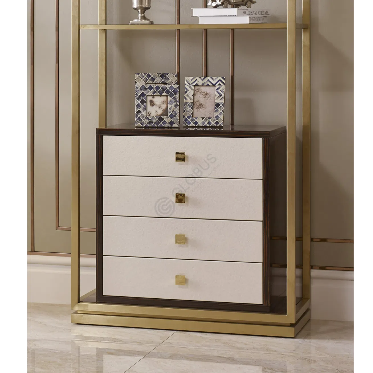 В его изготовлении применяются натуральное дерево, фанера, шпон и элементы из нержавеющей стали. Темный глянцевый каркас с вертикальным текстурным узором шпона создает эффектный контраст со светлыми фасадами выдвижных ящиков. Верхний ящик выделяется шпоном с изысканным геометрическим плетением, в то время как нижний демонстрирует красоту природной текстуры дерева. Металлические ручки квадратной формы добавляют финальный штрих.