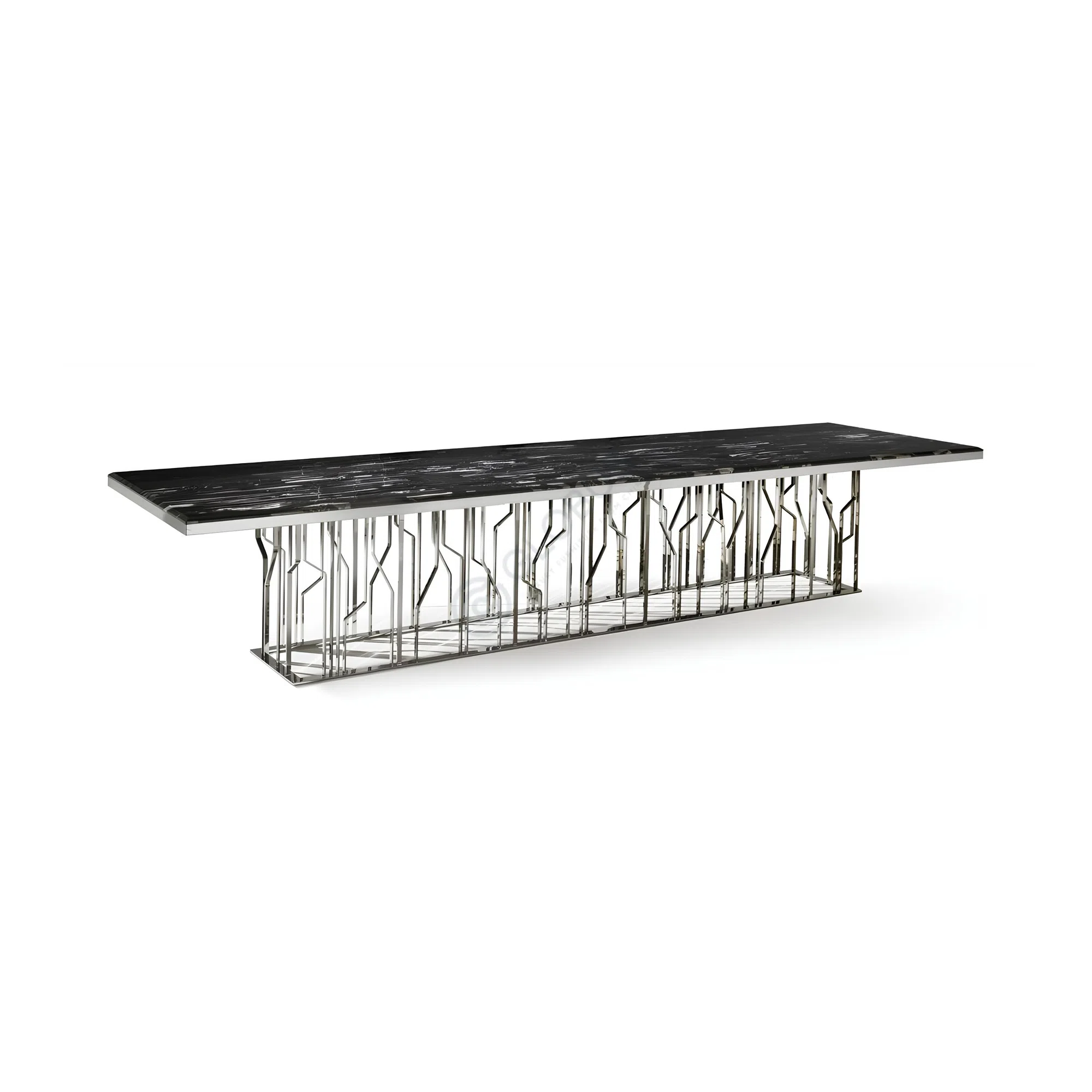 Этот изысканный предмет мебели представляет собой идеальное сочетание стиля и функциональности. Взгляд сразу привлекает его основание, выполненное из блестящей нержавеющей стали с отделкой под золото. Геометрический узор опоры, напоминающий стилизованные ветви или переплетающиеся линии, придает изделию особую легкость и воздушность.