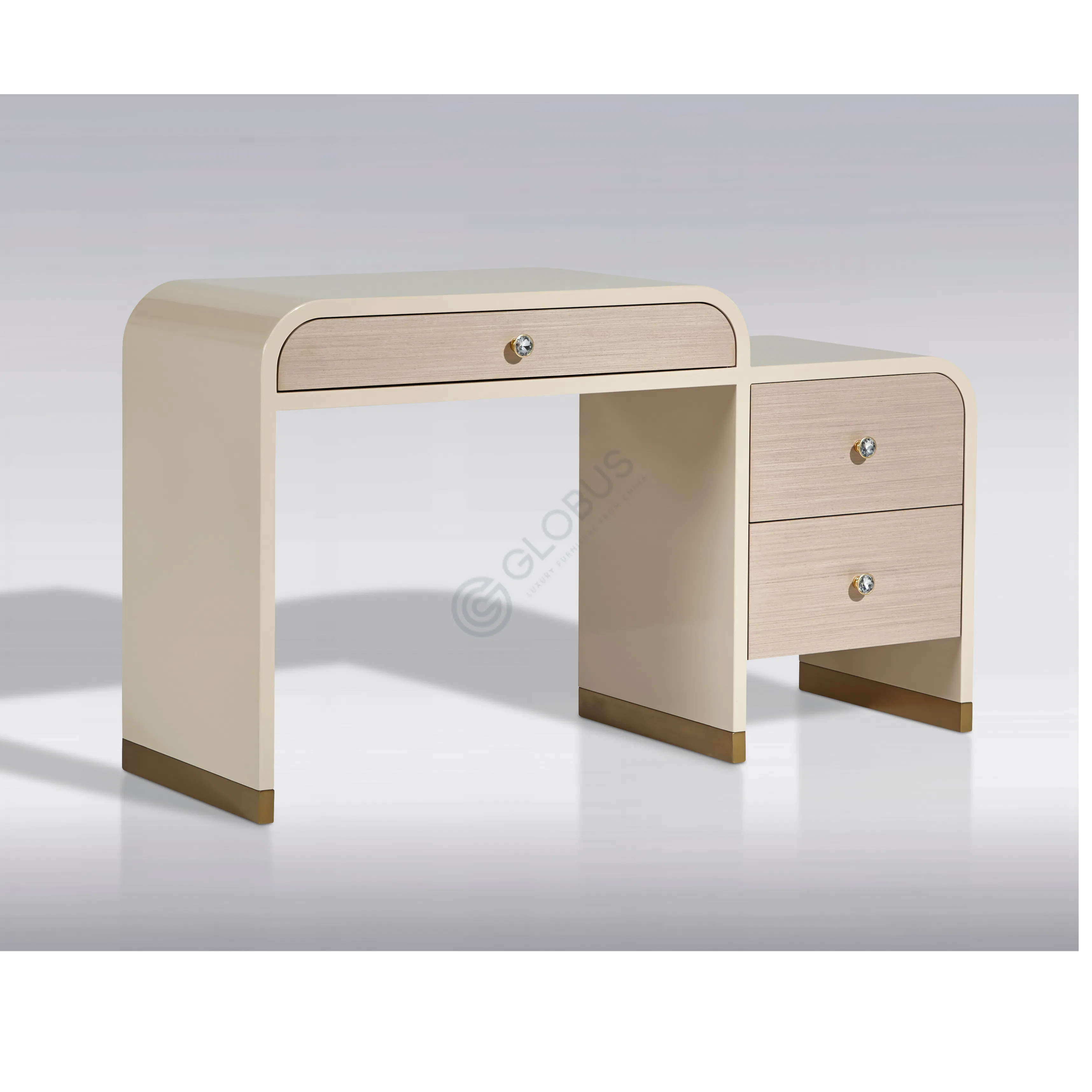 Стиль столика сочетает современные линии и элементы, характерные для ар-деко. Изогнутые боковые панели и контурные металлические вставки подчеркивают его уникальный дизайн. Каждая деталь продумана, чтобы создать образ роскоши и вневременной элегантности.