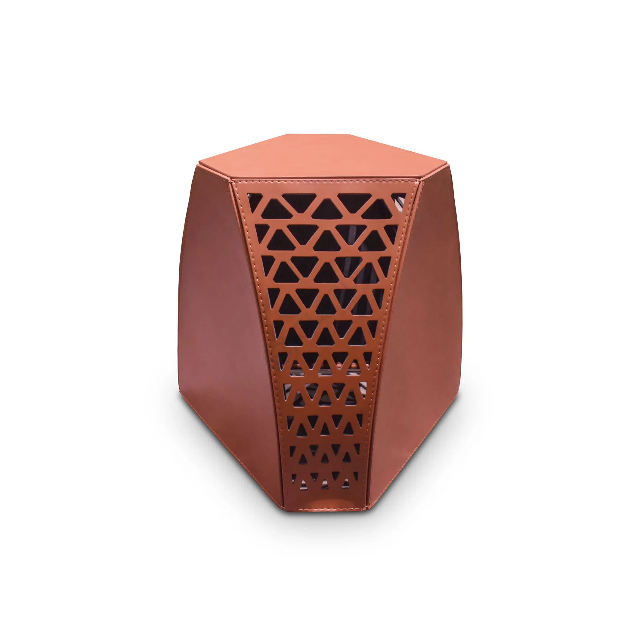 Визуальный облик изделия построен на интересном контрасте гладких поверхностей насыщенного цвета и секций с ажурным геометрическим орнаментом. Этот узор создает игру света и тени, придавая табурету динамичность и изысканность. Такая детализация подчеркивает уникальность его архитектурной формы.