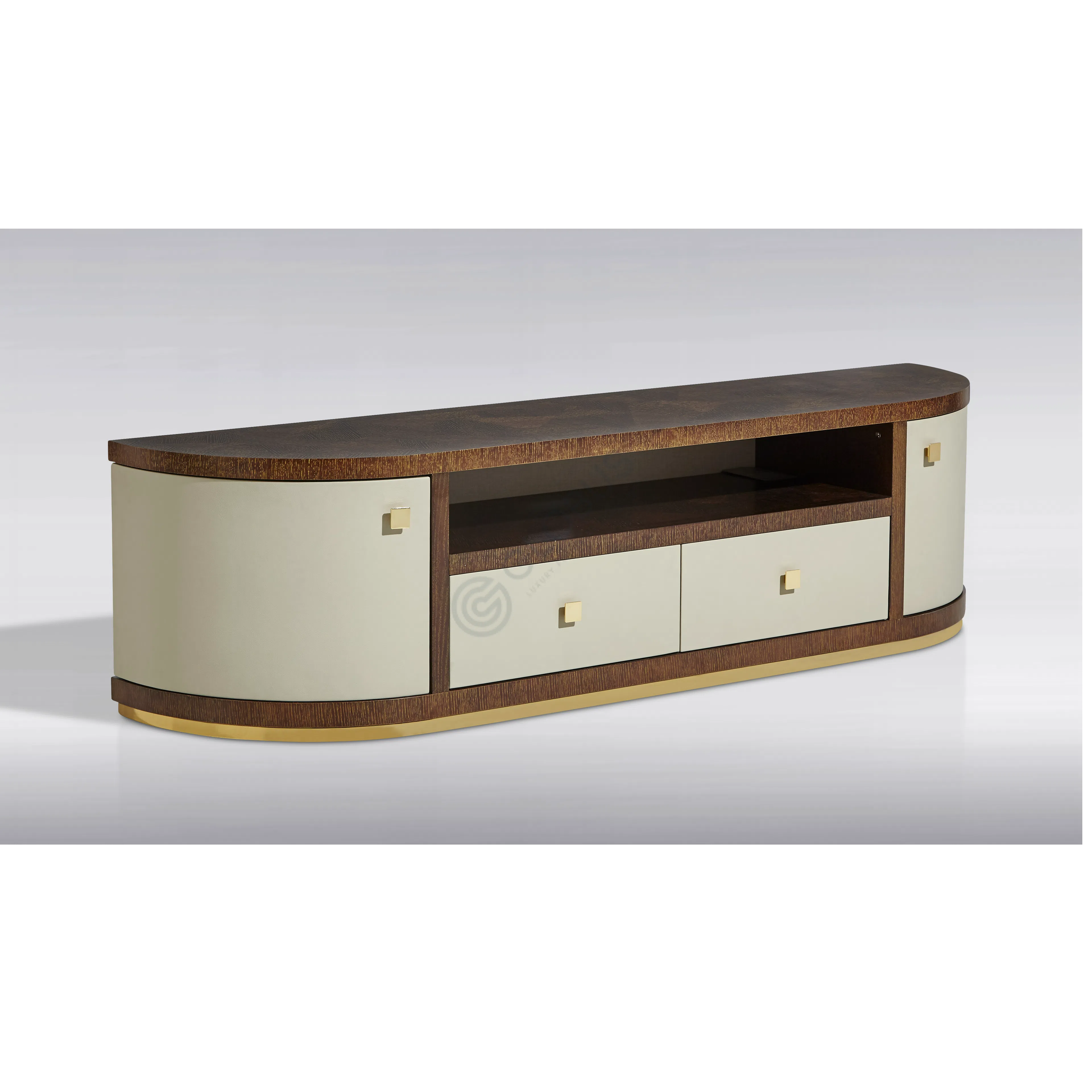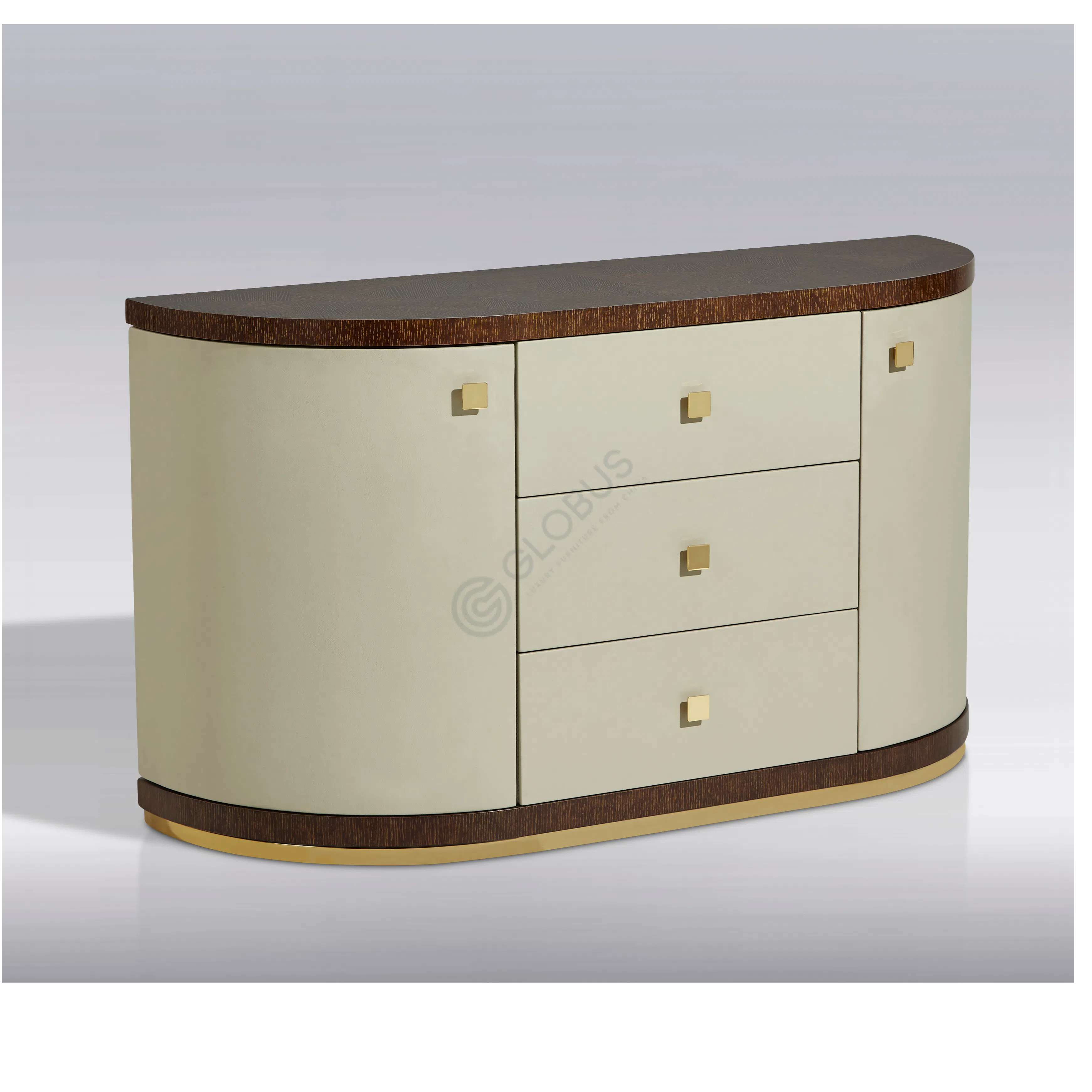 Его облик строится на гармоничном сочетании натурального дерева и изысканных отделок. Столешница, выполненная из шпона на прочной основе из натурального дерева и фанеры, демонстрирует благородную текстуру. Фасад и боковые части облицованы мягкой экокожей на микрофибре, добавляя тактильного комфорта и визуальной гладкости.