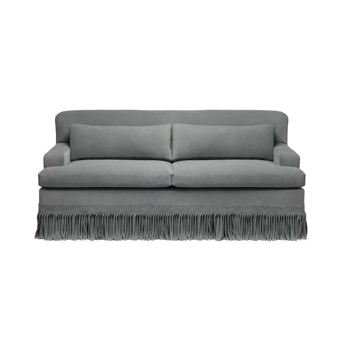 Внимание привлекает уникальное оформление нижней части: декоративная бахрома, выполненная из того же материала, что и основная обивка, создает эффект легкости и движения. Этот элемент подчеркивает индивидуальность дизайна, добавляя изысканную деталь в общий облик.