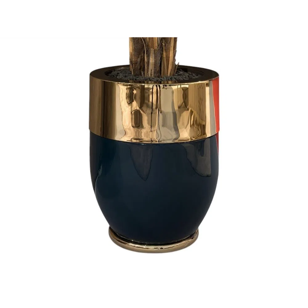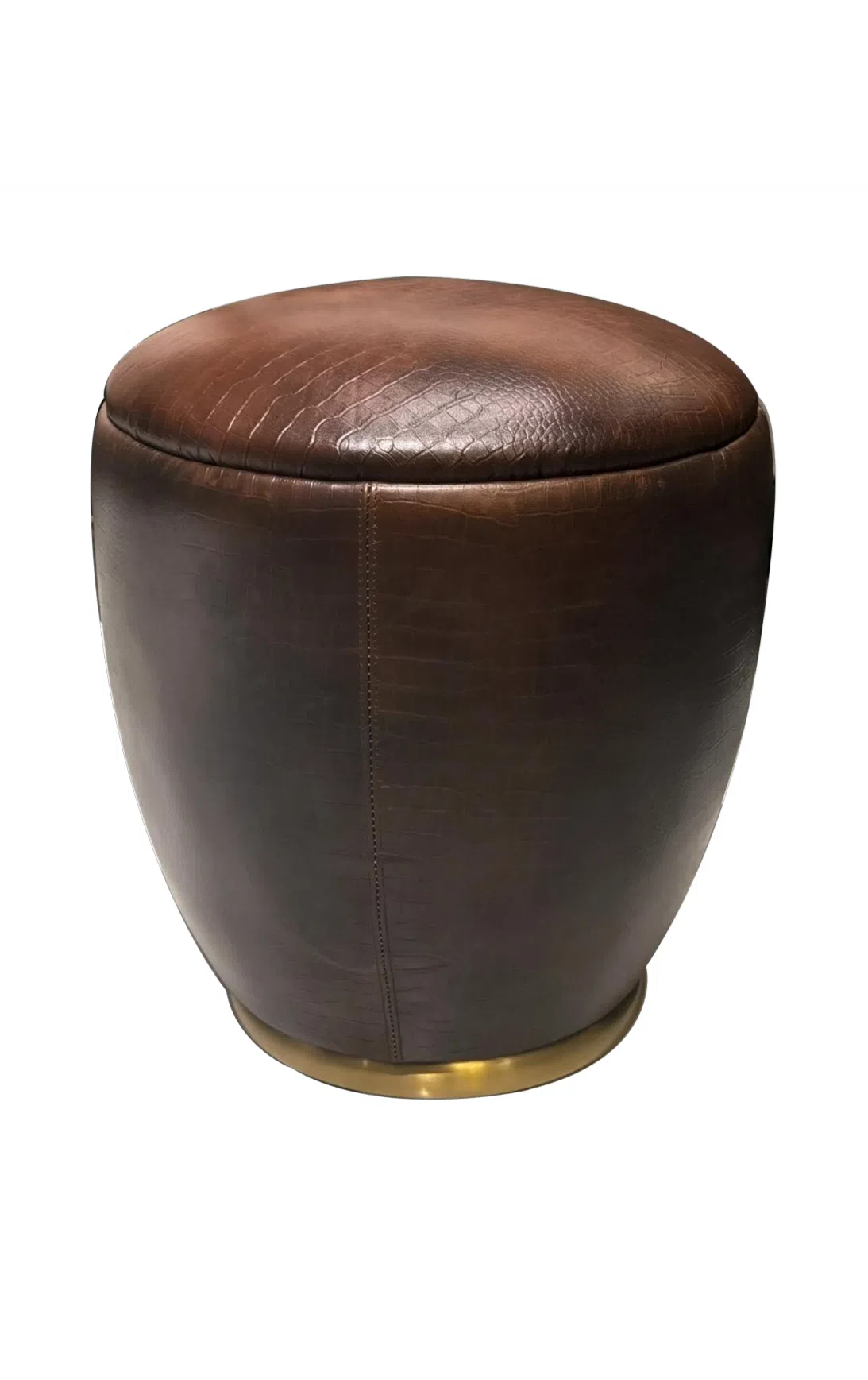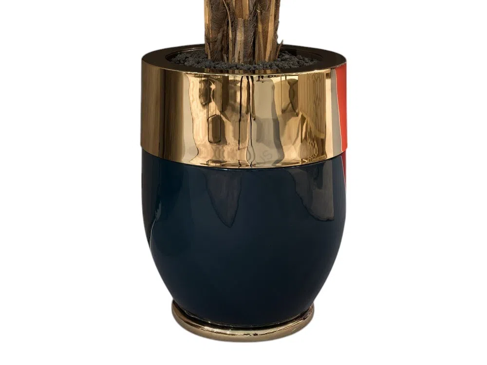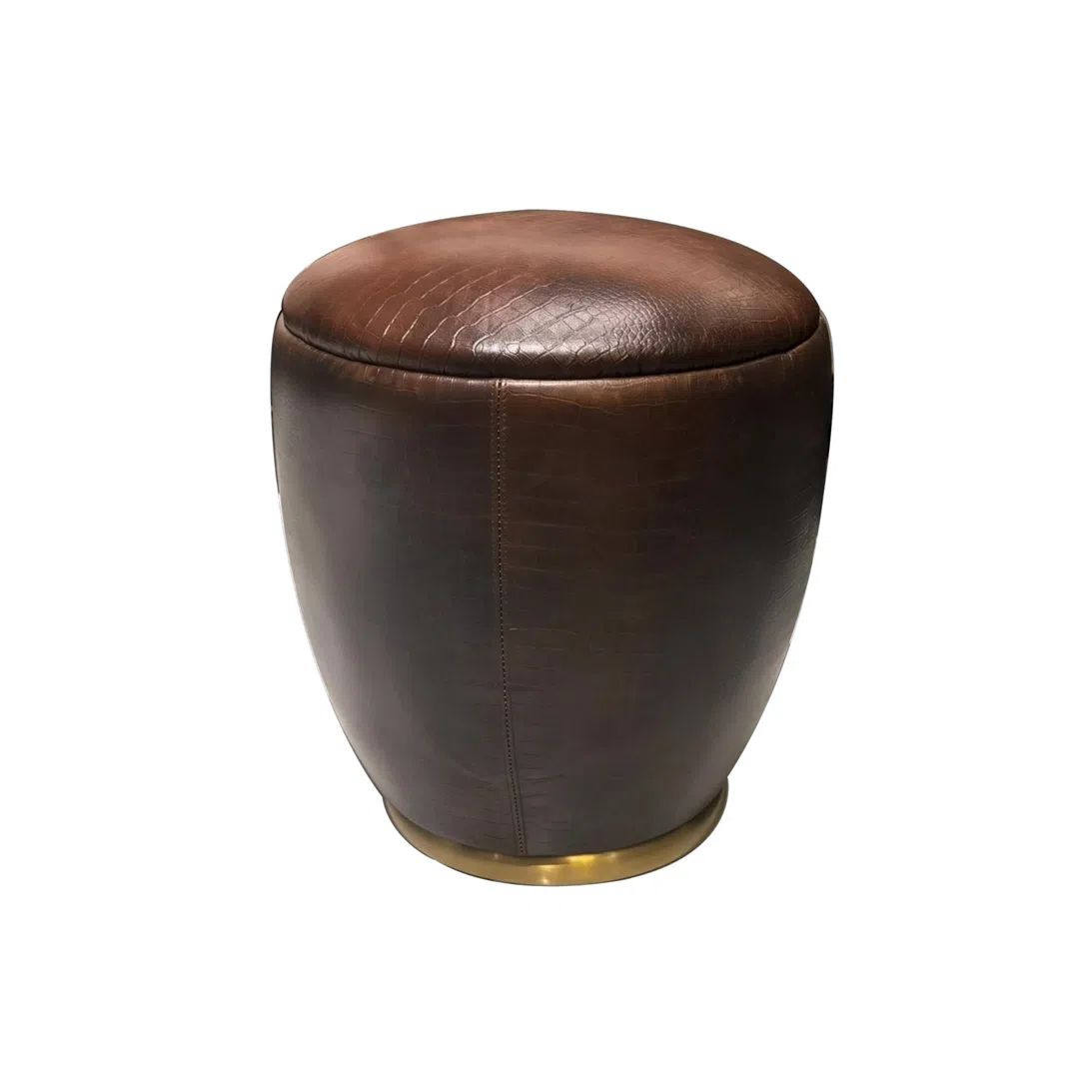 Столик округлой формы построен на основе из натурального дерева, обтянутой замшей спокойного оттенка с легким геометрическим рисунком. Верхняя поверхность из нержавеющей стали с зеркальной полировкой отражает свет, подчеркивая строгий силуэт изделия. Широкая стальная кромка по периметру основания задаёт чёткий контур и визуальный баланс.