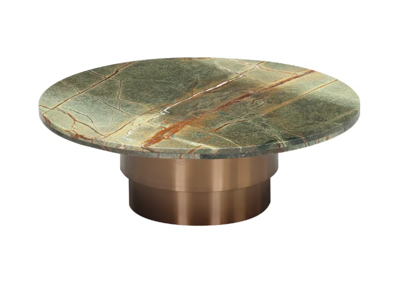 Основание этого элегантного углового столика выполнено из прочной нержавеющей стали с полированным оттенком бронзы, обеспечивая надежную стабильность и современный блеск в любом пространстве. Изящный верхний слой из натурального мрамора с его уникальным рисунком добавляет неповторимый элемент класса и роскоши, в то время как зеленые оттенки камня наполняют изделие глубиной и природной красотой. Дизайн столика сочетает в себе функциональность и скульптурный силуэт, делая его не просто местом для размещения предметов, но и выразительным акцентом в интерьере. Подходит для размещения рядом с креслом или диваном, этот столик предоставляет идеальную площадку для украшений, напитков или книг, при этом не занимая много места.