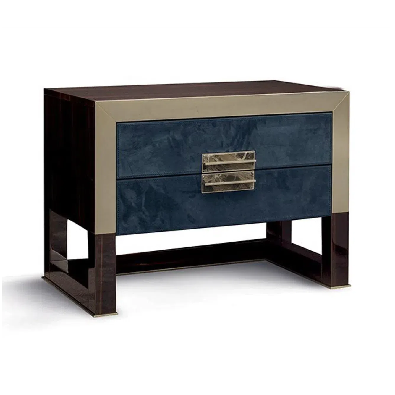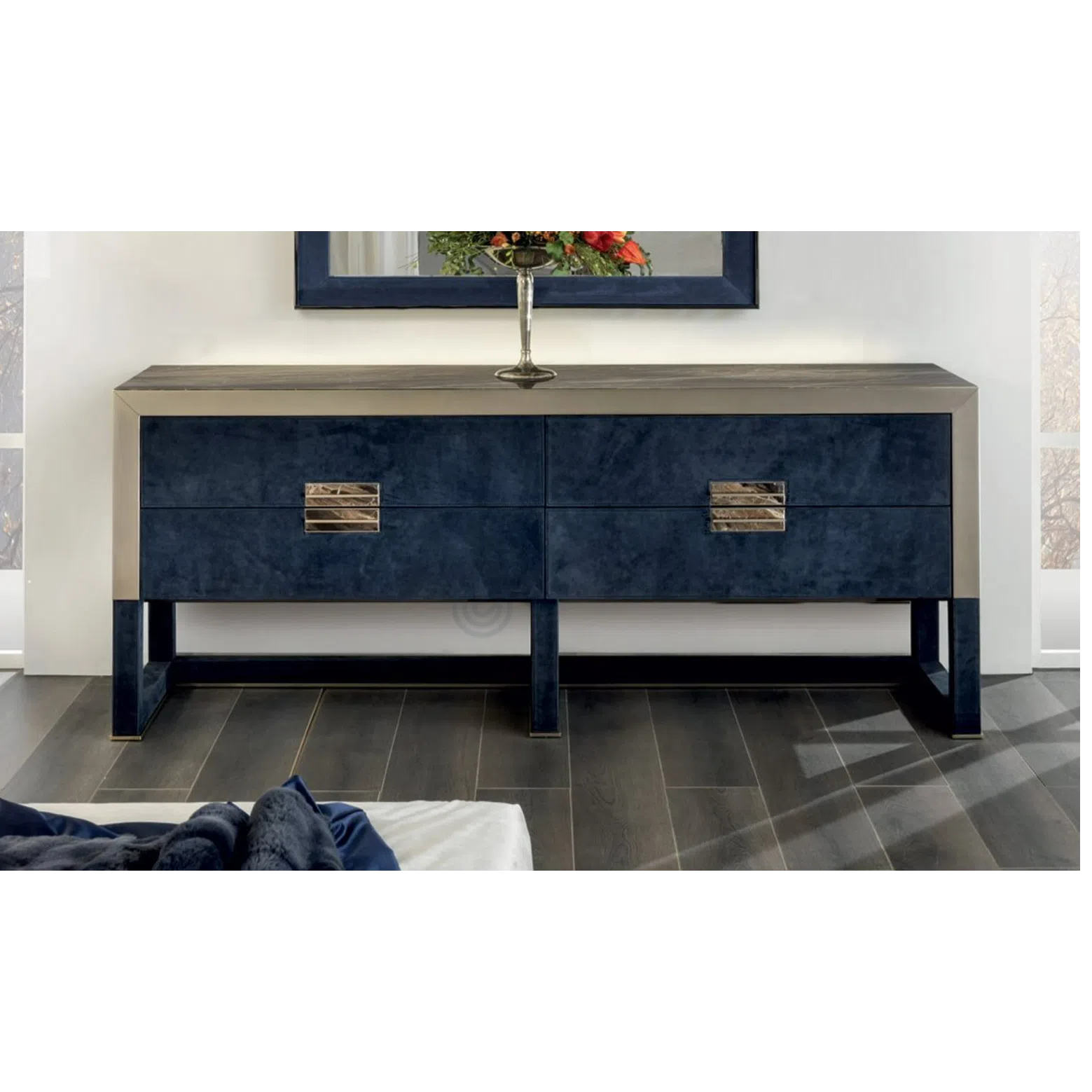 Вершина этого предмета мебели украшена плитой из светлого мрамора с характерными прожилками, которая придает поверхности благородный вид. Основание и ящики обтянуты мягкой экозамшей глубокого синего оттенка, создавая приятную на ощупь текстуру и выразительный цветовой контраст.