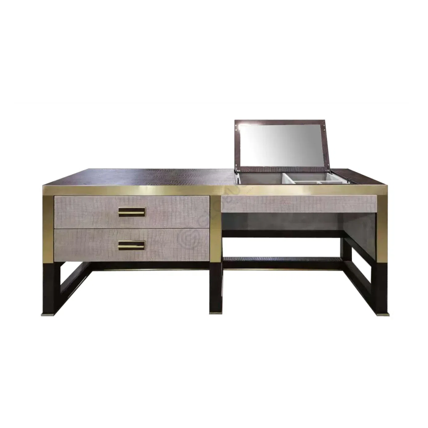 Детали из полированной нержавеющей стали теплого золотистого тона элегантно обрамляют столешницу и подчеркивают линии фасадов с минималистичными ручками. Надежная конструкция, выполненная из натурального дерева и фанеры, обеспечивает долговечность и устойчивость, делая этот столик не только красивым, но и функциональным элементом интерьера. Встроенные ящики предлагают удобное пространство для хранения различных мелочей.