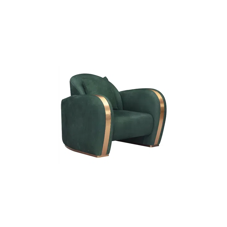 Обивка выполнена из приятной на ощупь экозамши глубокого оттенка, что придает изделию особую мягкость и визуальную привлекательность. В конструкции использованы благородные материалы: прочный каркас из натурального дерева и фанеры обеспечивает долговечность, а декоративные элементы из нержавеющей стали, выполненные в теплом золотистом тоне, добавляют нотку роскоши и подчеркивают утонченный дизайн.
