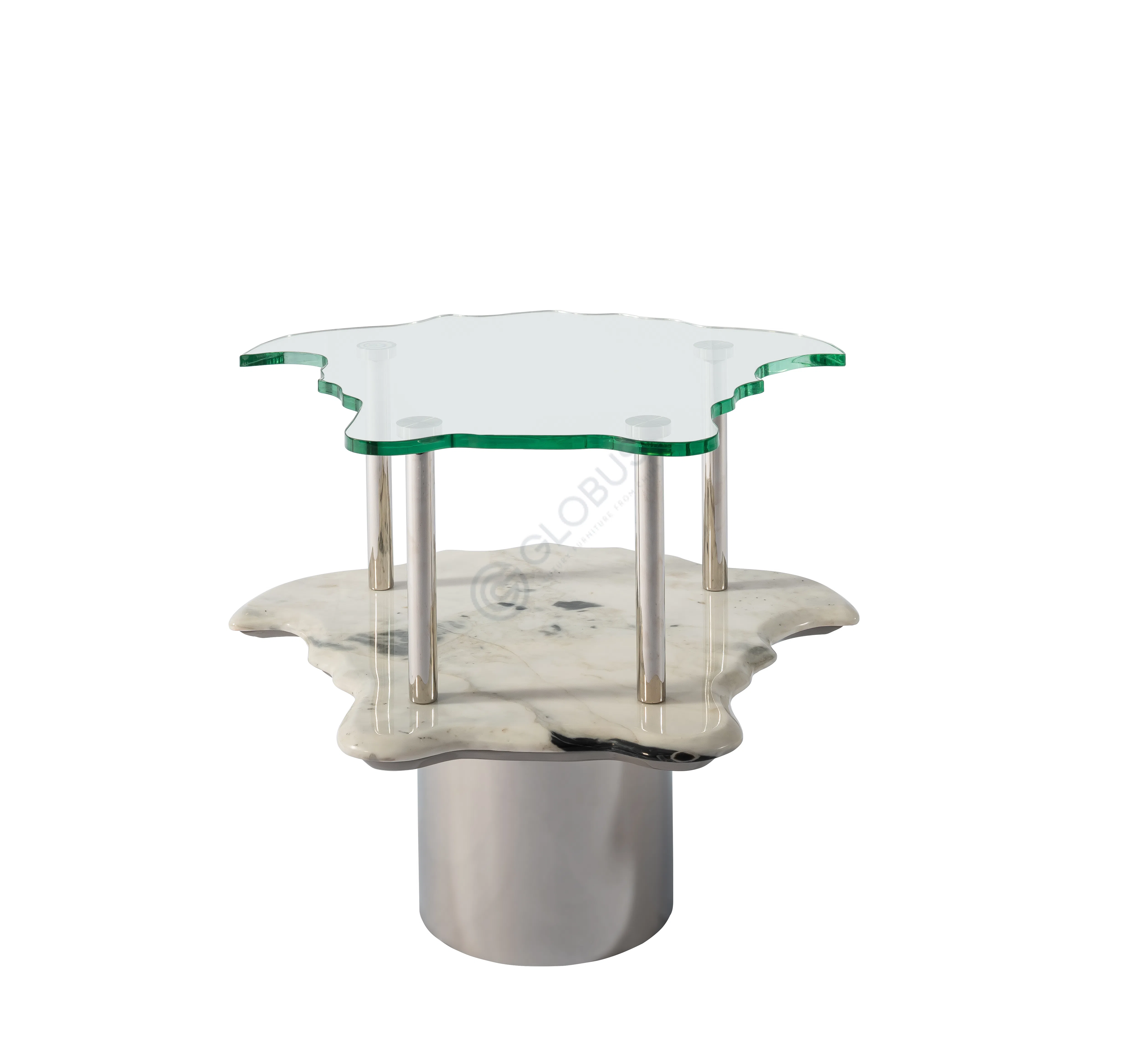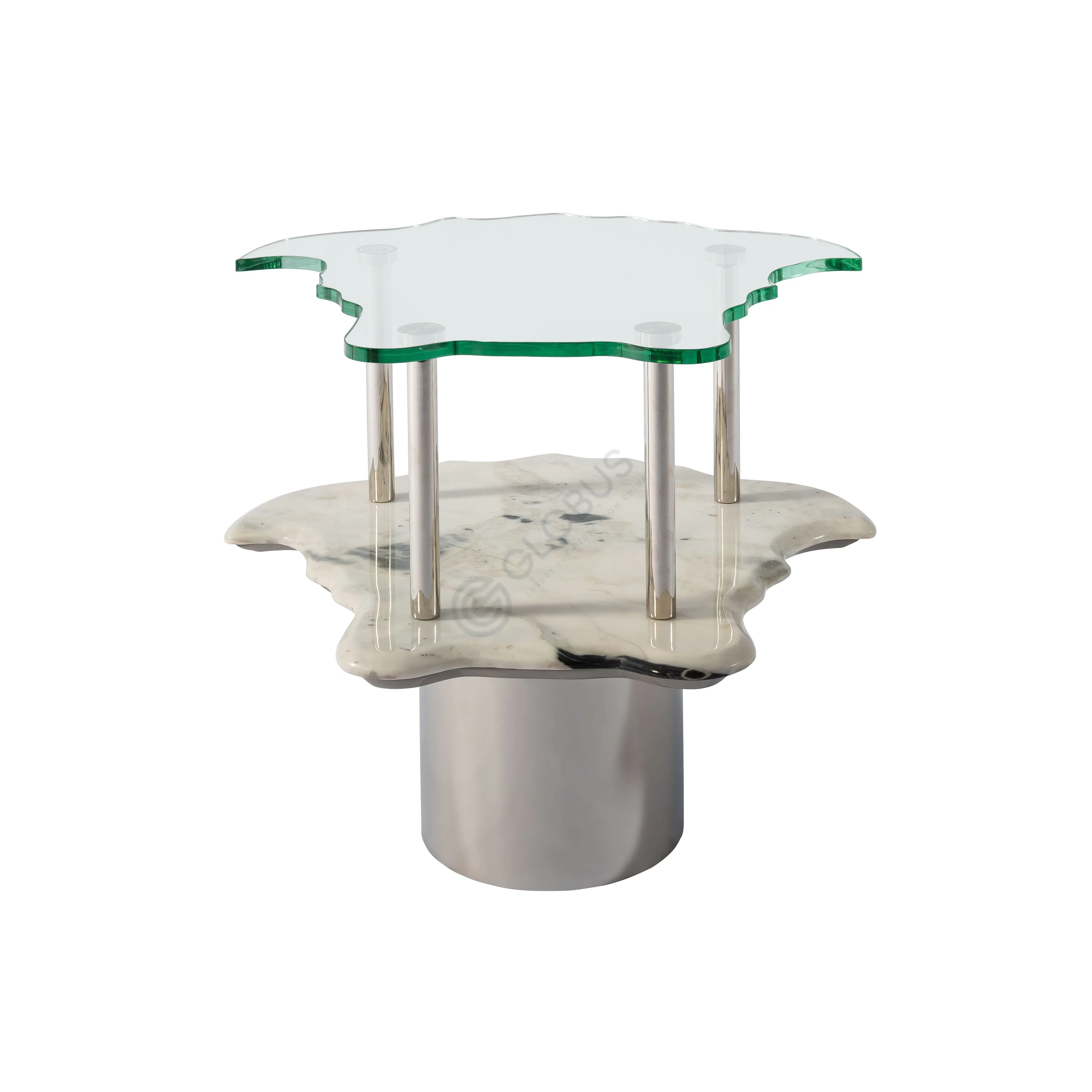 Мастерски скомбинированные материалы формируют гармоничное целое. Нижний ярус из натурального мрамора демонстрирует богатство природных узоров и глубокую текстуру, каждый срез которой уникален. Над ним парит верхняя столешница из прозрачного стекла, вторящая форме мраморного основания, но придающая конструкции легкость и воздушность. Эти два уровня элегантно соединены тонкими опорами из полированной нержавеющей стали, чей сдержанный блеск идеально дополняет благородство камня и прозрачность стекла.