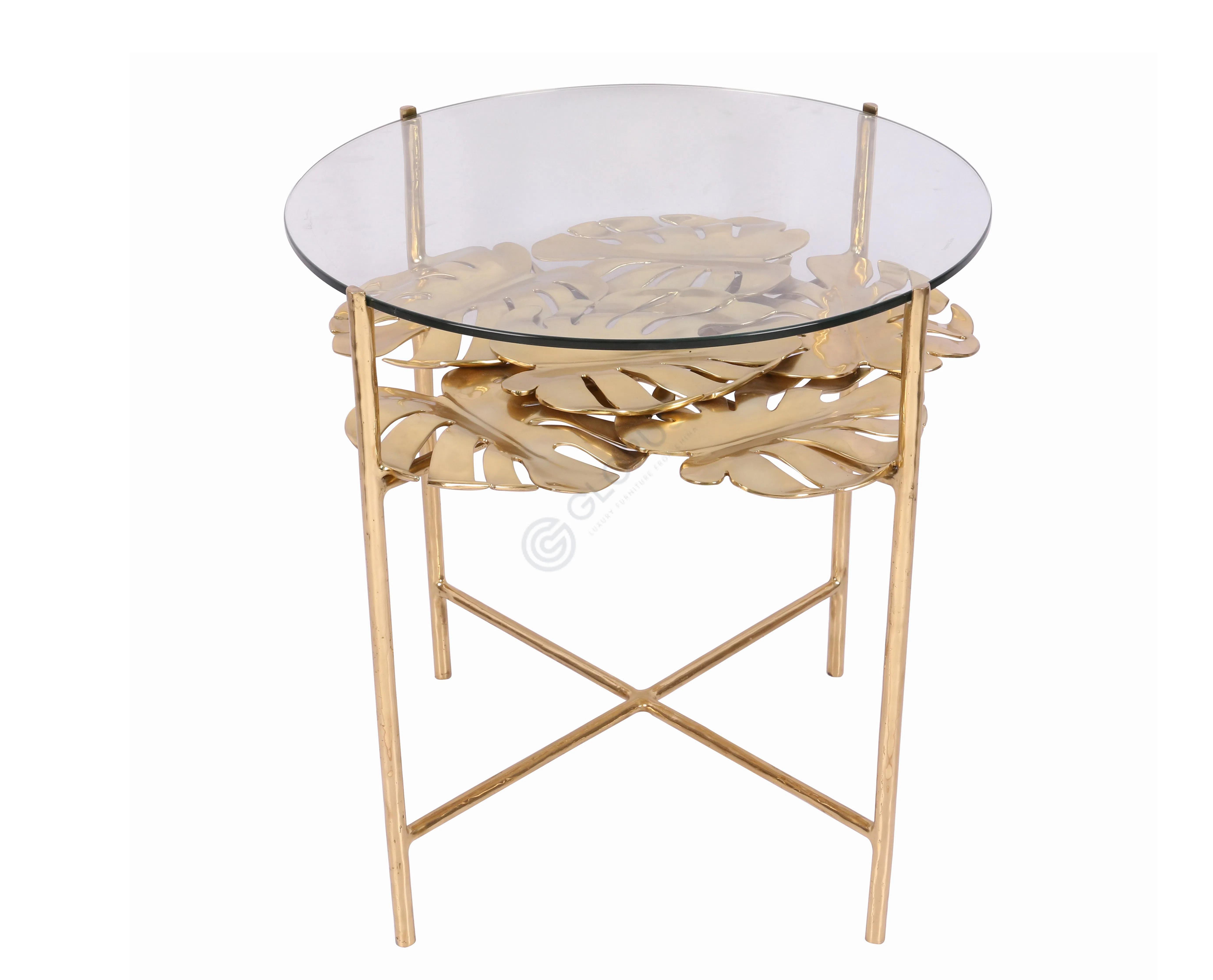 Основная поверхность представляет собой круглое полотно из прочного стекла, открывающее вид на уникальный декоративный элемент. Под прозрачной столешницей расположен искусный узор из металлических элементов в форме листьев, который придает предмету особую выразительность и легкость. Этот художественный акцент гармонично сочетает черты стиля ар-деко и современного дизайна.