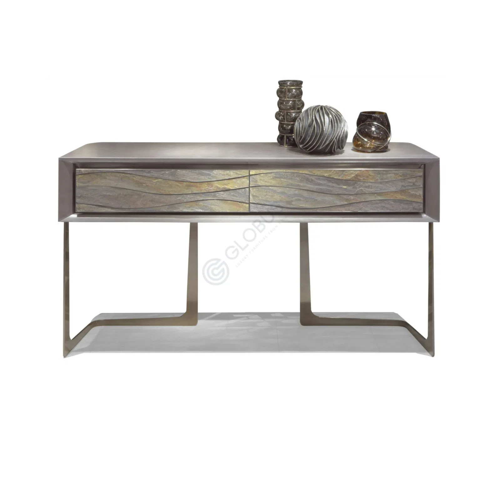 Этот великолепный буфет является истинным произведением мебельного искусства. Его фасады украшает выразительный рельеф натурального камня, напоминающий плавные волны, что придает поверхности уникальную динамику. Элегантный каркас и тонкие опоры выполнены из полированной нержавеющей стали, обеспечивая прочность и визуальную легкость конструкции.
