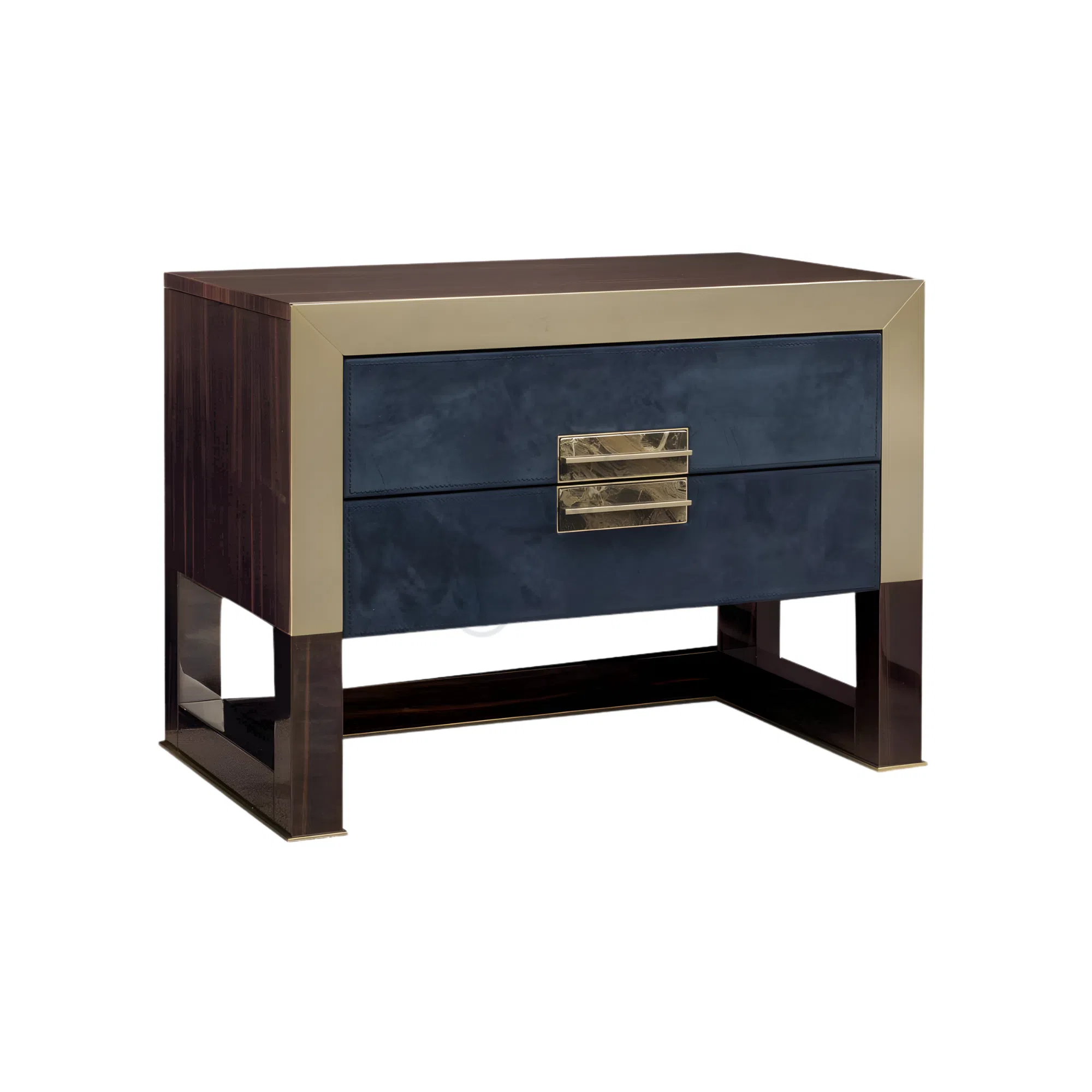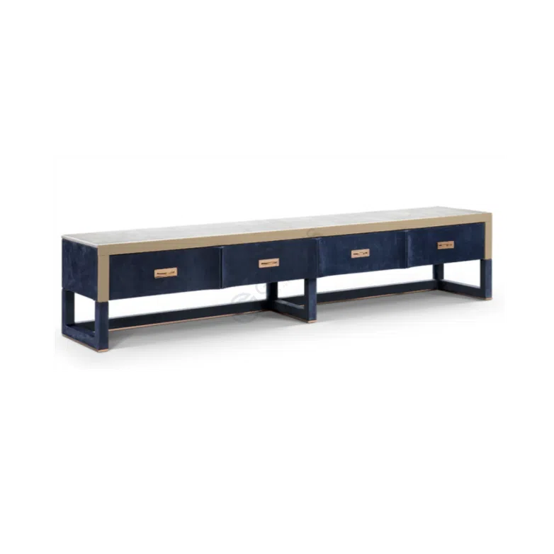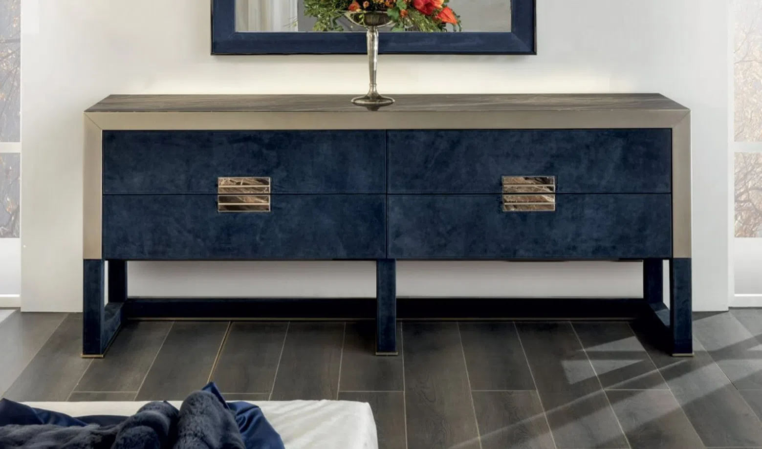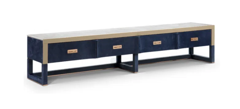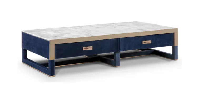 Корпус предмета мебели обтянут мягкой замшей глубокого оттенка, что придает ему неповторимую тактильность и визуальную насыщенность. Контрастное обрамление из полированной нержавеющей стали подчеркивает четкость форм и добавляет благородного сияния. Столешница выполнена из натурального мрамора, чей уникальный рисунок привносит в облик изысканность природной фактуры. В конструкции использованы натуральное дерево и прочная фанера, гарантирующие долговечность и надежность.