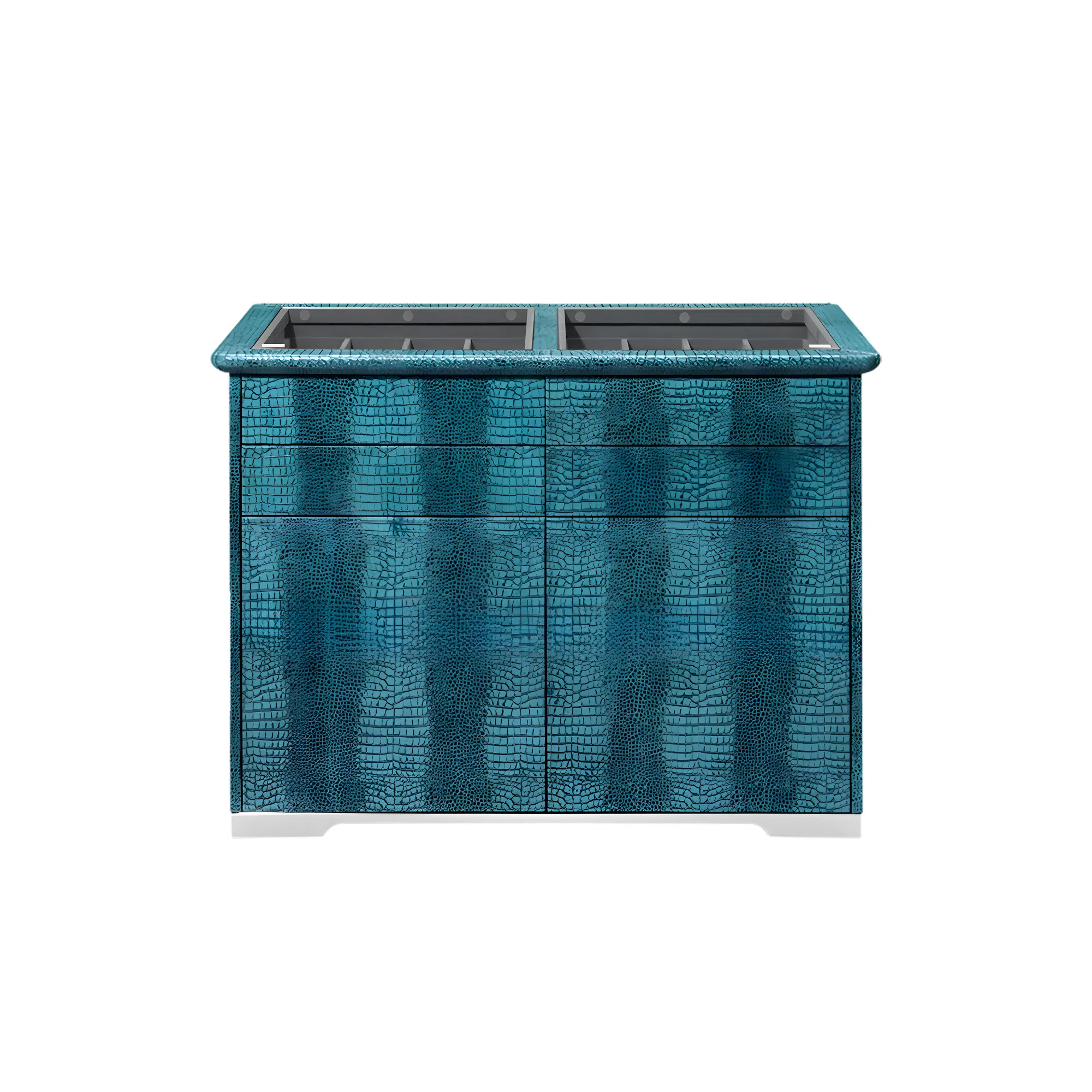 В конструкции использованы натуральное дерево и фанера, обеспечивающие прочность и долговечность каркаса. Разнообразие материалов, включая кожу и текстиль, позволяет этой банкетке легко адаптироваться к различным стилистическим решениям. Она прекрасно дополнит как современные пространства, так и интерьеры в стиле ар-деко.