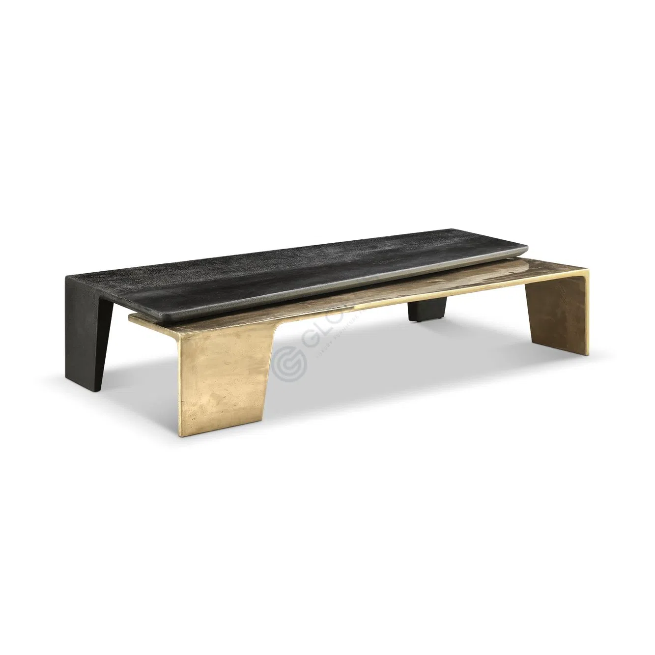 Эта консоль воплощает смелый дизайн и искусное исполнение, предлагая уникальный акцент для современного интерьера. Ее форма притягивает взгляд: асимметричное основание из металла демонстрирует игру контрастов. Одна ножка имеет выразительное золотистое покрытие с эффектом патины, создавая ощущение благородной старины. Другая часть основания выполнена в темном, почти графитовом оттенке, добавляя строгости и глубины.