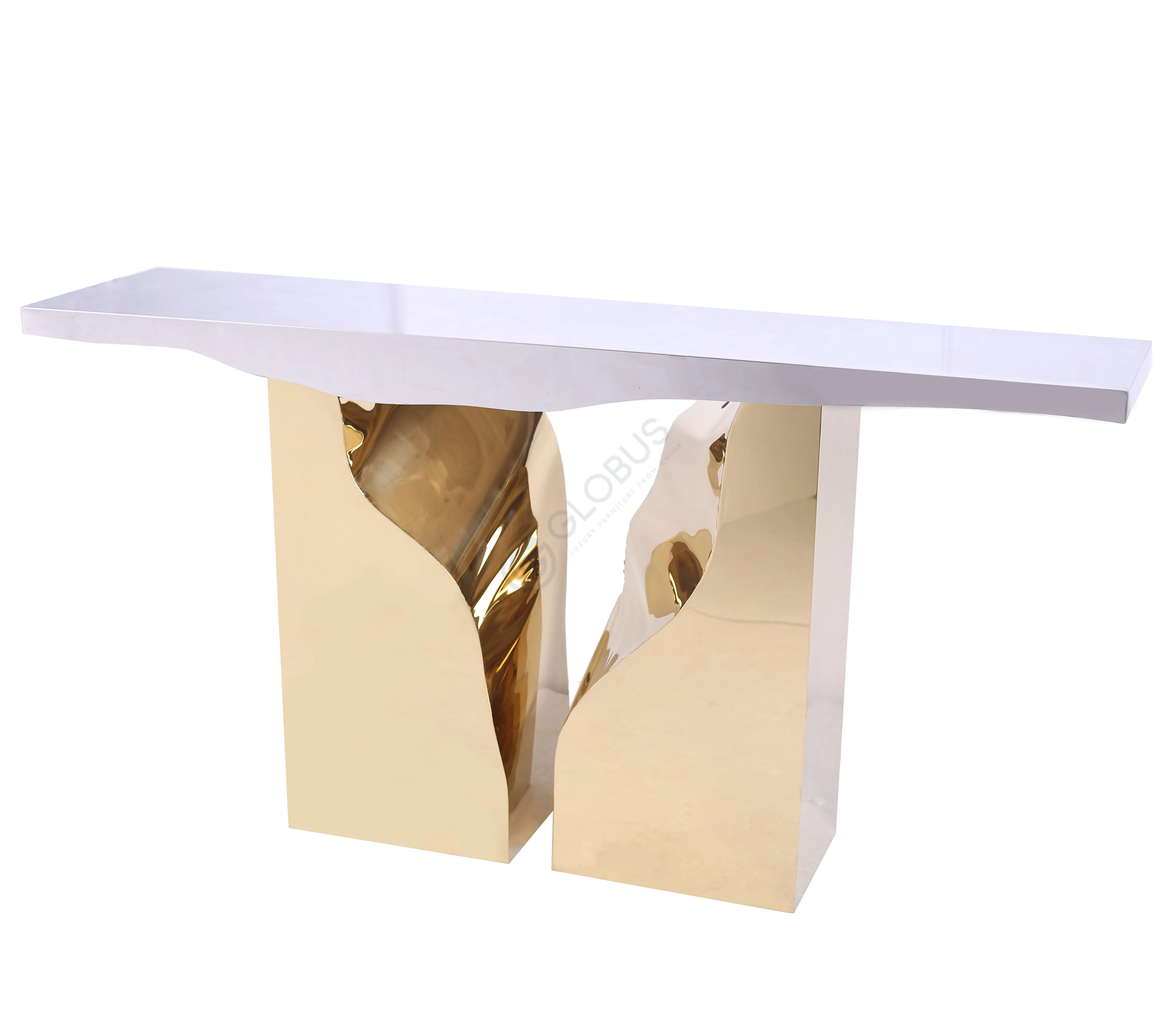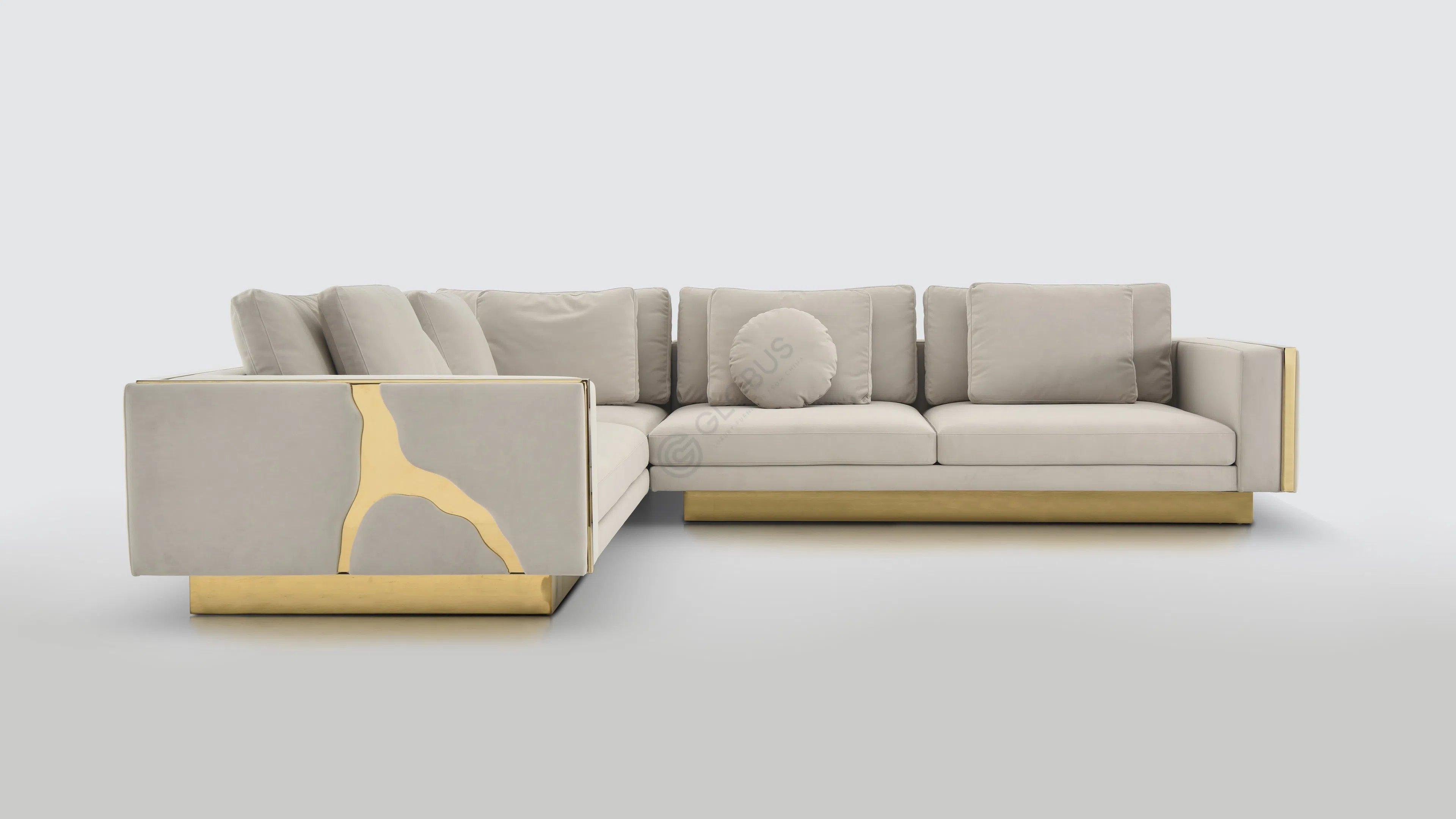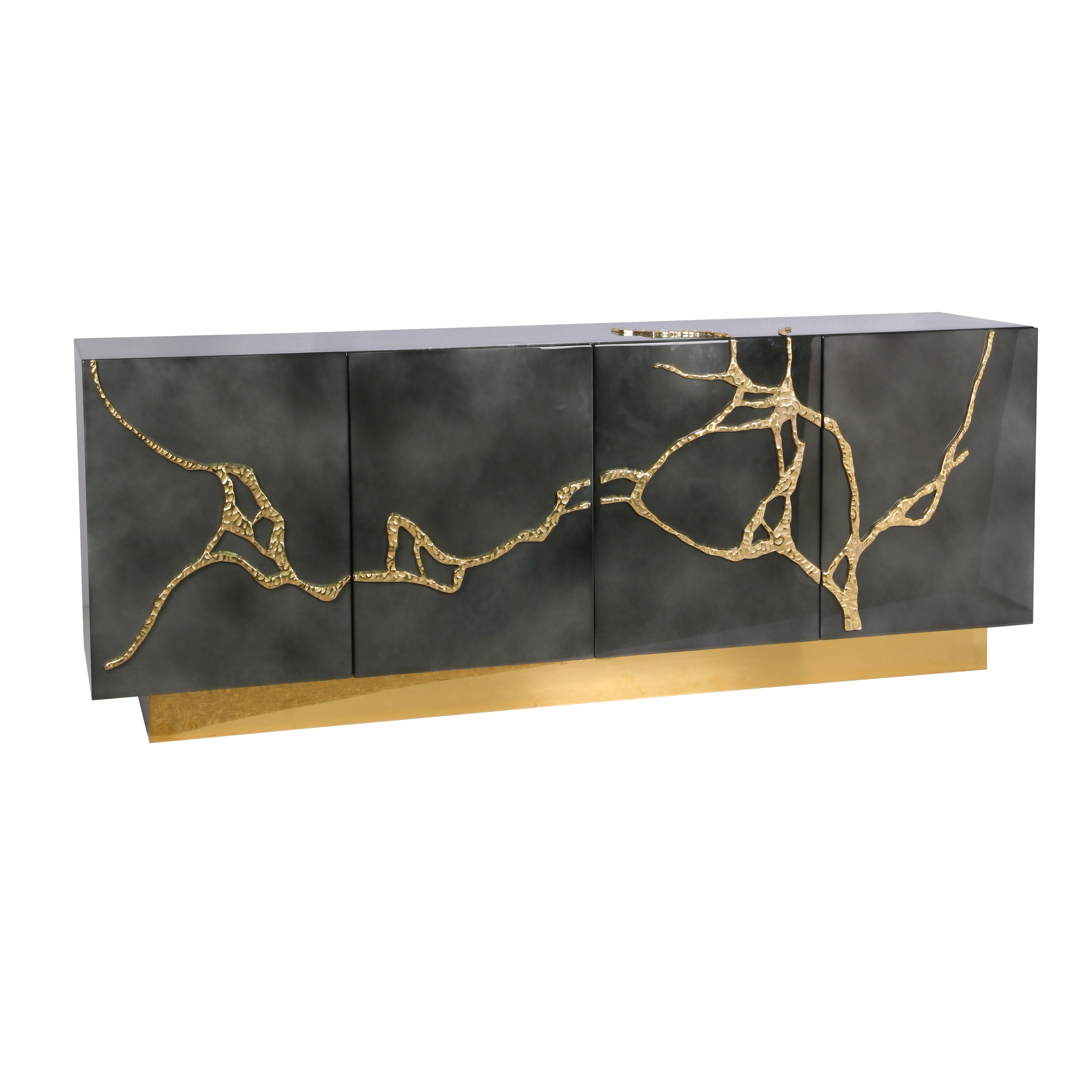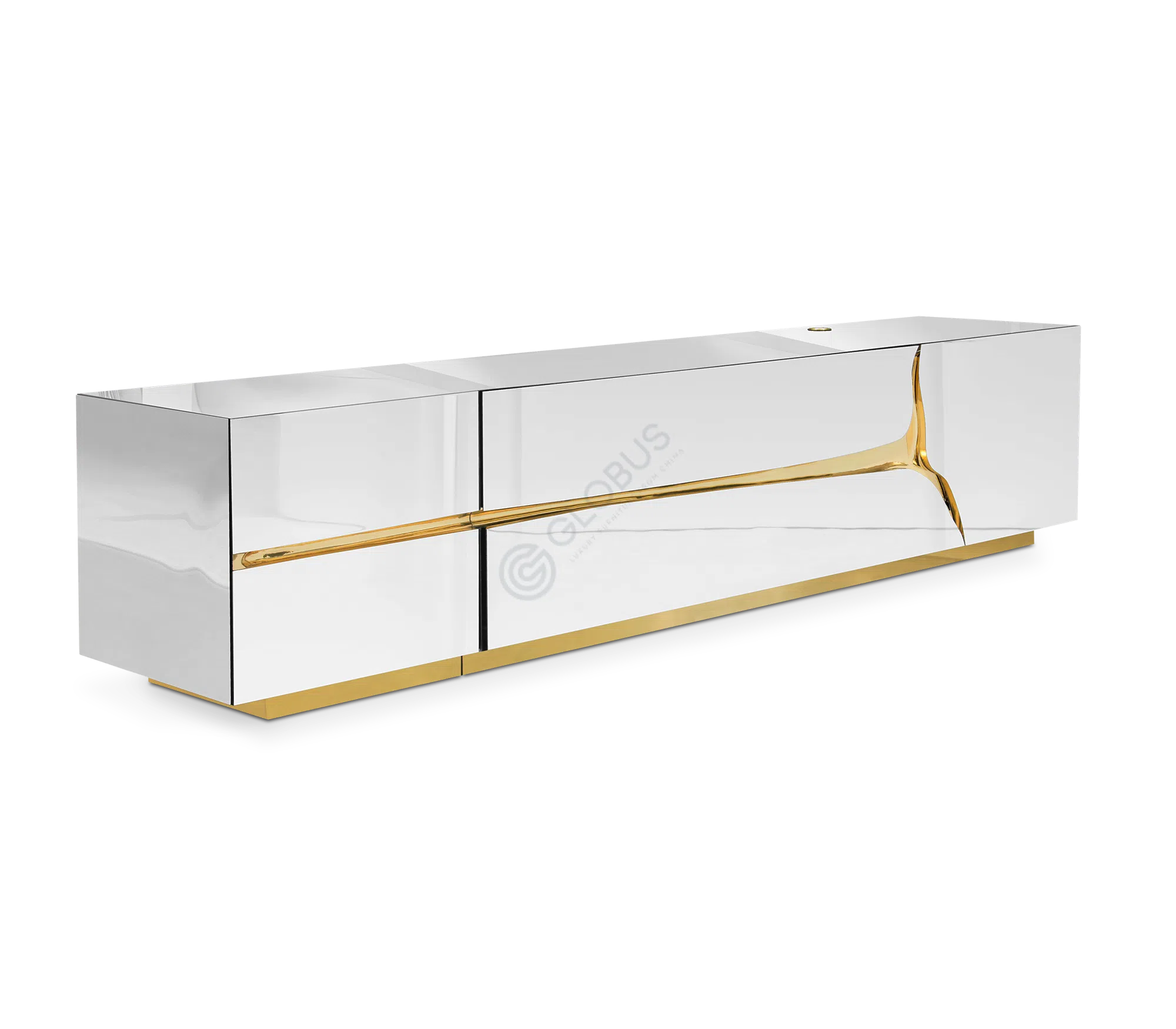 Лаконичный буфет современного силуэта с зеркальными фасадами из полированной нержавеющей стали. Пластичные золотистые разрезы, проходящие по дверцам и основанию, создают выразительный рисунок и придают облику архитектурную четкость. Приземистый цоколь визуально облегчает объем и поддерживает чистую геометрию.