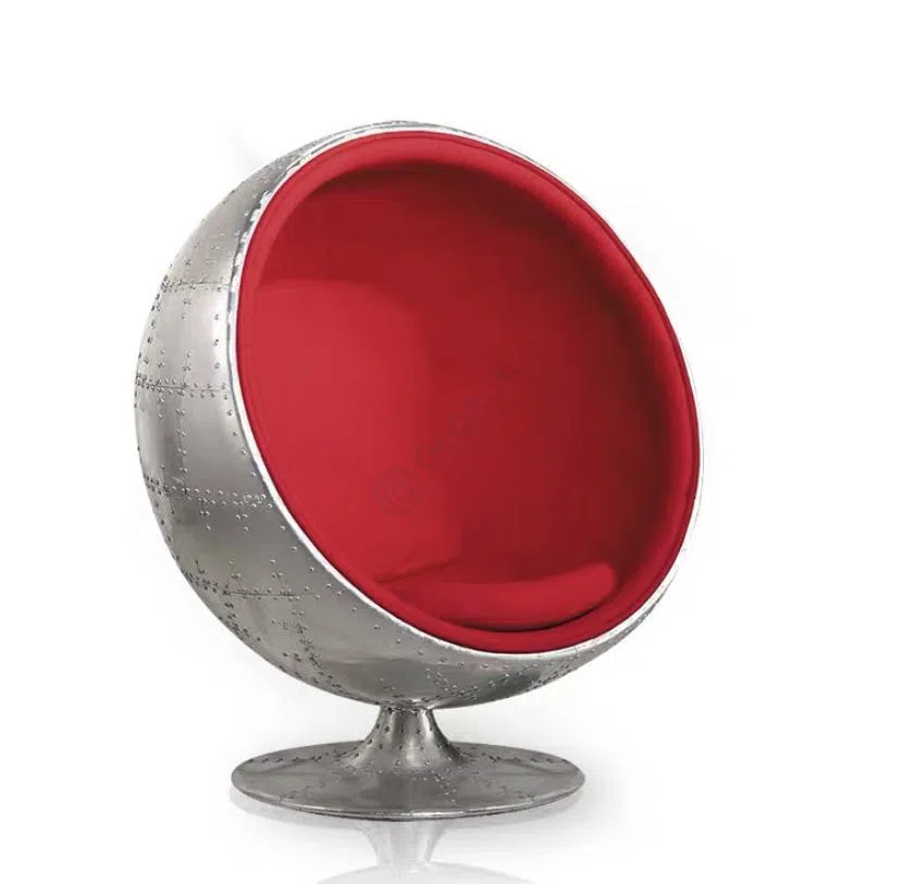 Наружная оболочка кресла выполнена из прочного стеклопластика, облицованного панелями из алюминия. Металлическая поверхность с видимыми заклепками придает изделию брутальный, но при этом утонченный индустриальный облик, идеально вписывающийся в стилистику лофт. Основание обеспечивает устойчивость и гармонично завершает конструкцию.