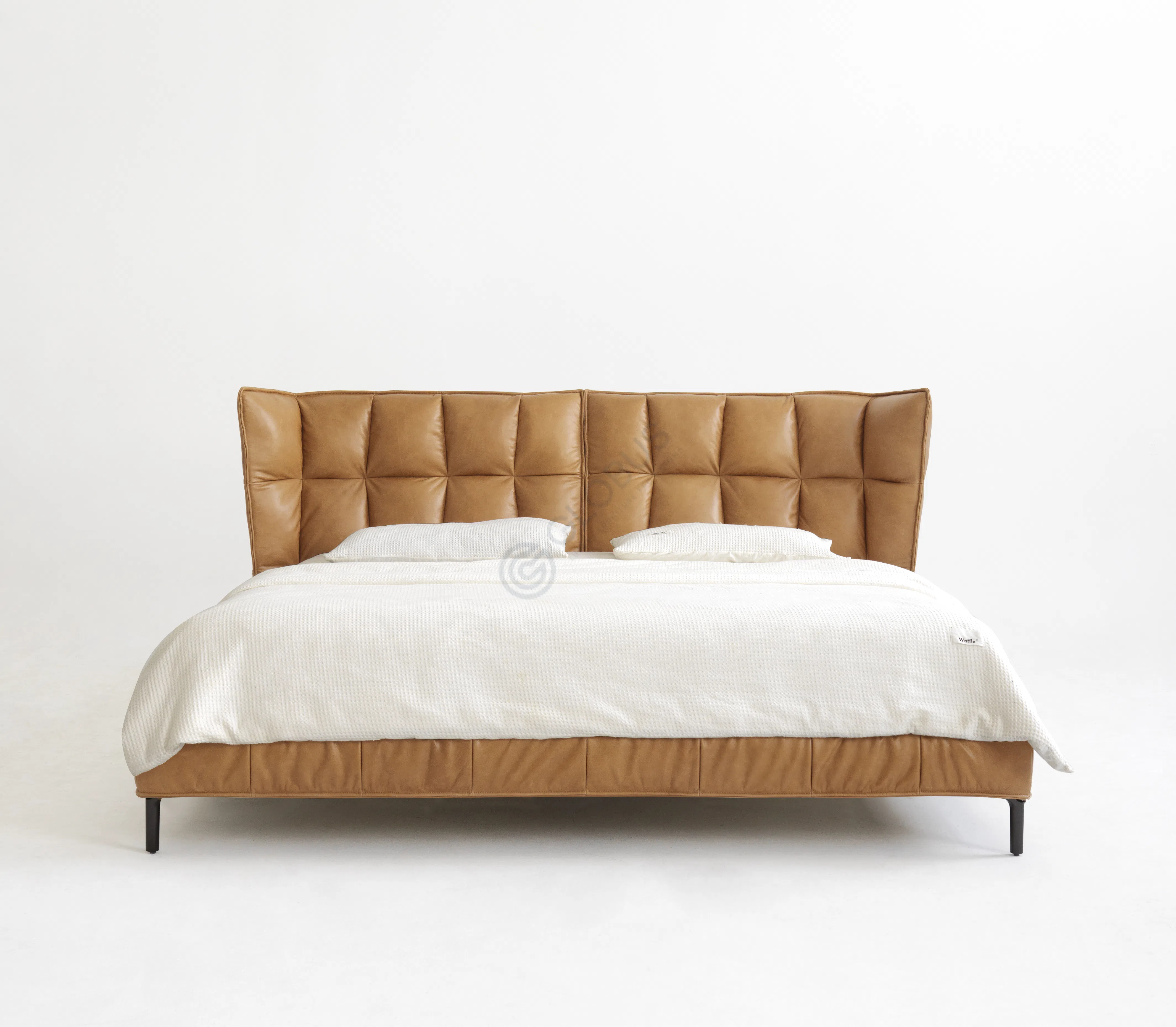 Модель сочетает лаконичный современный профиль с теплым текстильным покрытием в оттенке коньяка и аккуратной строчкой в виде квадратной сетки. Каркас выполнен из натурального дерева и прочной фанеры, что обеспечивает стойкость и долговечность конструкции.