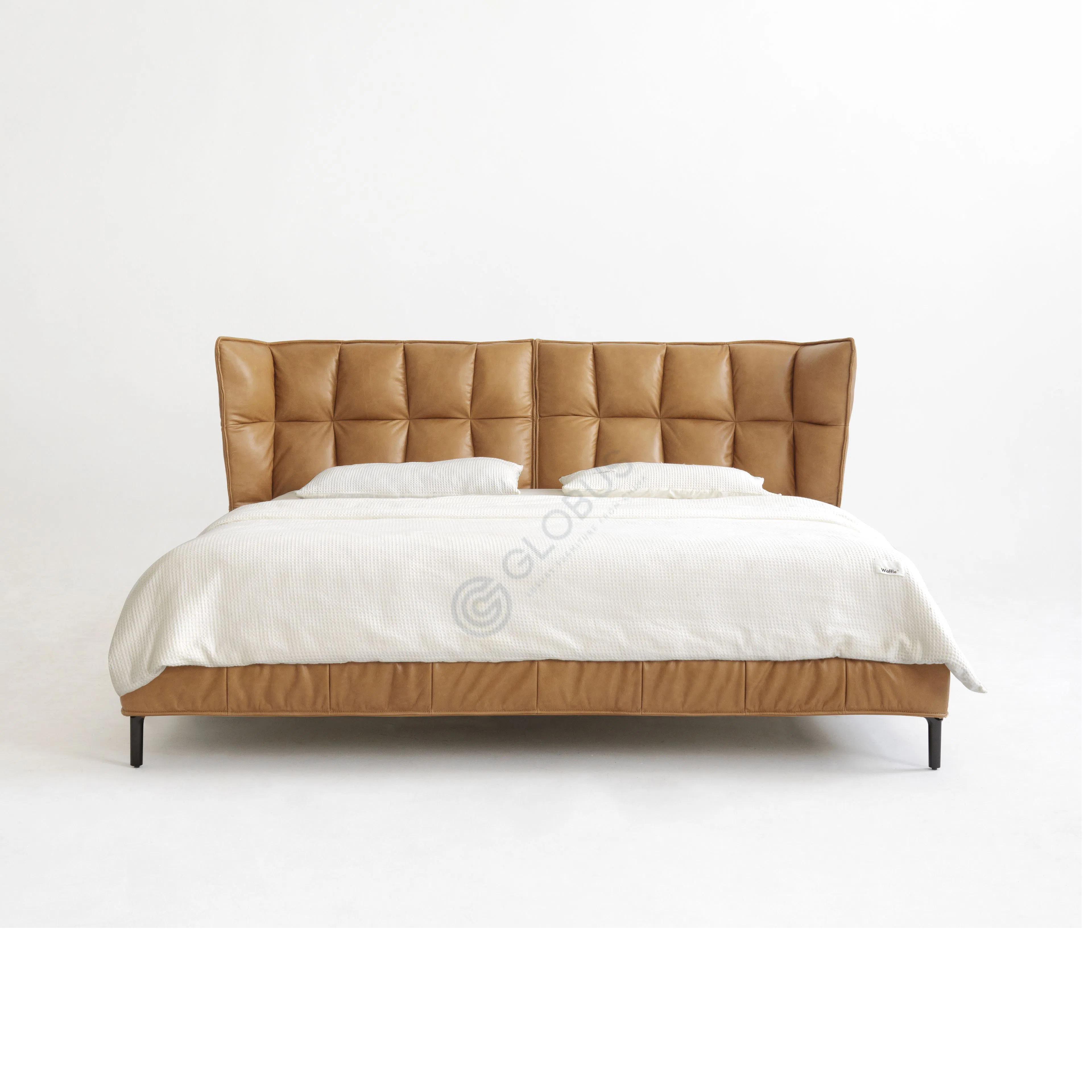 Модель сочетает лаконичный современный профиль с теплым текстильным покрытием в оттенке коньяка и аккуратной строчкой в виде квадратной сетки. Каркас выполнен из натурального дерева и прочной фанеры, что обеспечивает стойкость и долговечность конструкции.