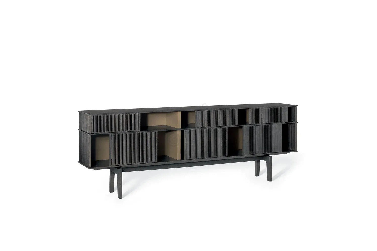 Стеллаж сочетает выразительную геометрию линий с современным подходом к оформлению пространства. Каркас выполнен из нержавеющей стали и дополнен натуральным шпоном, что подчеркивает благородство материала. Акцентные вертикали и горизонтали кажутся легкими, но придают общей конструкции устойчивость и функциональность.