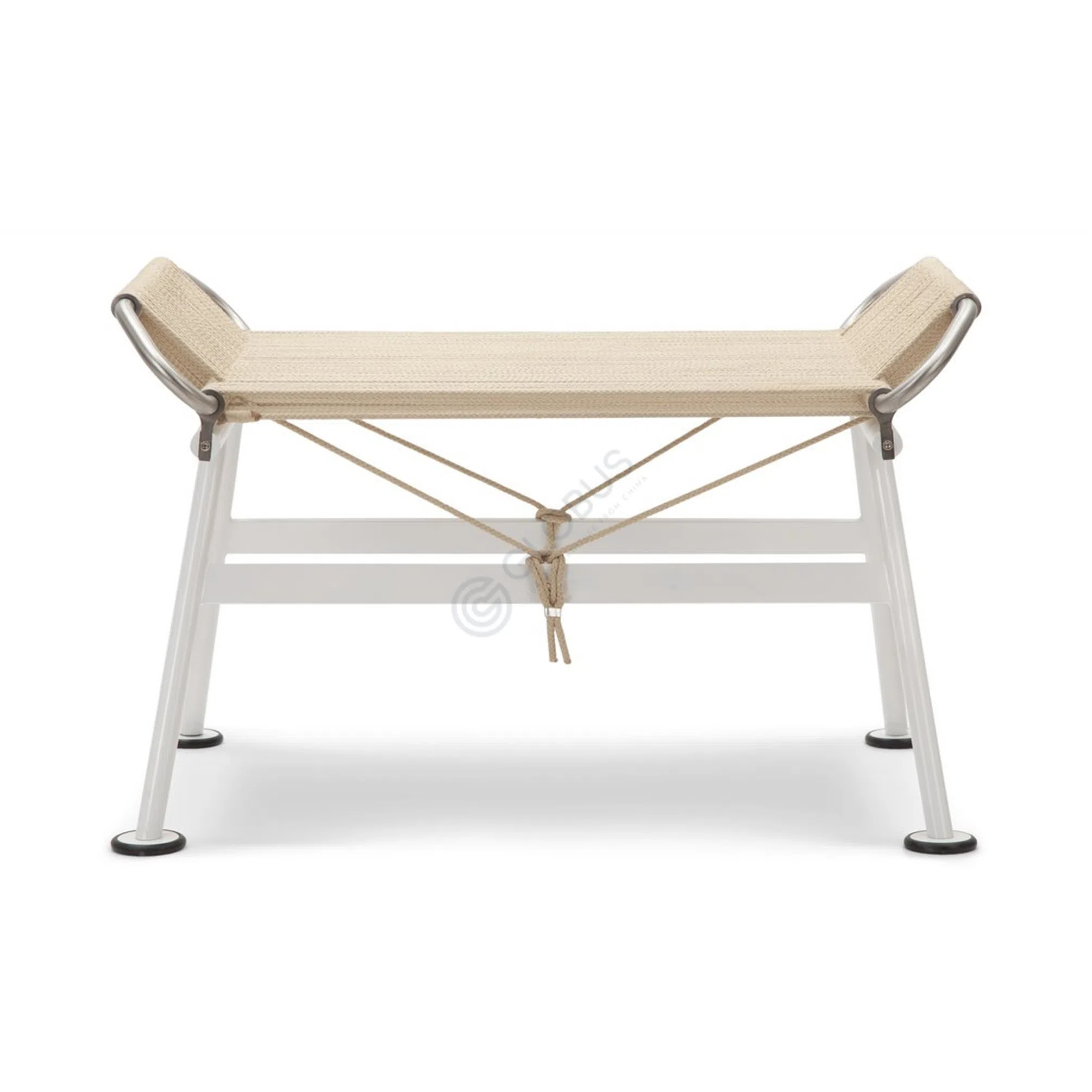 Основой служит прочный каркас из нержавеющей стали, чье изящное блестящее покрытие подчеркивает минималистичную эстетику предмета. На эту надежную конструкцию деликатно натянуто полотно из сплетенной веревки и льна. Его натуральные волокна обеспечивают не только прочность, но и приятную на ощупь поверхность, а также способствуют естественной циркуляции воздуха.