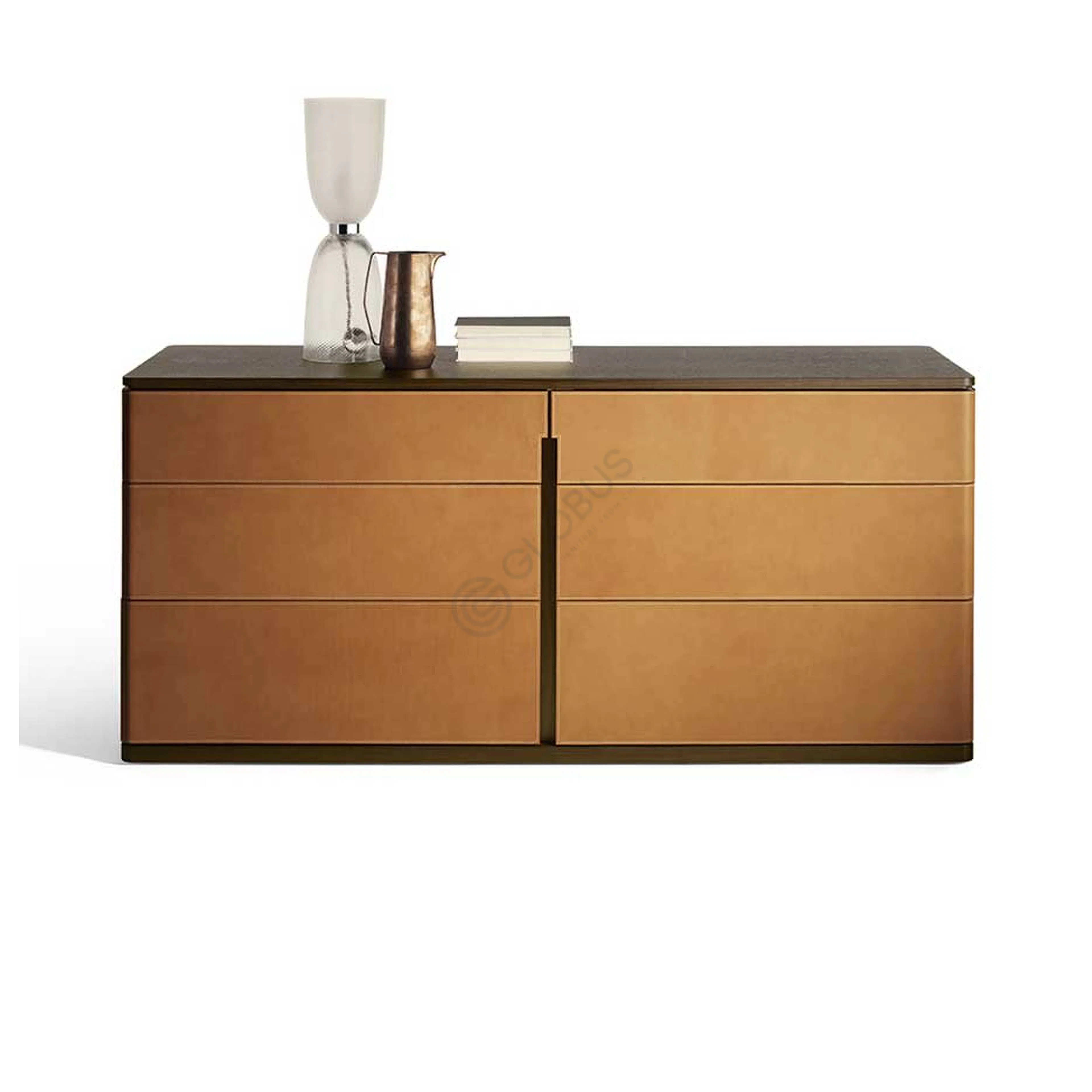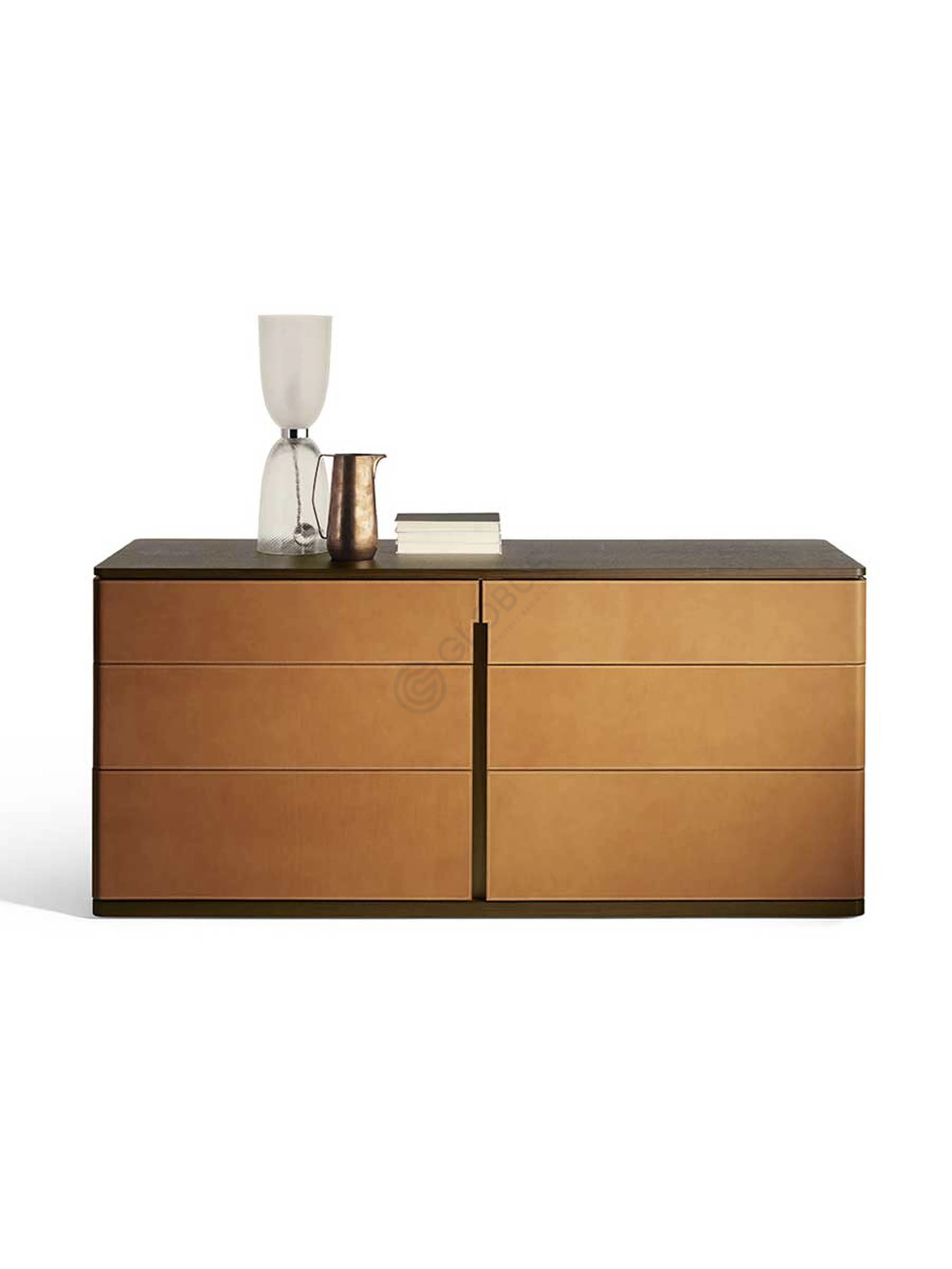 Корпус изготовлен из натурального дерева и МДФ, покрыт шпоном, а фасады декорированы шорно-седельной кожей приятного оттенка. Мягкие формы и округлые края делают этот предмет меблировки удобным в ежедневном использовании, а нейтральная гамма удачно сочетается с различными цветами интерьера.