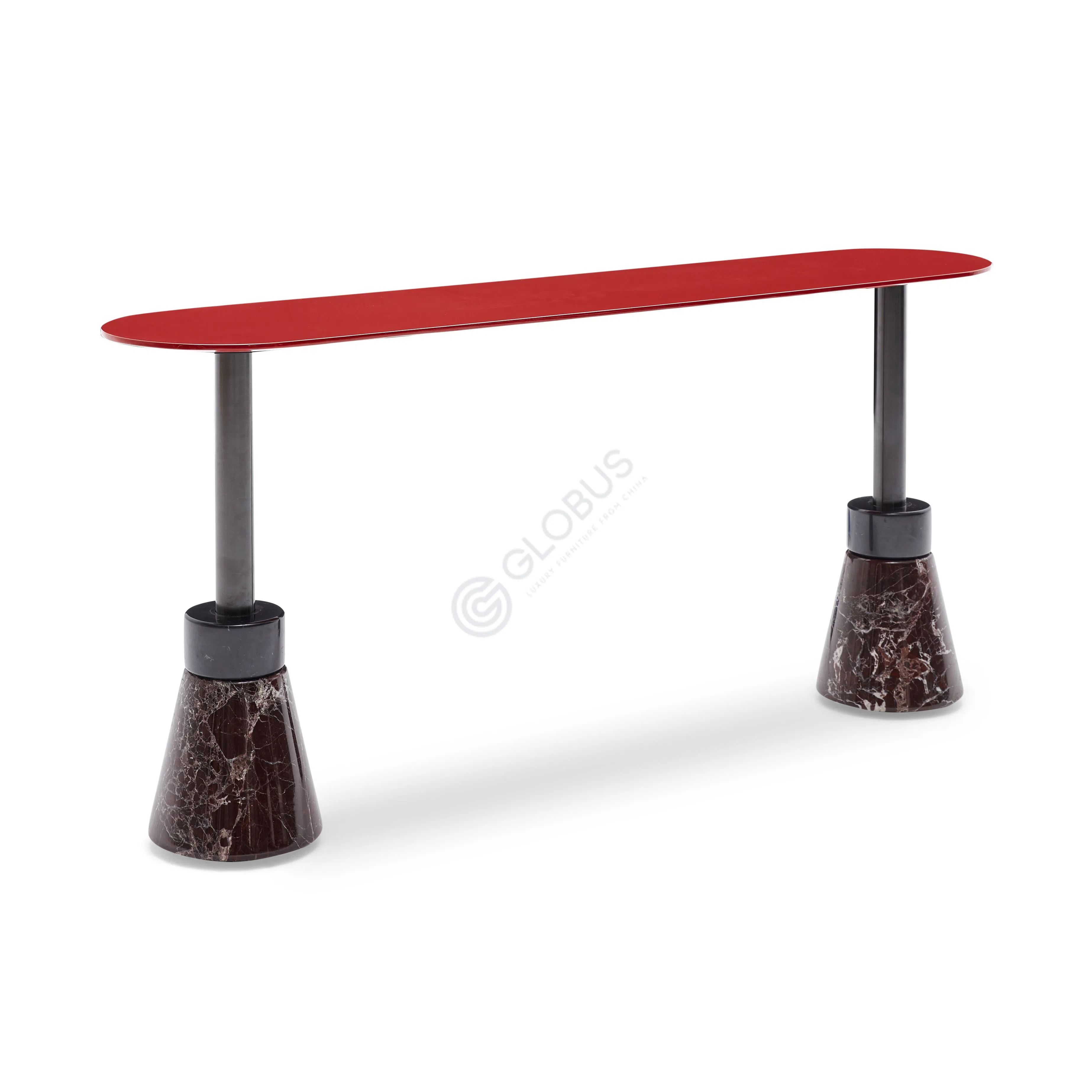 Столешница изготовлена из МДФ с износостойким матовым покрытием, раскрывающим глубокий оттенок. Тонкий стержень из нержавеющей стали служит прочным связующим элементом между верхом и основанием. Коническое основание выполнено из натурального мрамора, привнося текстурное разнообразие и солидность.